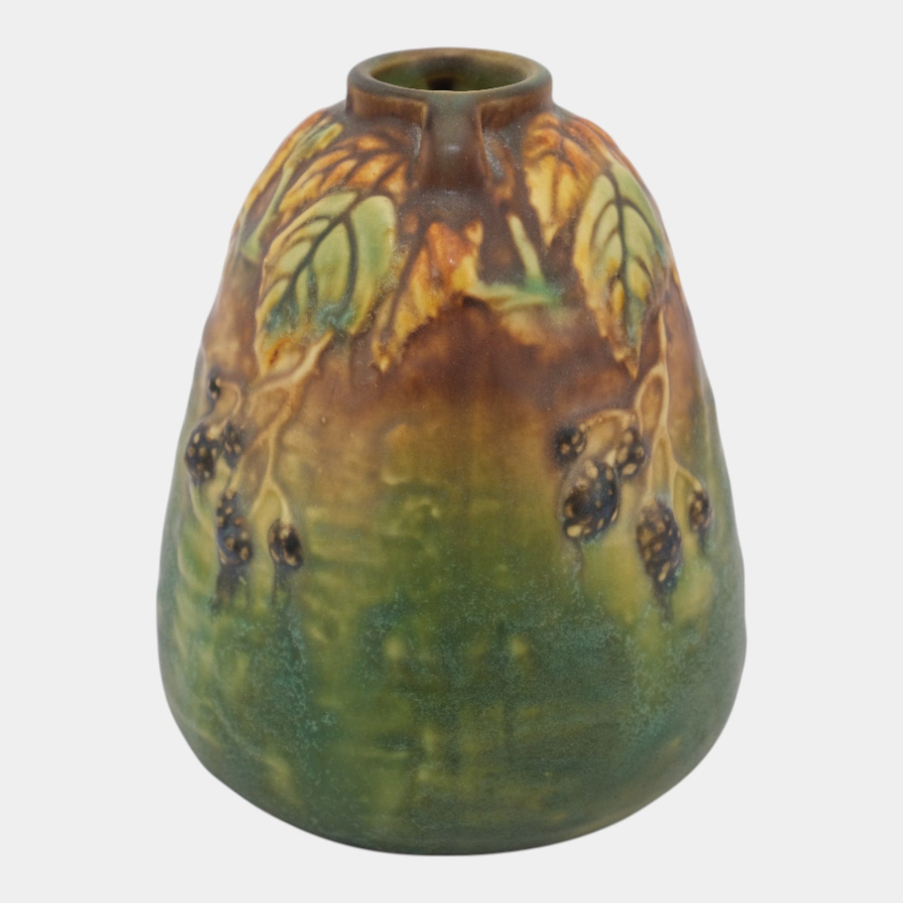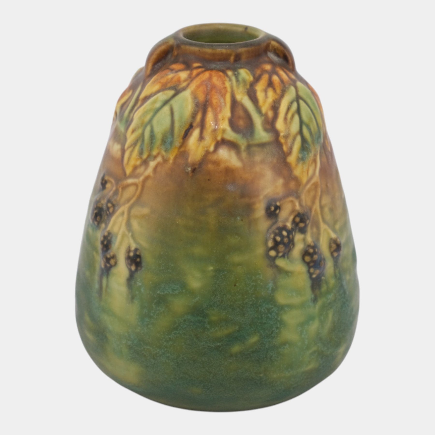 • Richly modeled and naturally expressive, this Arts & Crafts–style Roseville Blackberry vase features a softly tapered form adorned with raised blackberry clusters and foliage, finished in blended green, amber, and brown glazes with earthy depth and organic charm.