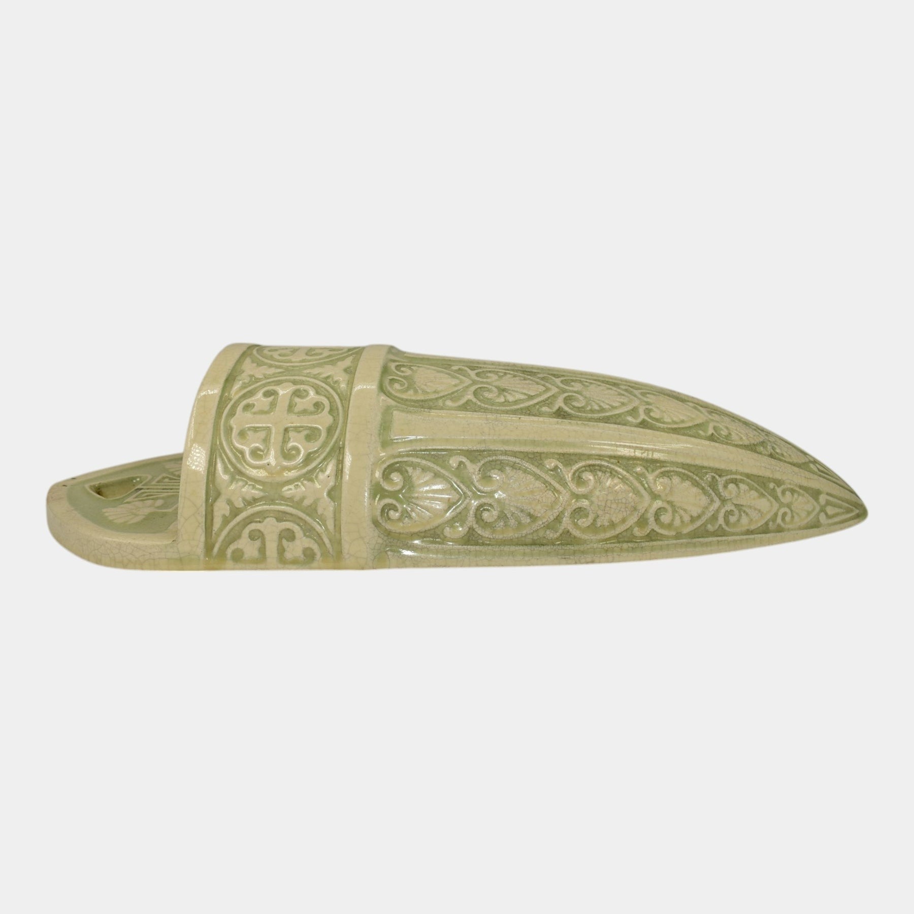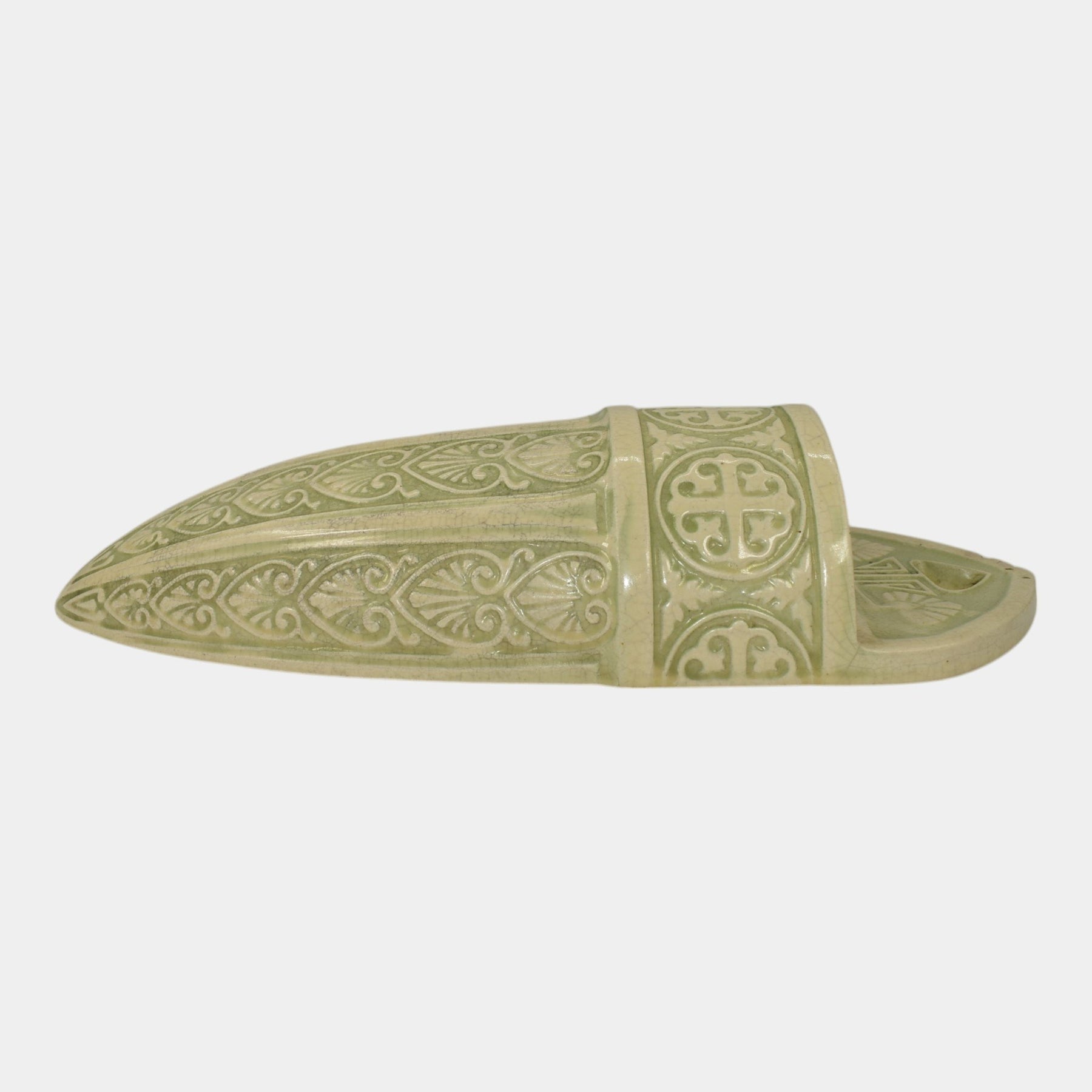 • Rarely seen and large, decorative ivory wall pocket with green glaze accents.