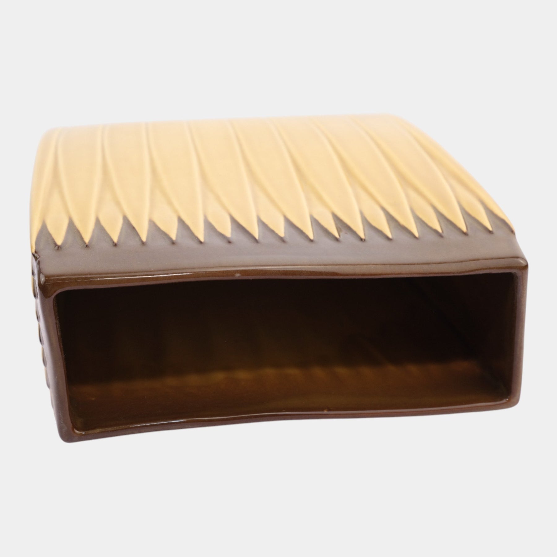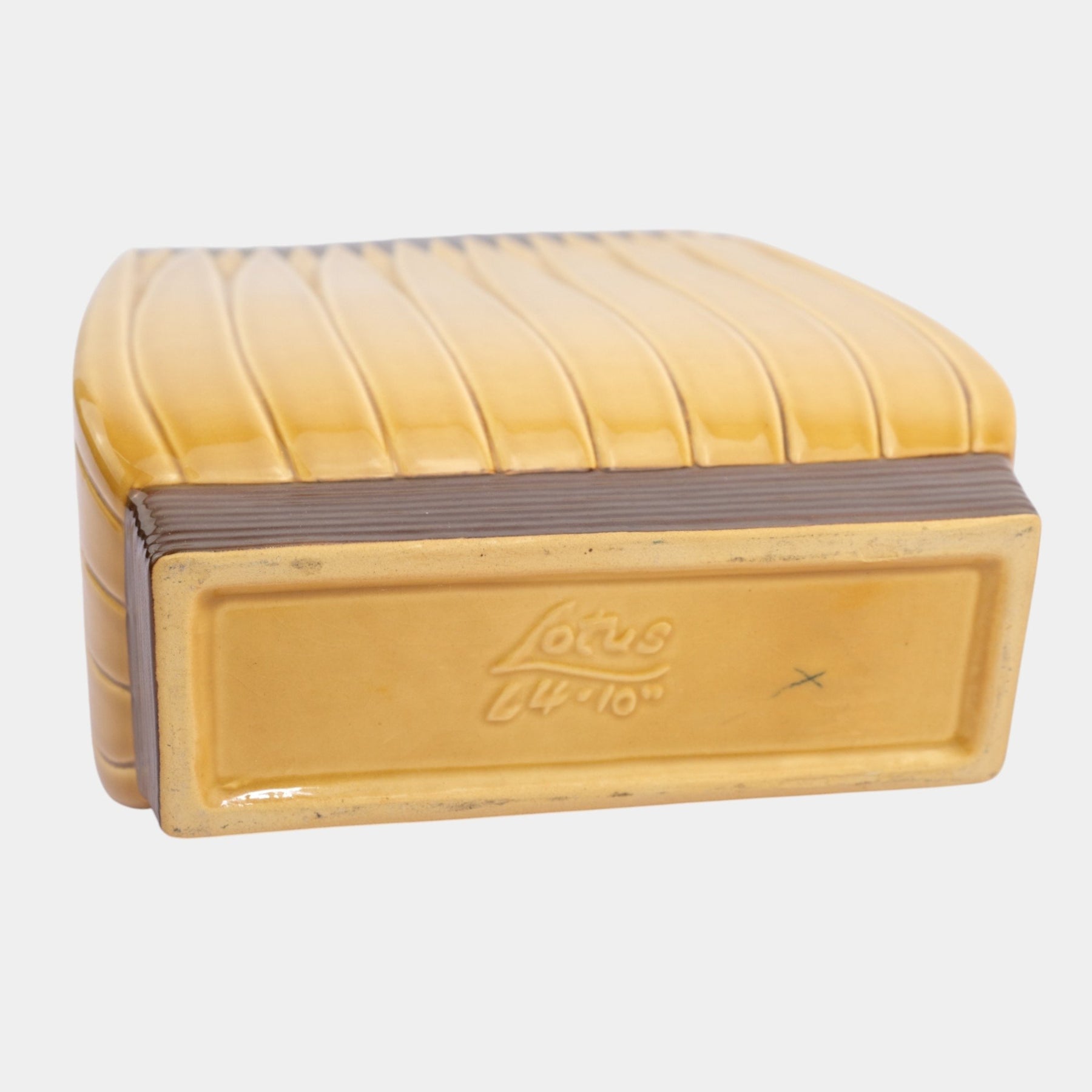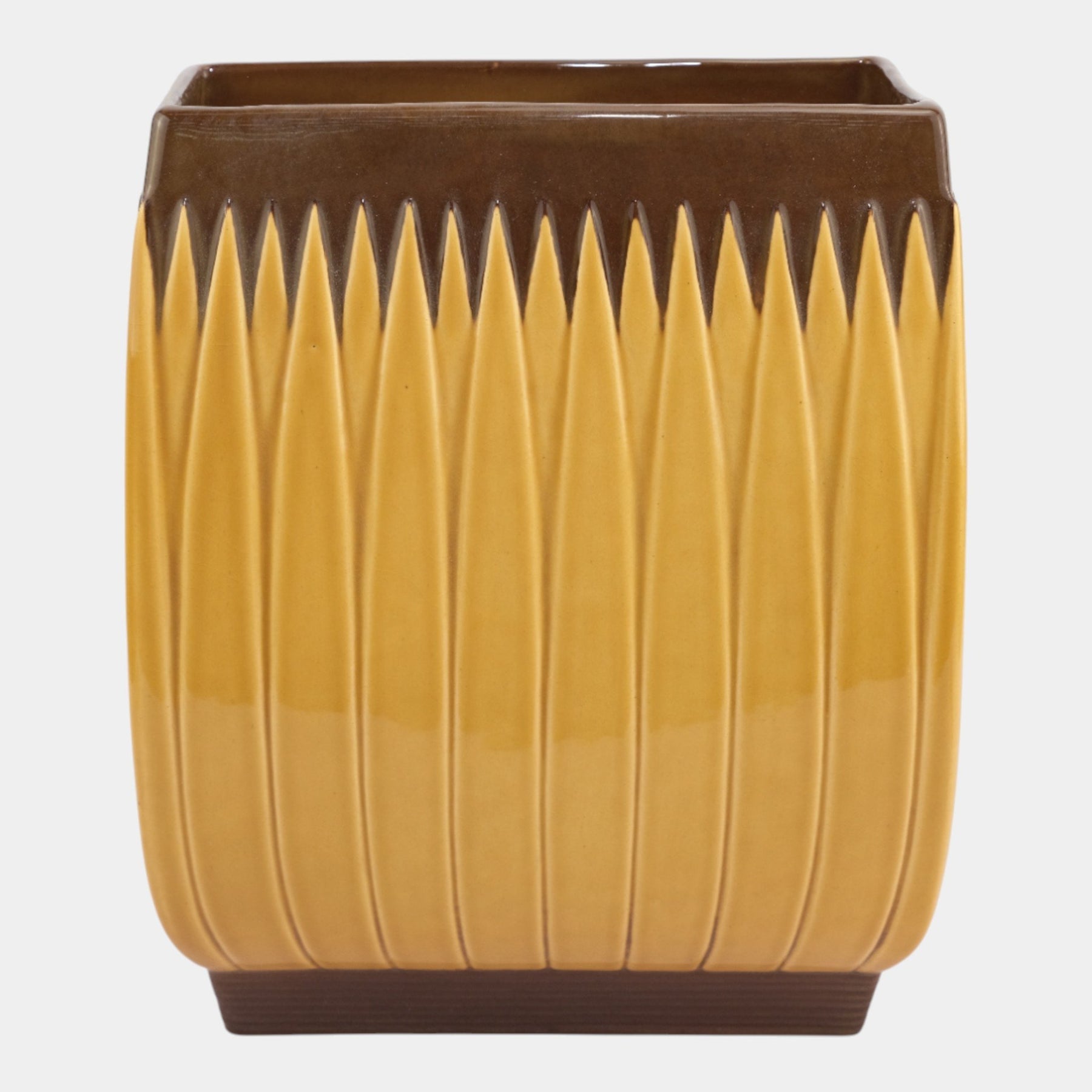 • Crisply geometric and vibrantly glazed, this Mid Century Modern Roseville Lotus vase features a rectangular form with vertical ribbing and pointed lotus motifs, finished in a soft yellow ground capped by brown accents for striking contrast.