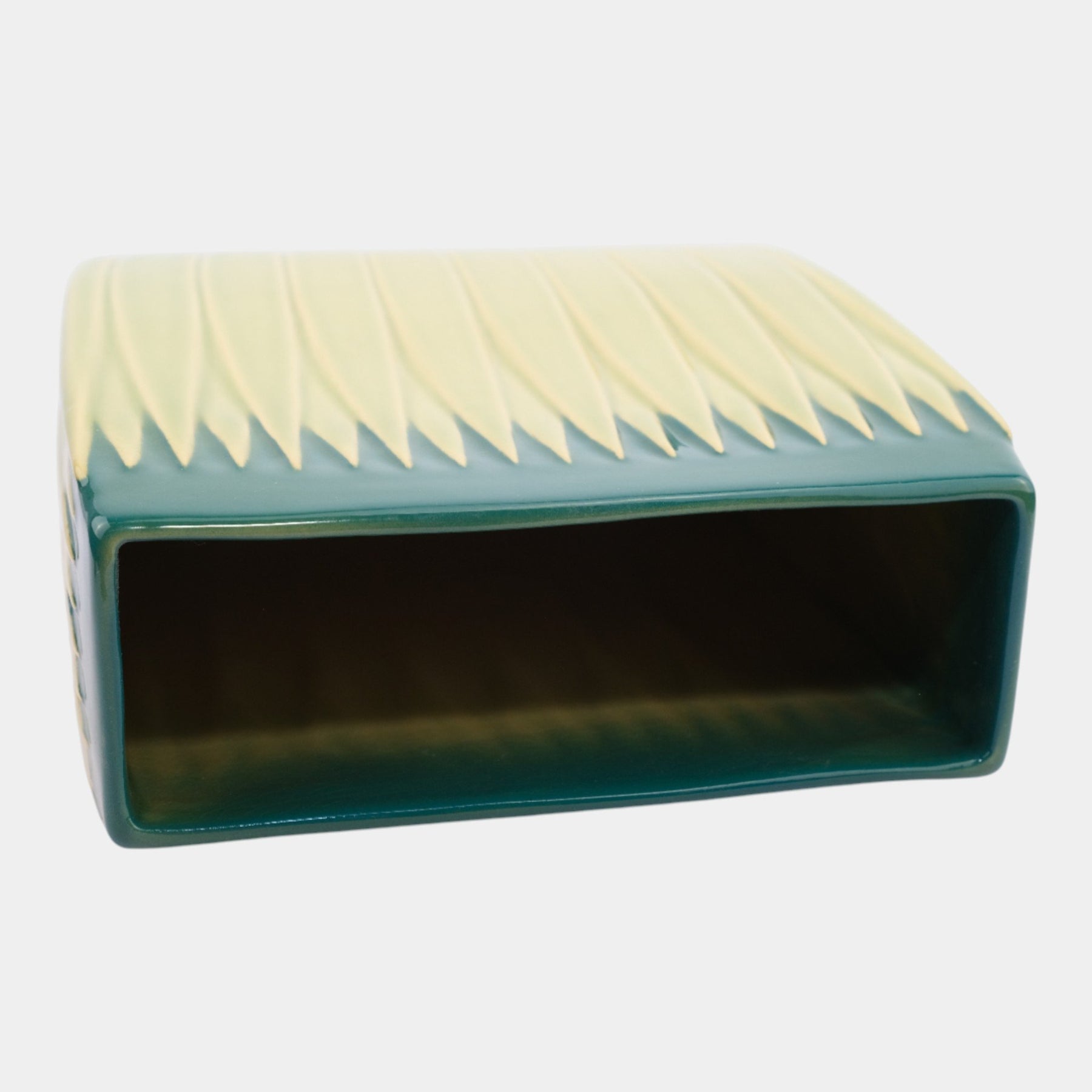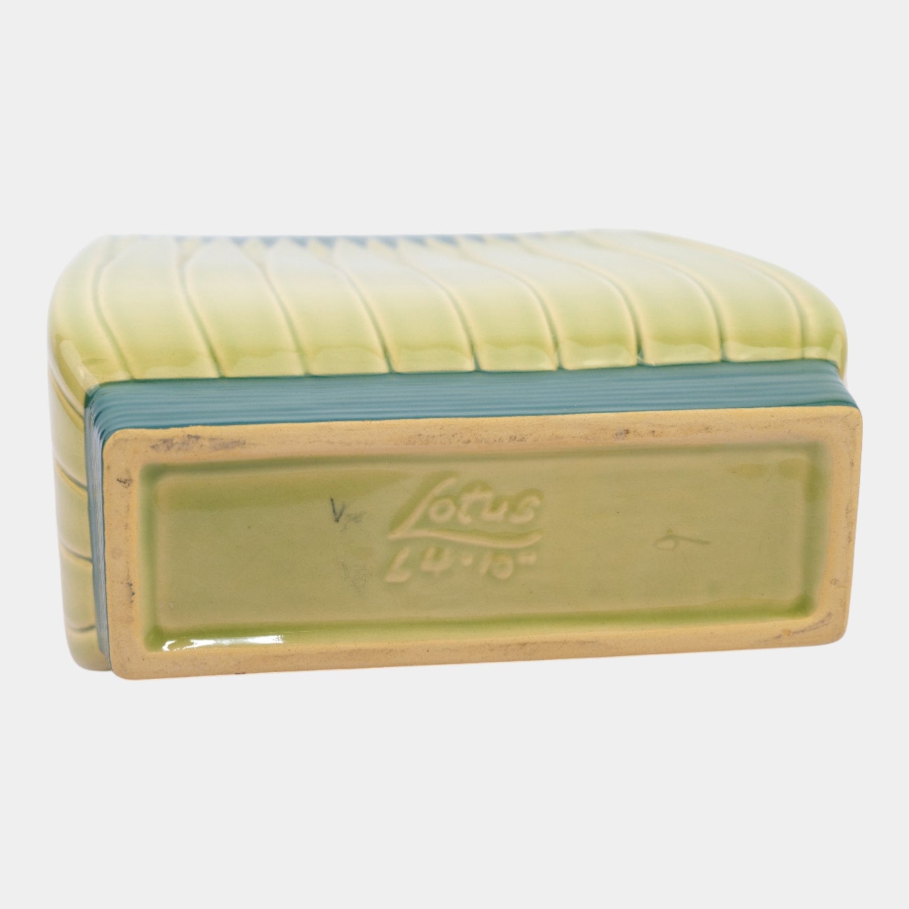 • Crisply geometric and vibrantly glazed, this Mid Century Modern Roseville Lotus vase features a rectangular form with vertical ribbing and pointed lotus motifs, finished in a soft yellow ground capped by deep green accents for striking contrast.