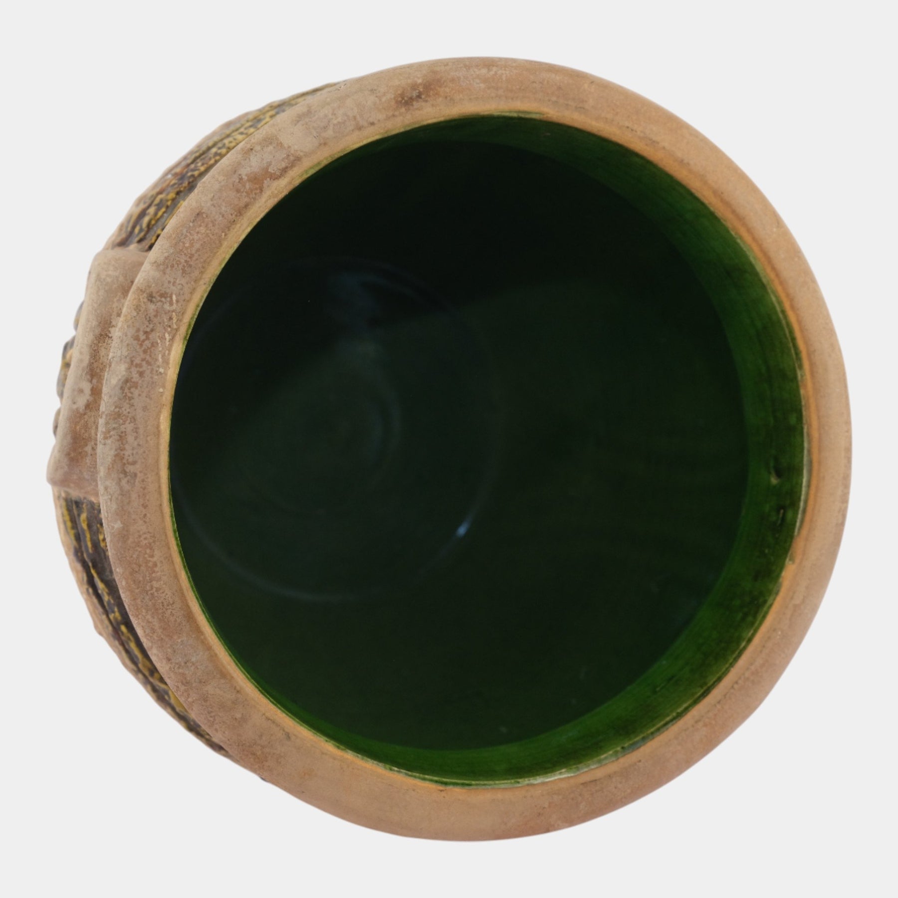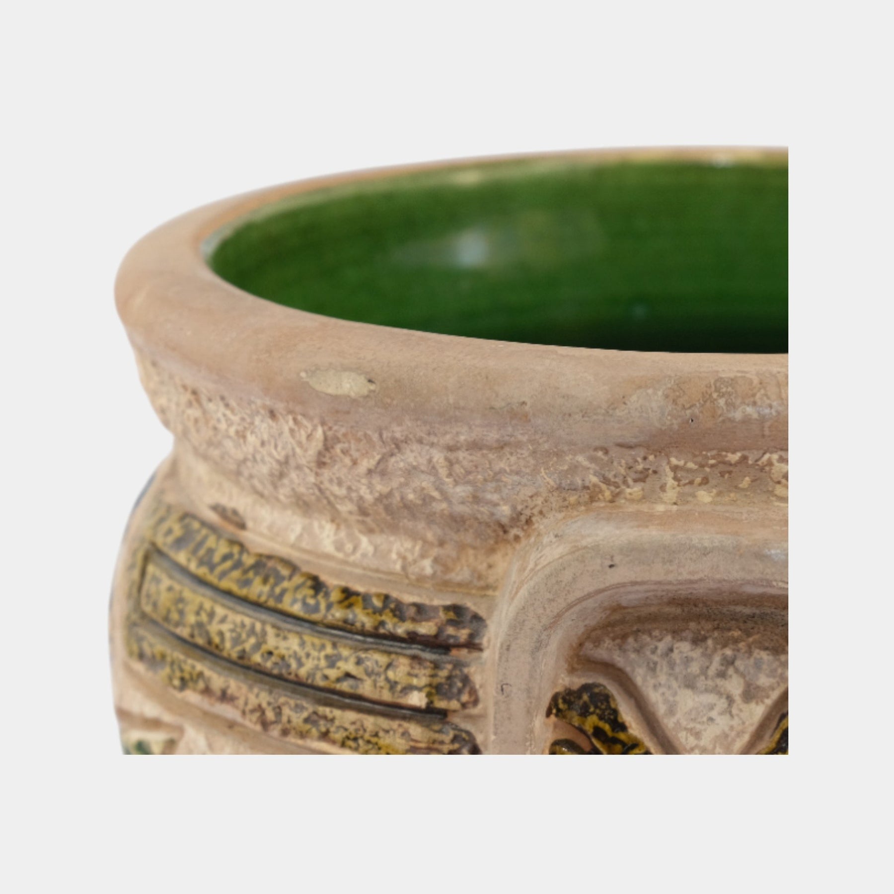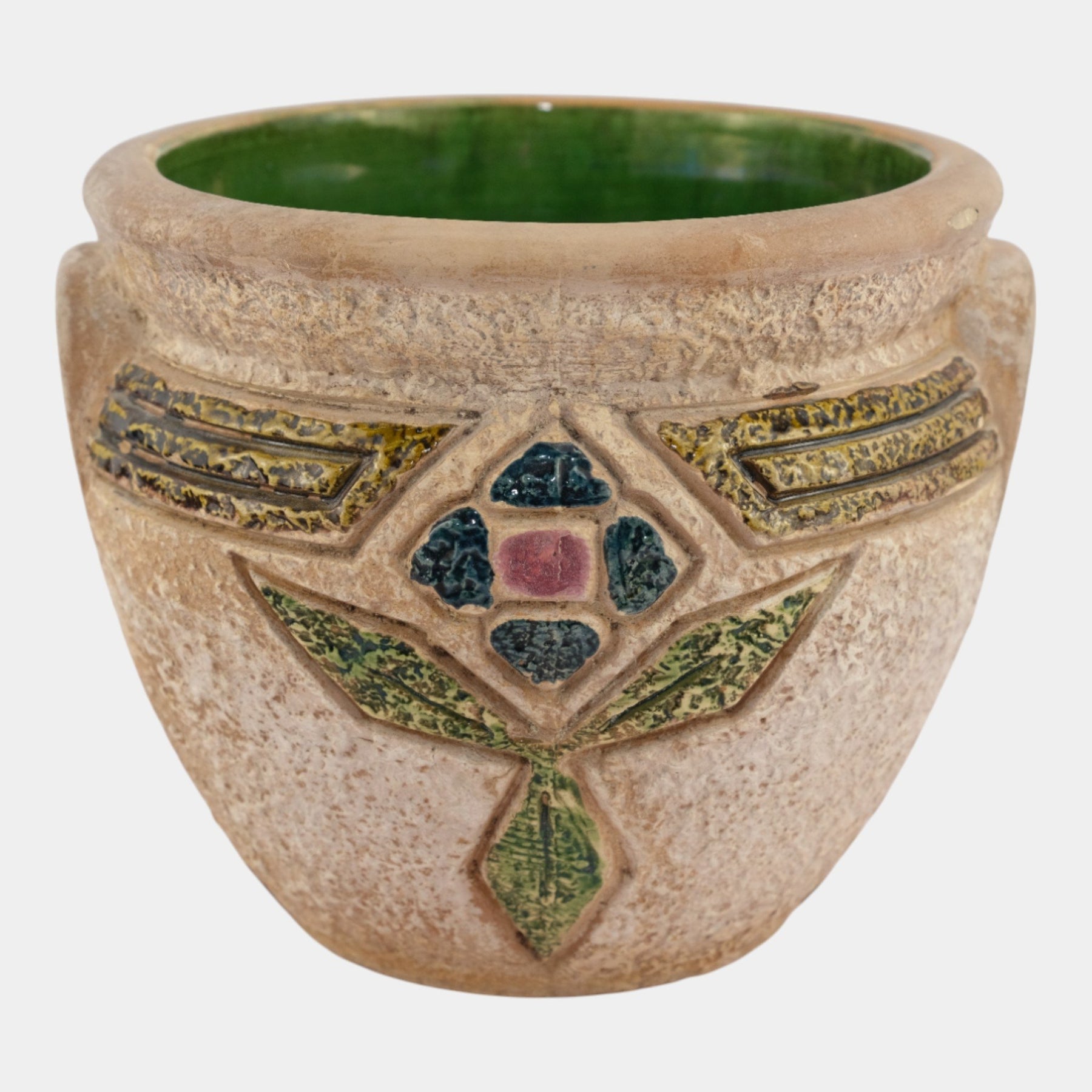 • Great and large arts and crafts jardiniere with striking mold and super color.