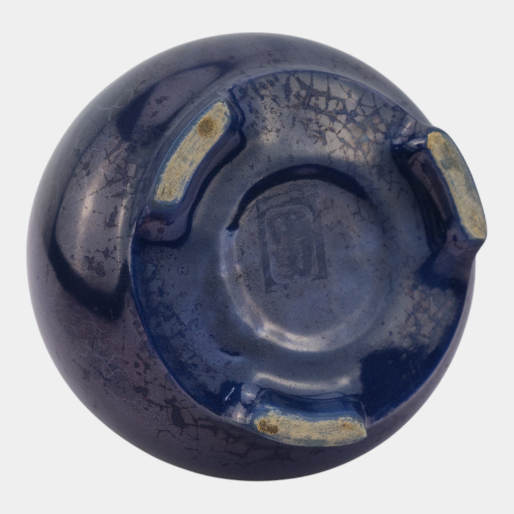 • Deeply lustrous and subtly textured, this Arts & Crafts Roseville Pauleo vase features a rounded gourd form with small footed base and narrow neck, finished in rich matte blue glaze with softly crackled surface character.