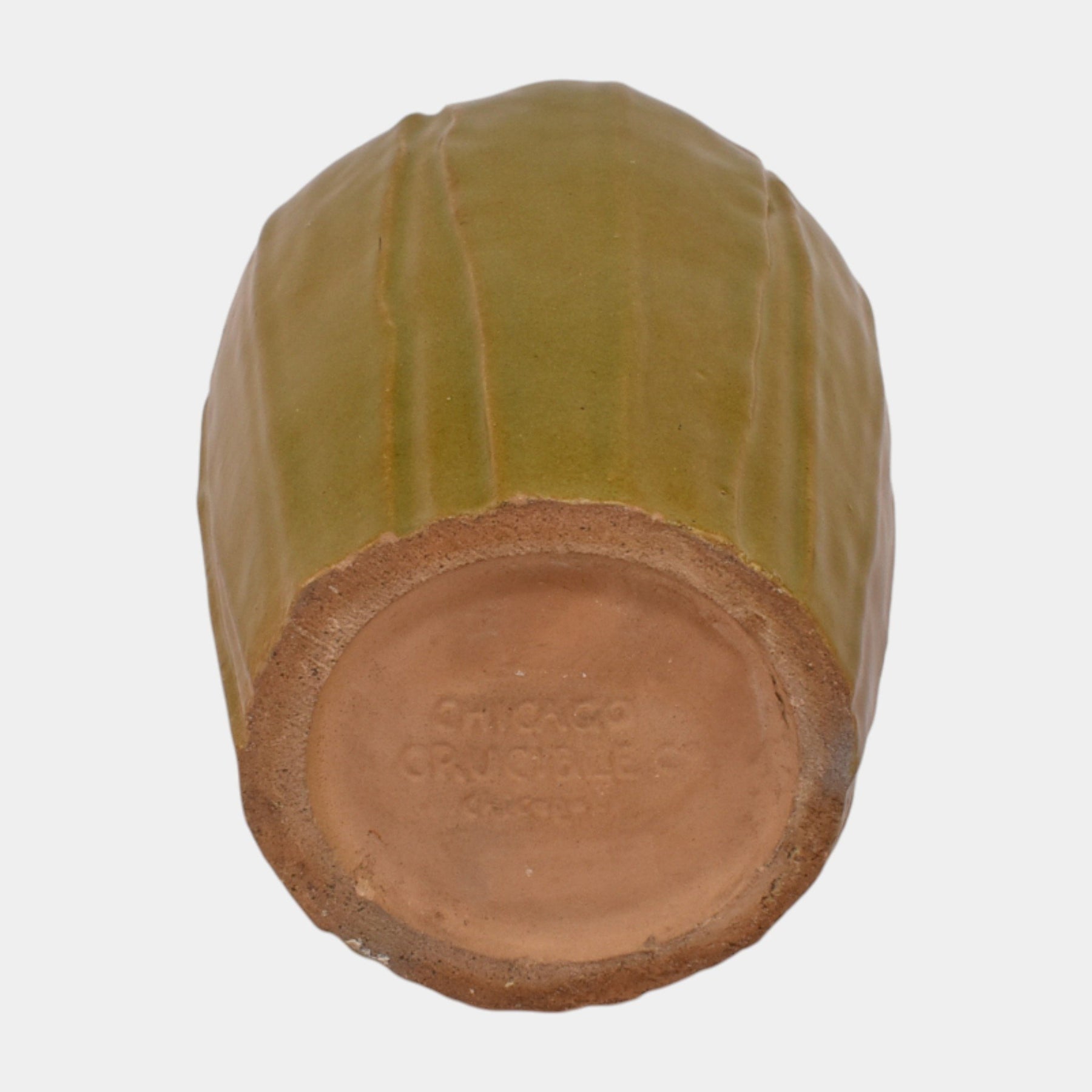 • Earthy and softly textured, this Chicago Crucible vase features vertical ribbing flowing from the shoulder, its mossy matte green glaze and sturdy form expressing pure Arts-and-Crafts simplicity.