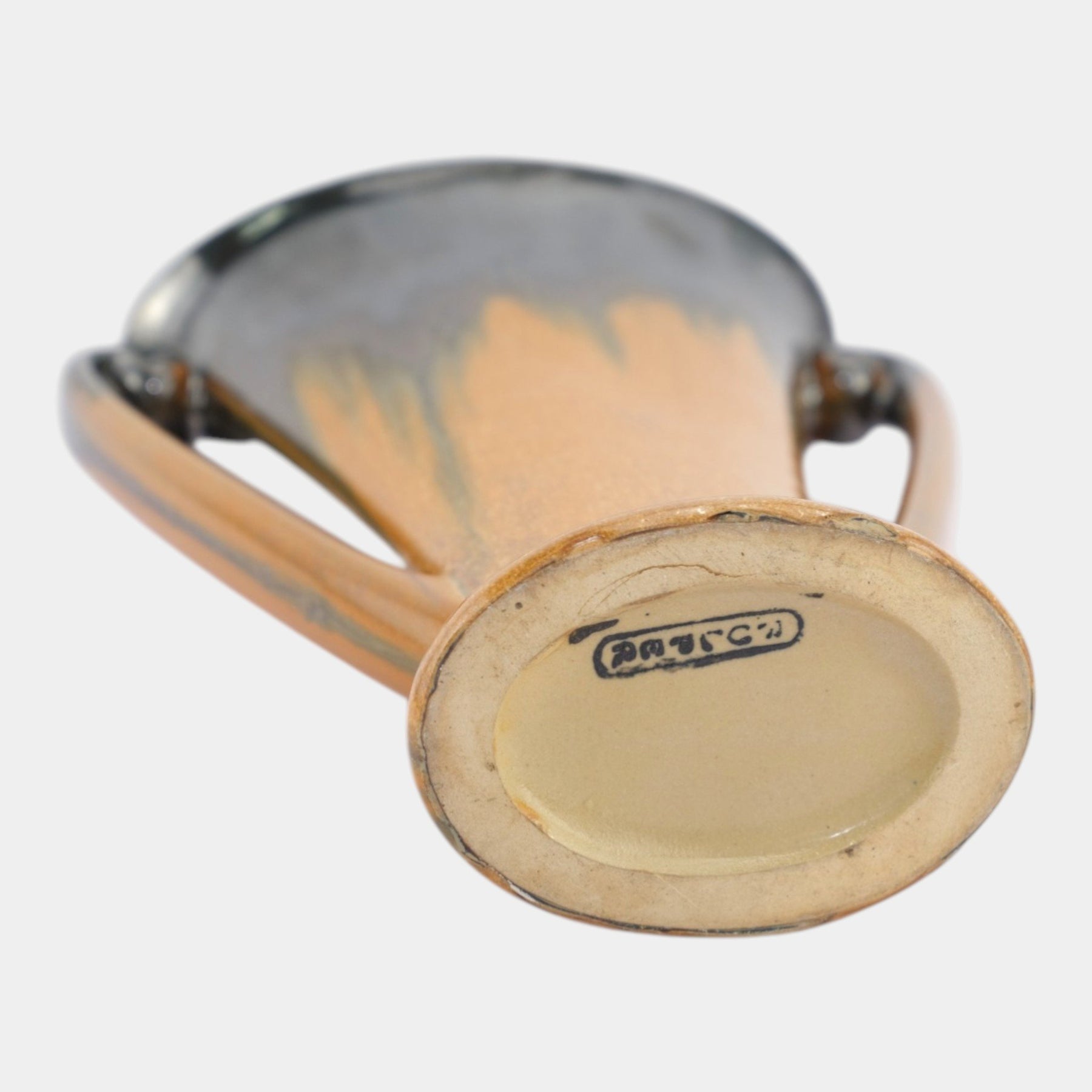 • Dramatically flared two-handled vase with scrolling loop handles, finished in warm brown glaze cascading into deep black at the rim; the bold silhouette and fluid color transitions exemplify the expressive elegance of Arts & Crafts Fulper pottery.