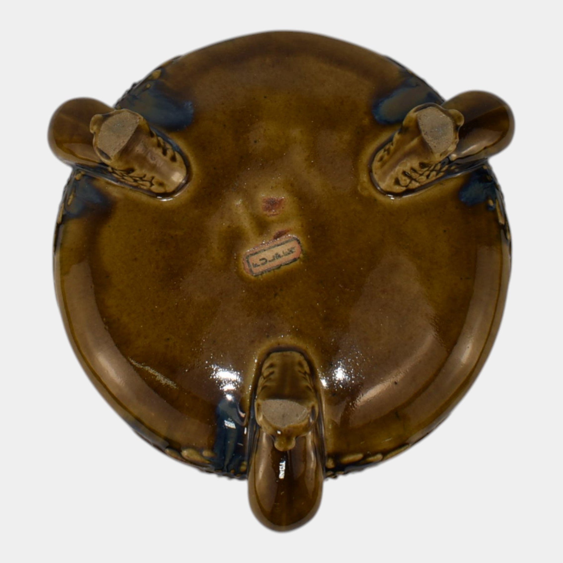 • Striking Fulper Pottery footed bowl, shape 500. This Arts and Crafts era piece features three sculpted ibis bird figures forming the handles and feet, finished in a rich flambé glaze that flows beautifully over the detailed form. A rare and highly collectible example of Fulper’s imaginative sculptural artistry.