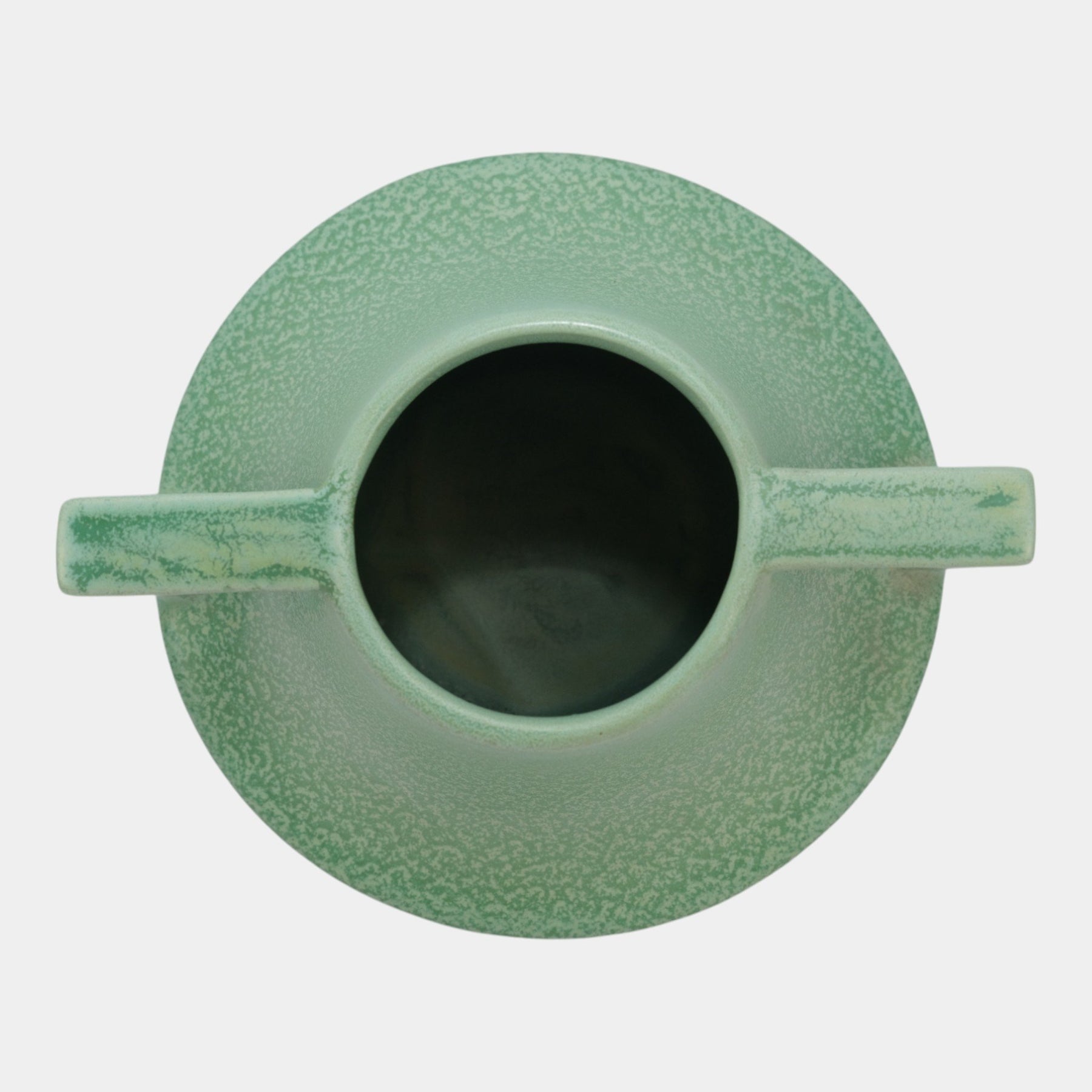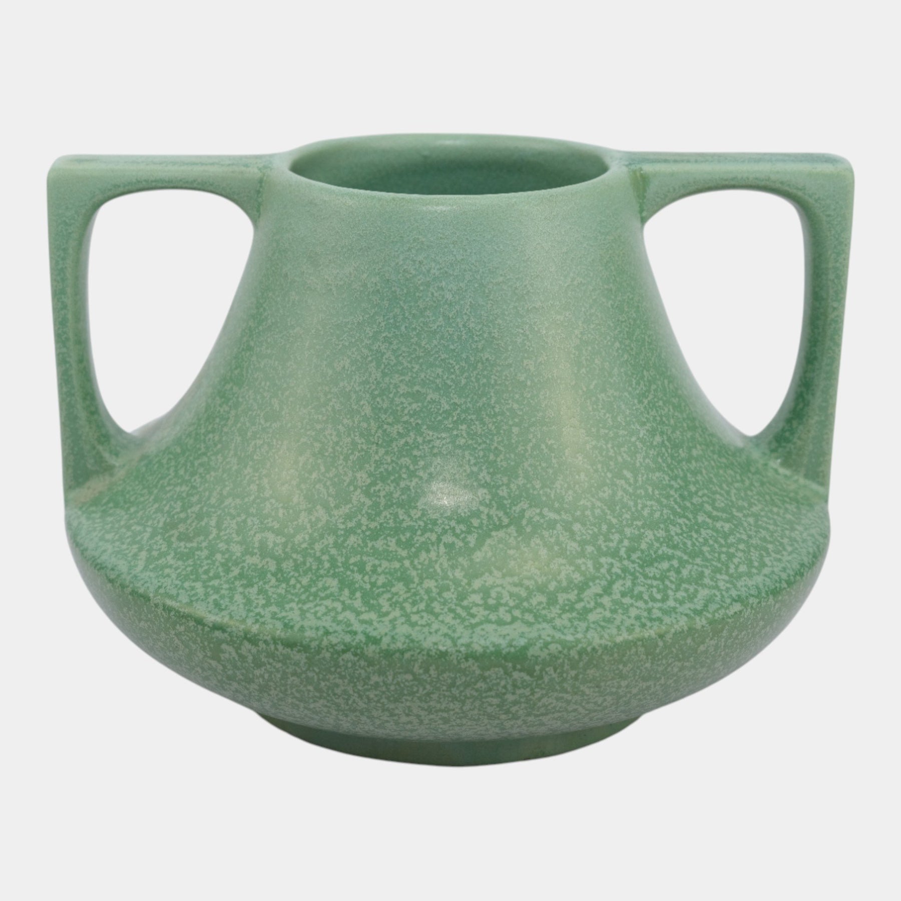 • Graceful and geometric, this Haeger Pottery vase features bold squared handles and a wide flaring form, finished in a soft flowing matte glaze of blue and beige reminiscent of the Arts and Crafts style.