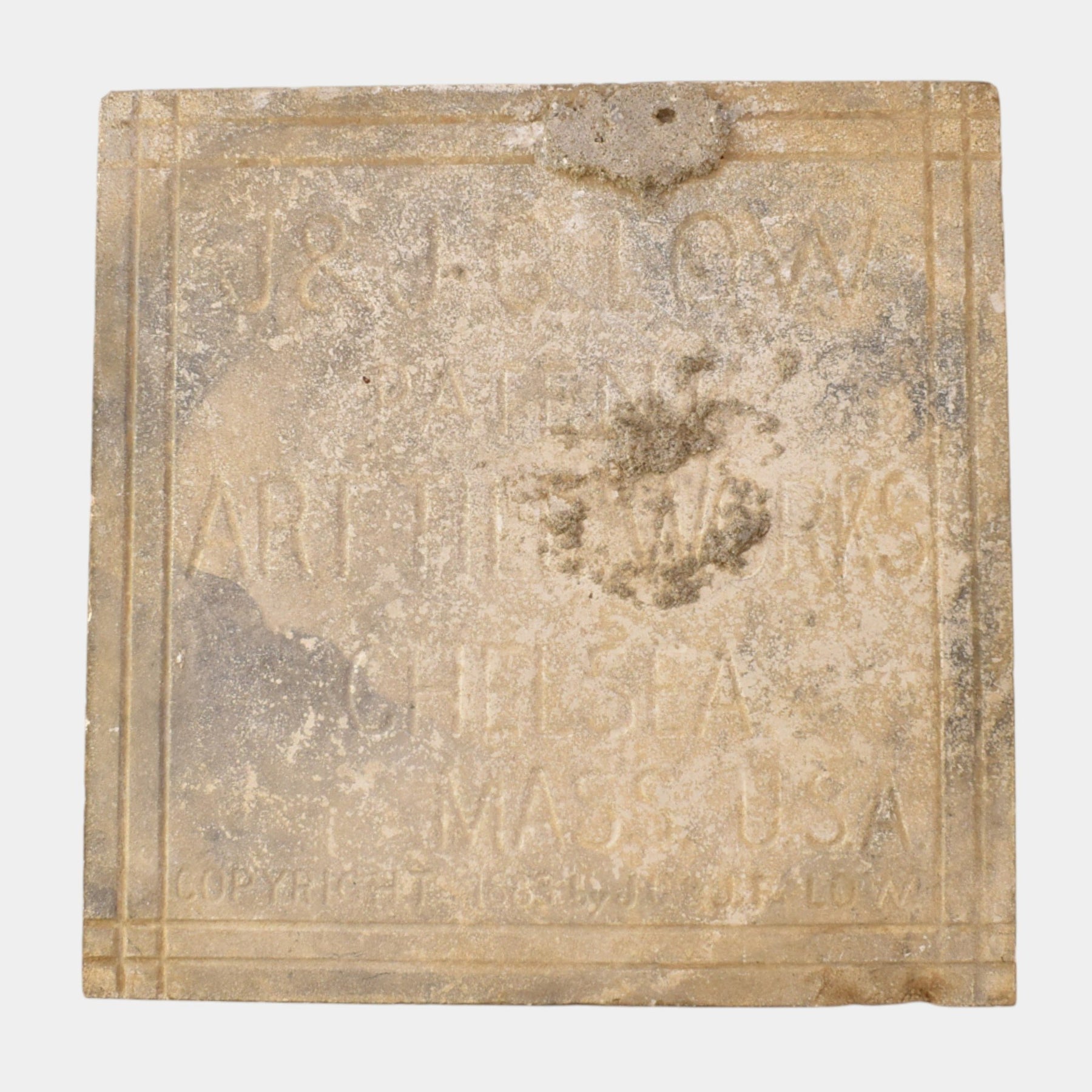 • J. & J.G. Low Art Nouveau embossed tile with scrolling foliate motifs, circular medallions, and rich teal glaze with beautiful pooling. Classic American architectural tile craftsmanship.