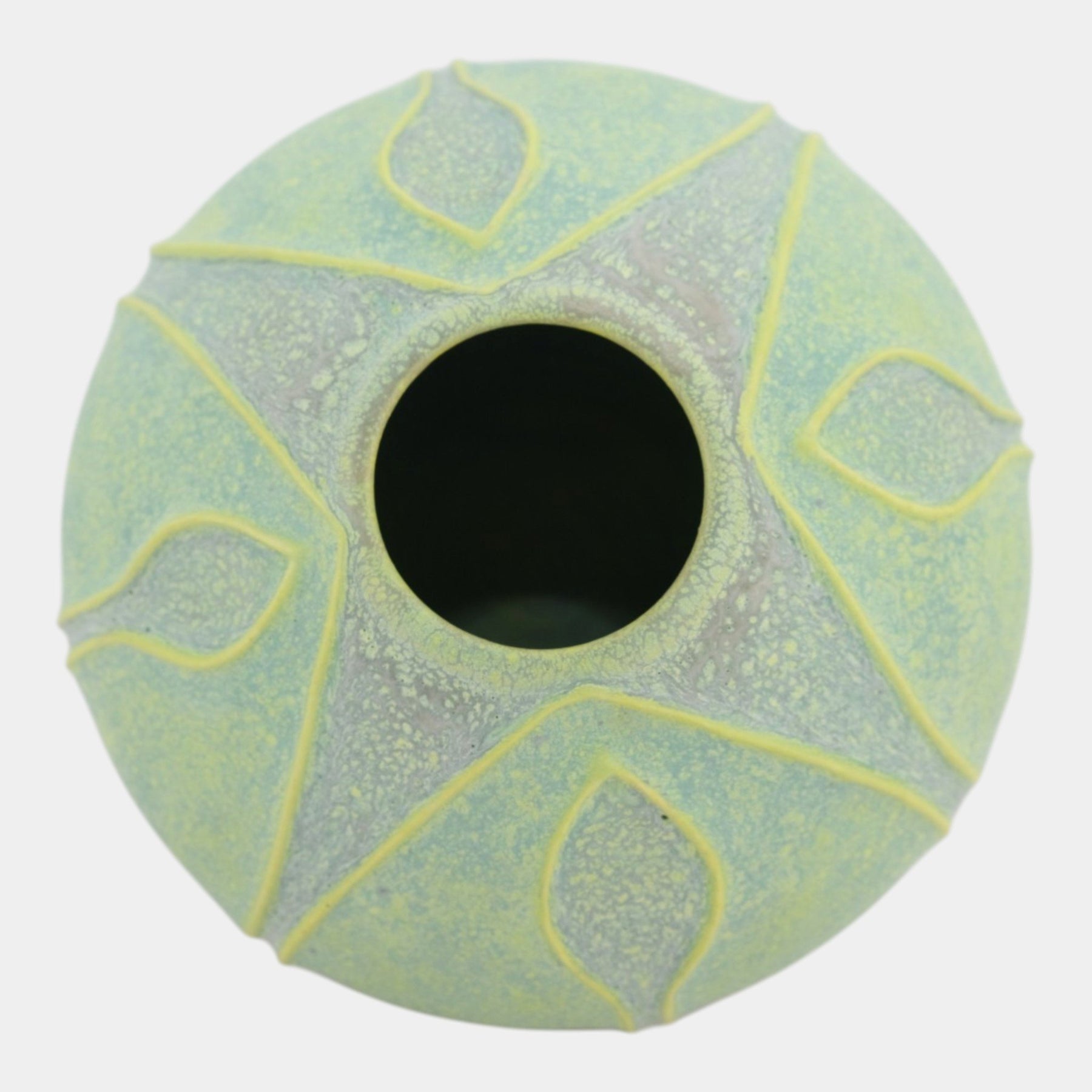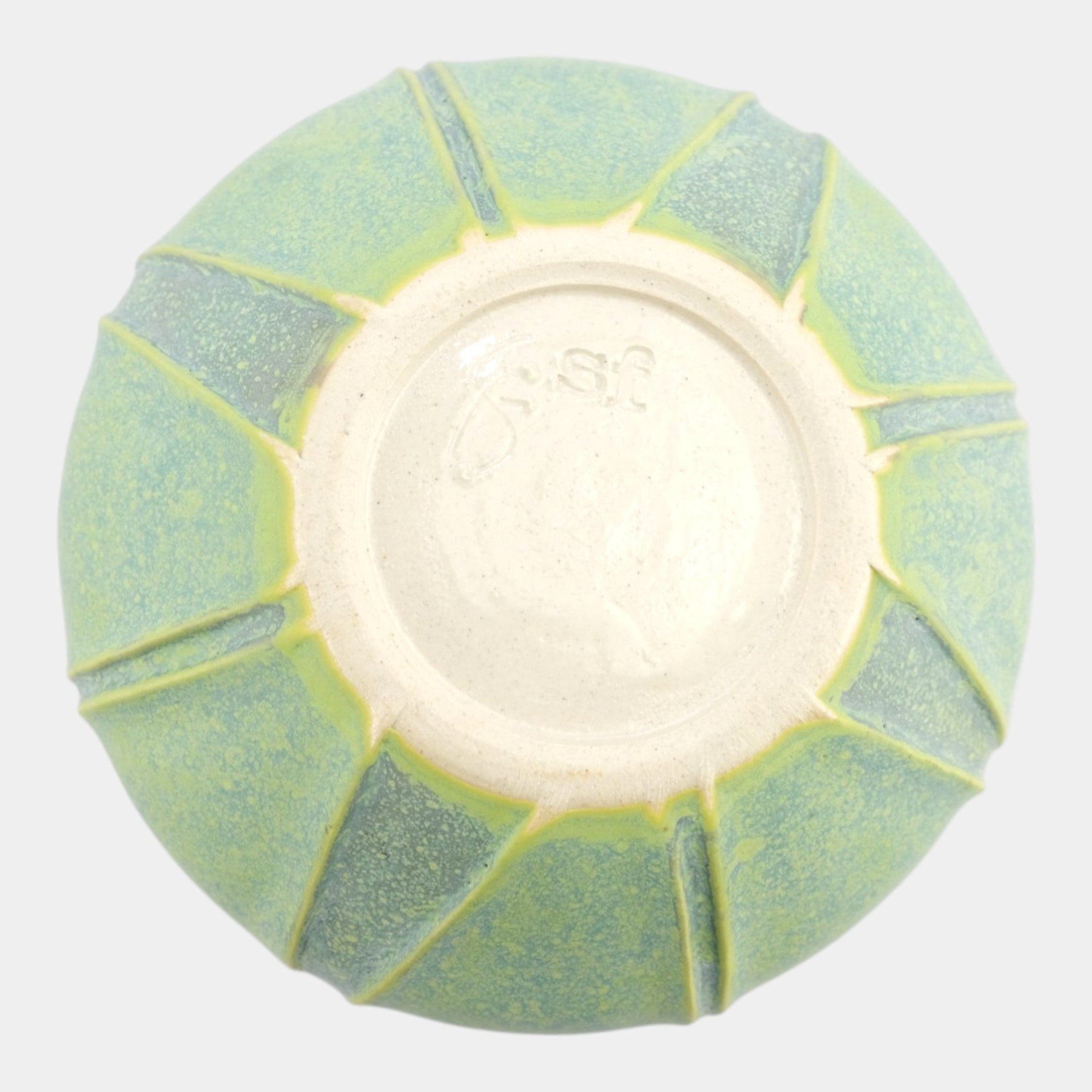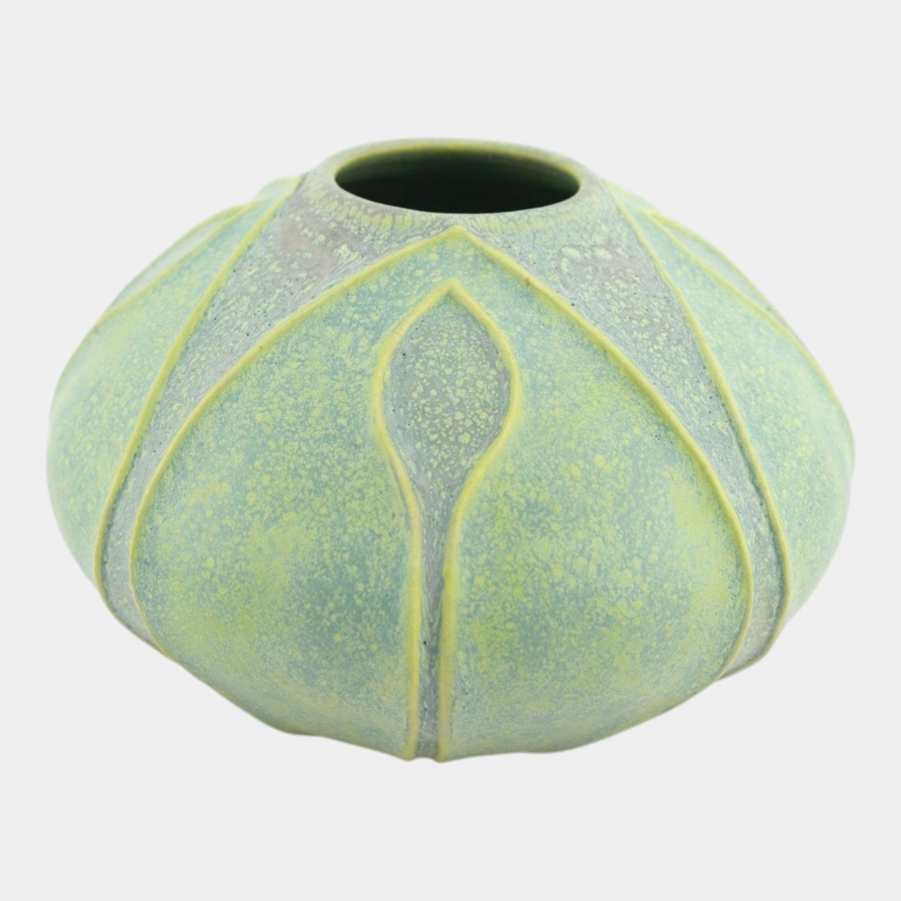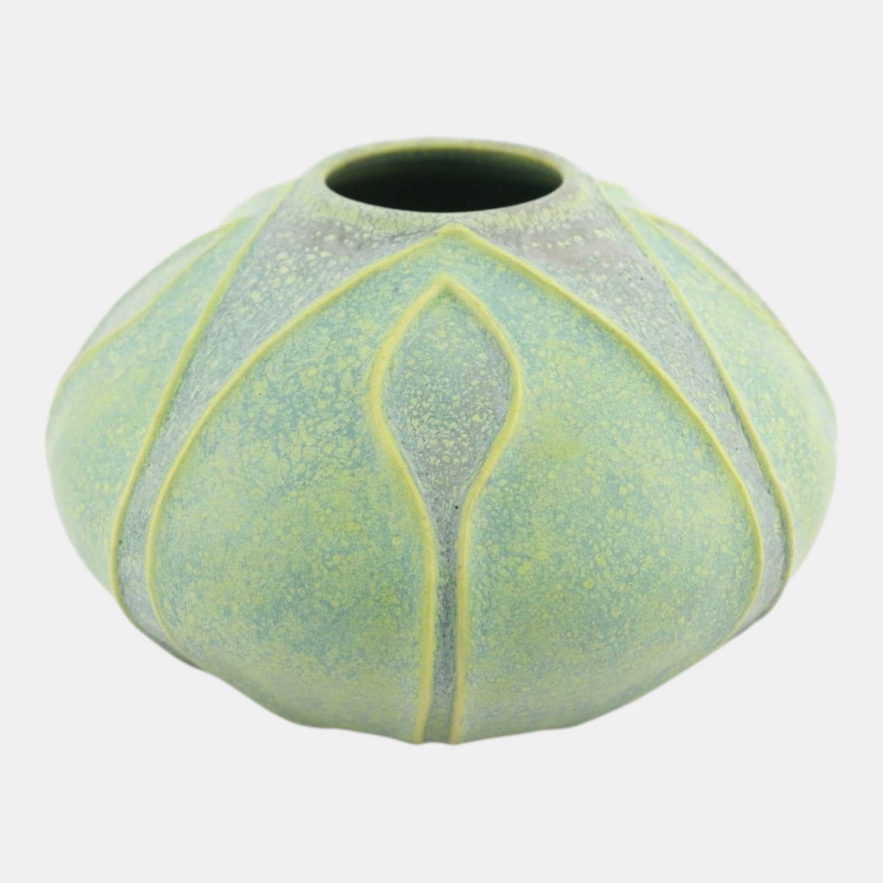 • Softly domed bud vase with incised petal-like panels, finished in matte green glaze with subtle yellow undertones; the organic form and handcrafted surface reflect contemporary studio pottery inspired by Arts & Crafts aesthetics.