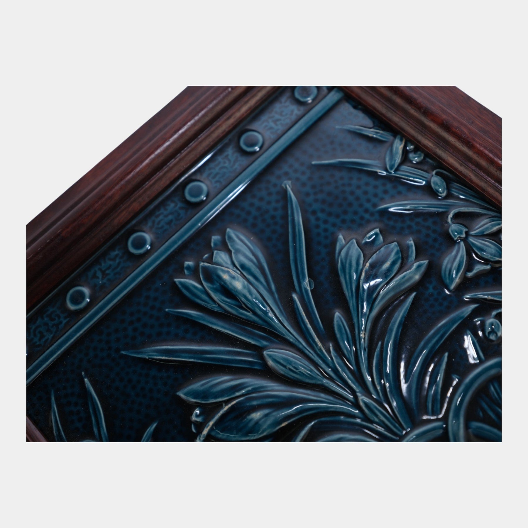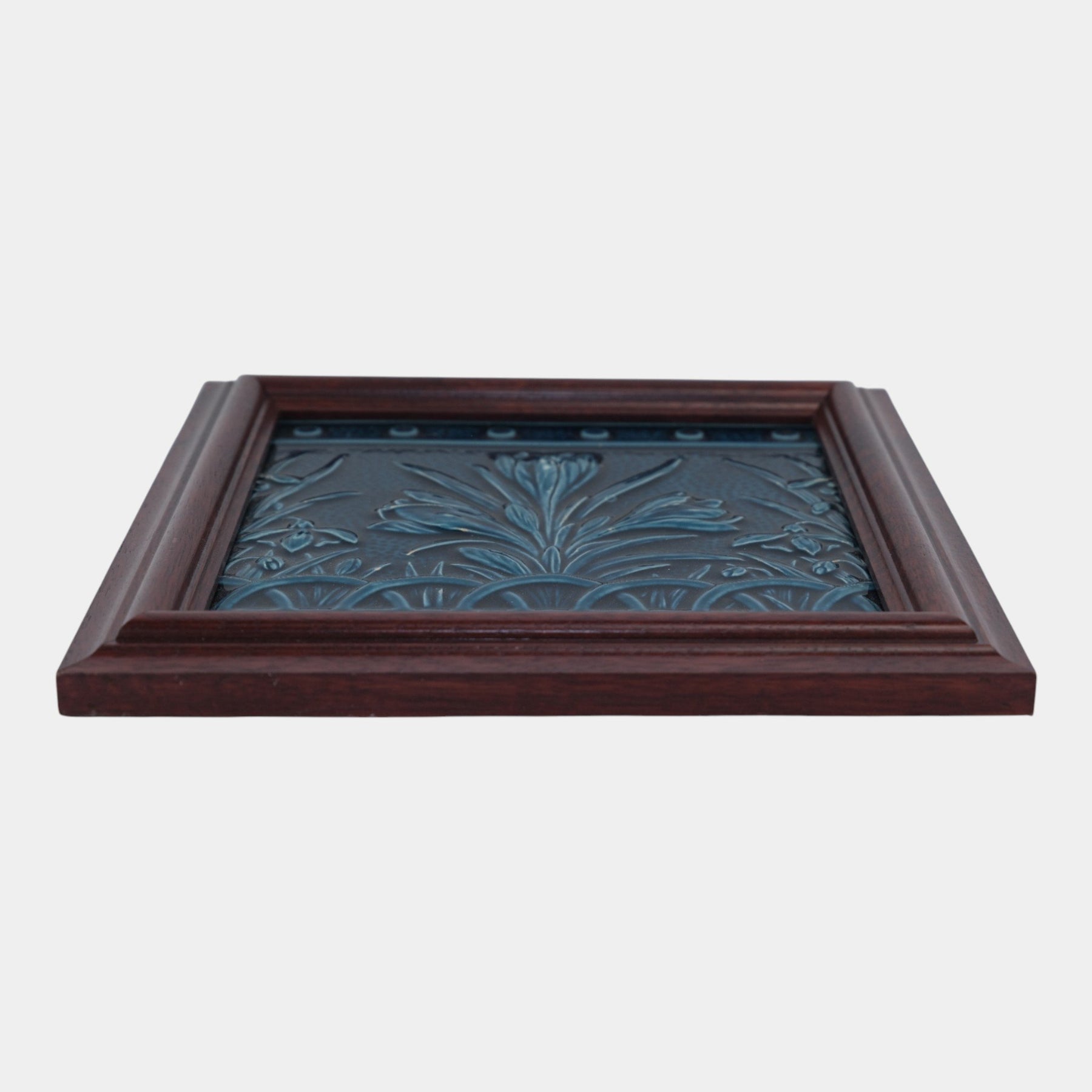 • Deeply molded Minton Hollins tile with rich cobalt glaze, stylized floral sprays, and crisp Victorian relief, presented in a handsome oak frame—striking decorative ceramic artistry.