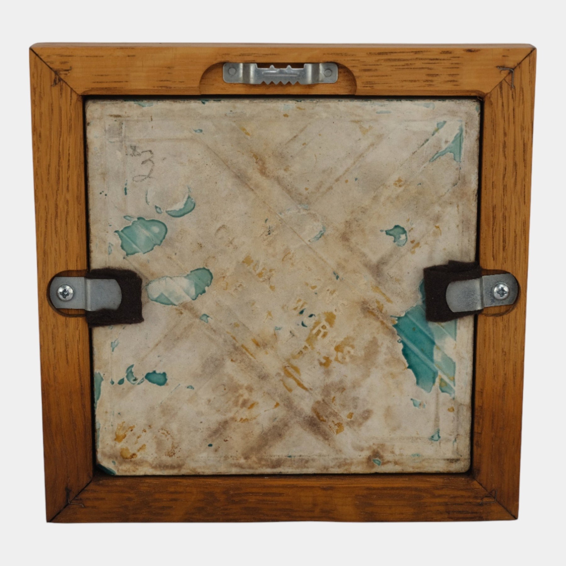 • Delicately modeled and softly toned, this Minton tile shows a bird amid branches in fine relief, its earthy glaze and intricate detailing beautifully enhanced by the warm quarter-sawn oak frame.