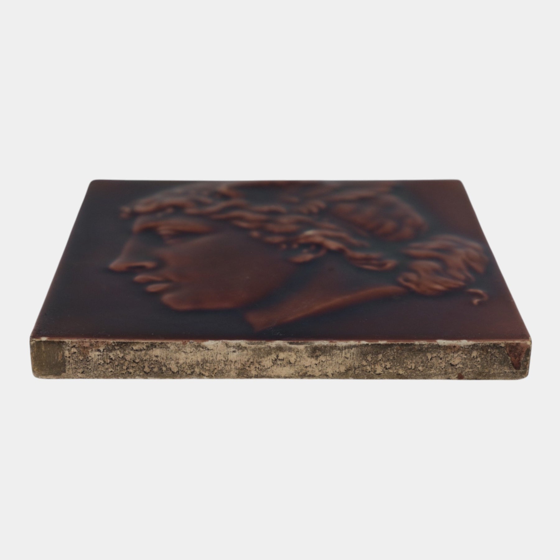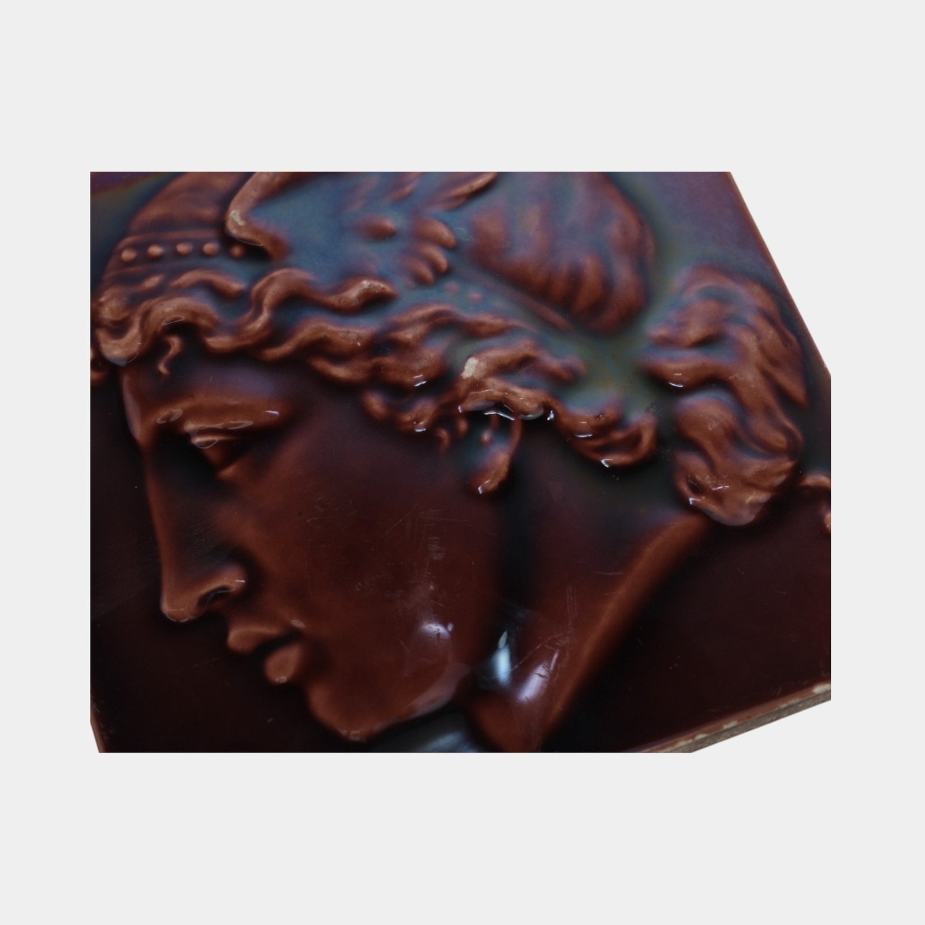 • Minton Stoke-on-Trent molded portrait tile depicting a classical helmeted warrior in rich oxblood glaze. Finely detailed relief, strong profile modeling, and deep, glossy surface—an excellent example of Minton’s high-quality 19th-century art tile production.
