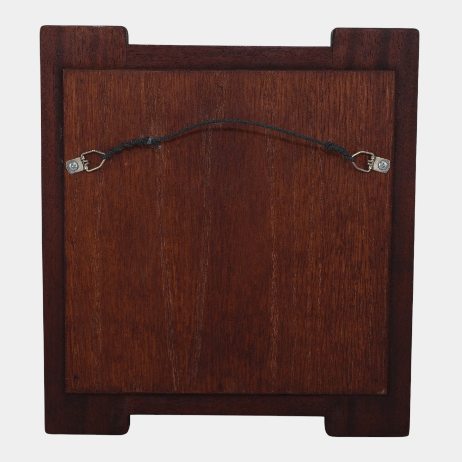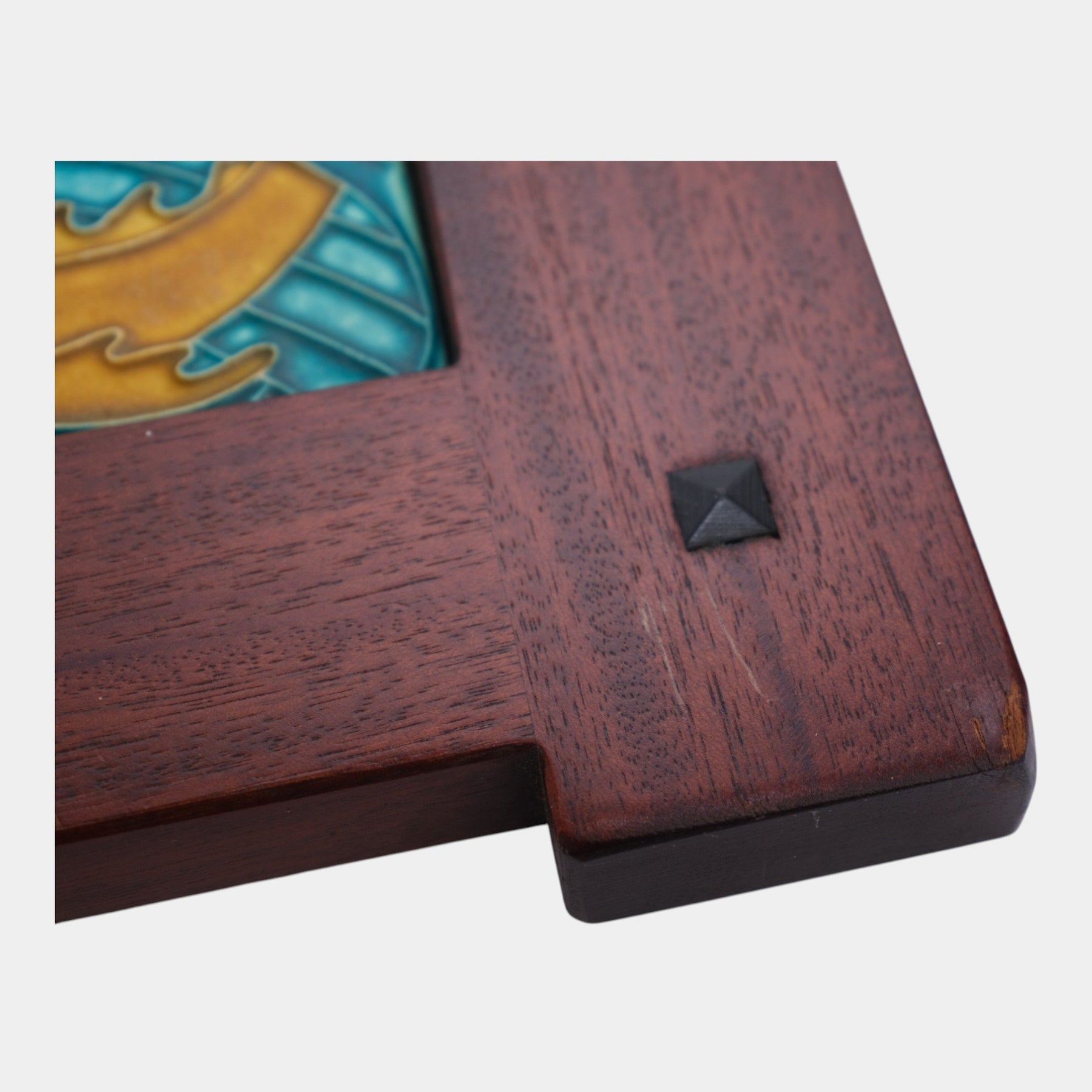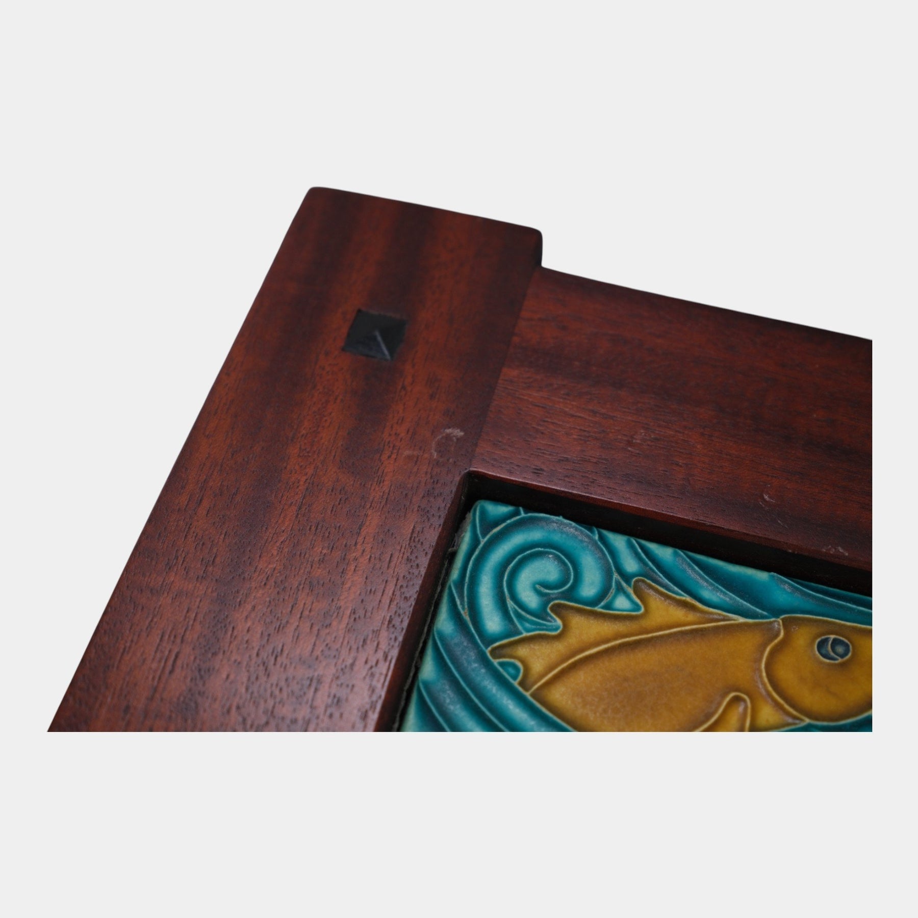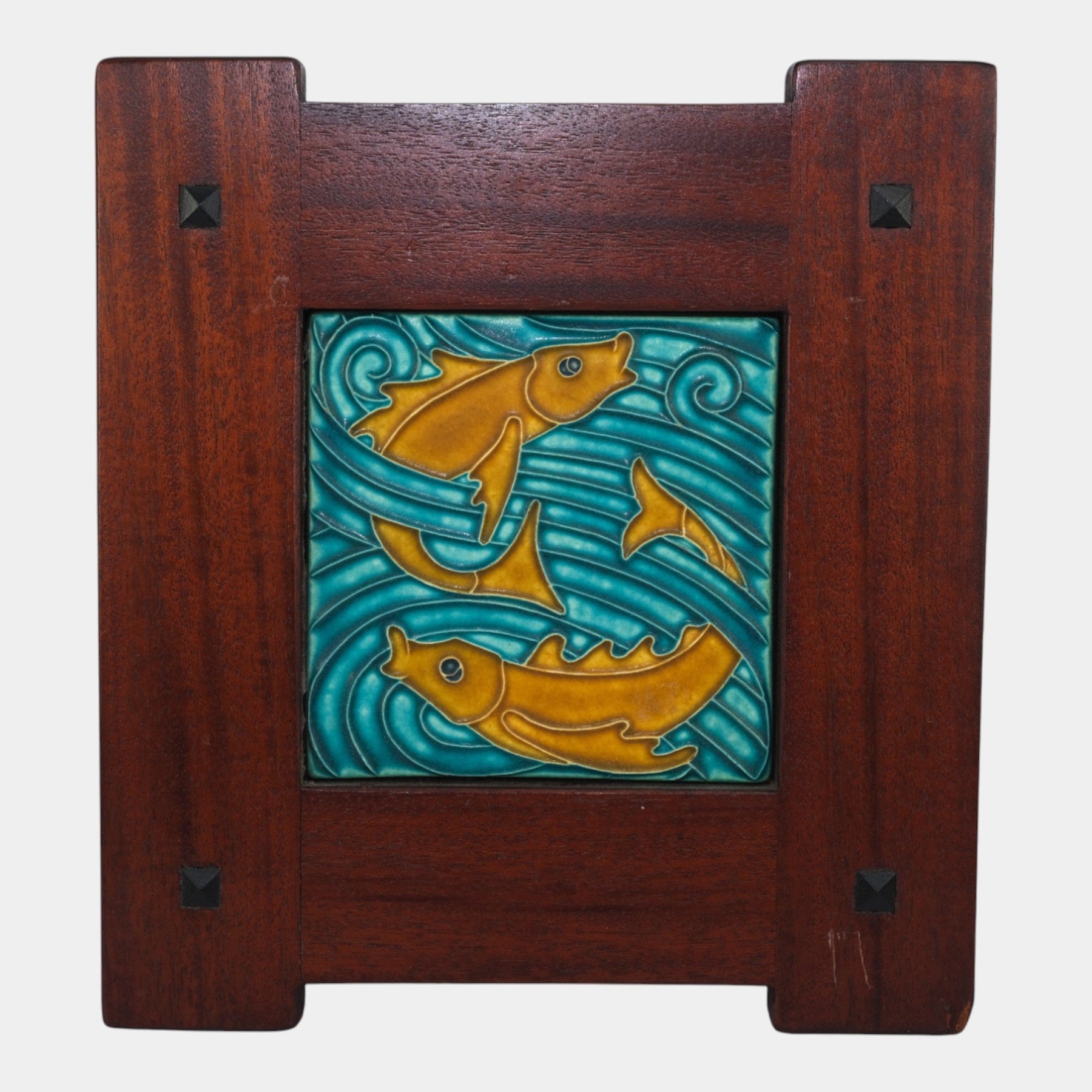 • Striking Motawi Tileworks tile featuring a orange fish swimming in stylized green waves, framed in quartersawn oak for an Arts and Crafts presentation.