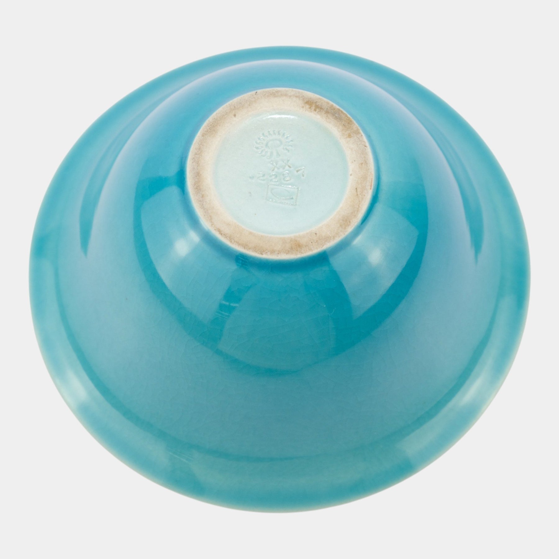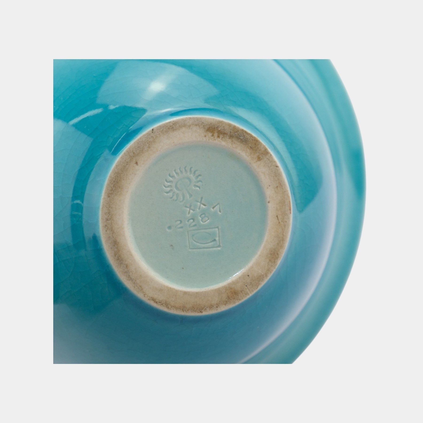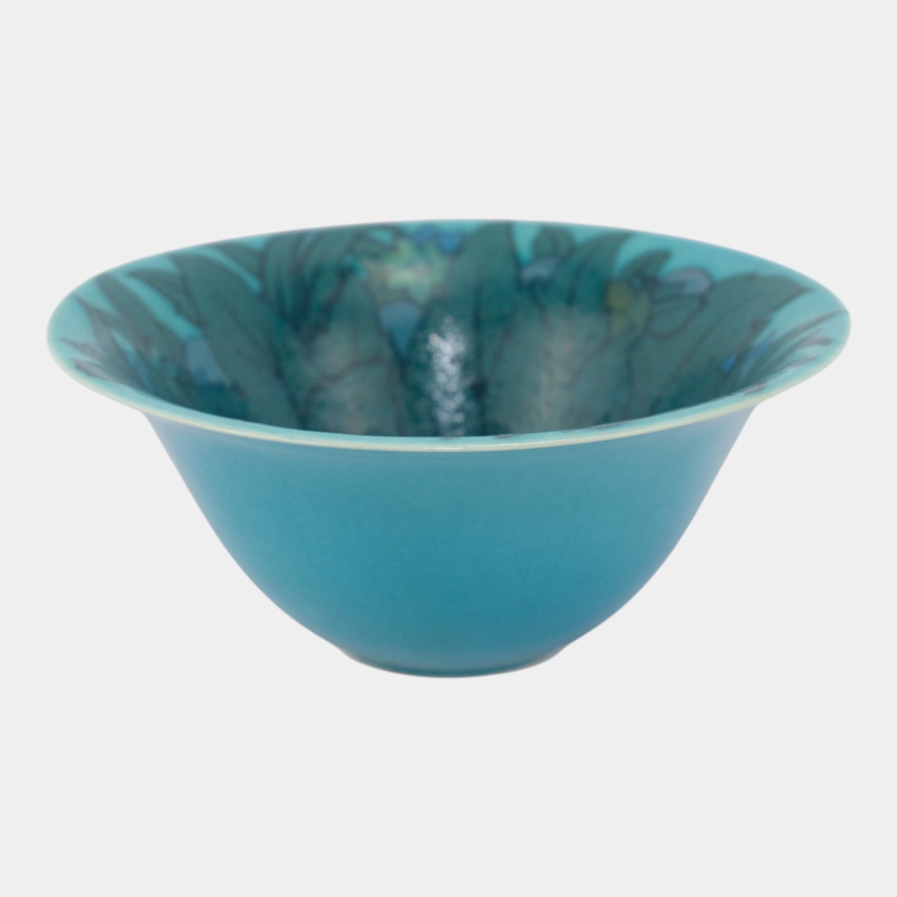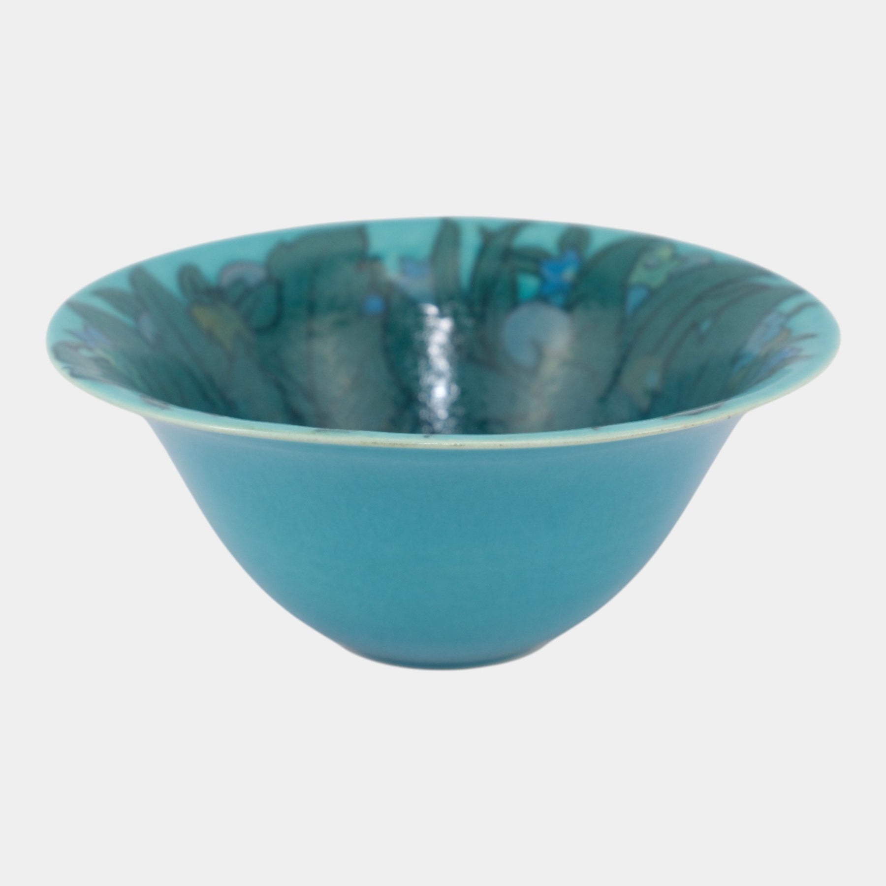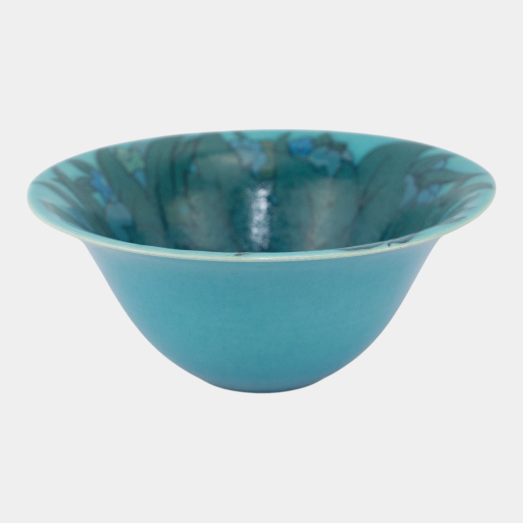 • Softly flared and richly atmospheric, this turquoise bowl features layered shadow-tone foliage and blossoms encircling the interior, its dreamy hues and fluid Art Deco styling creating luminous depth. Decorated by Arthur Conant in 1920.