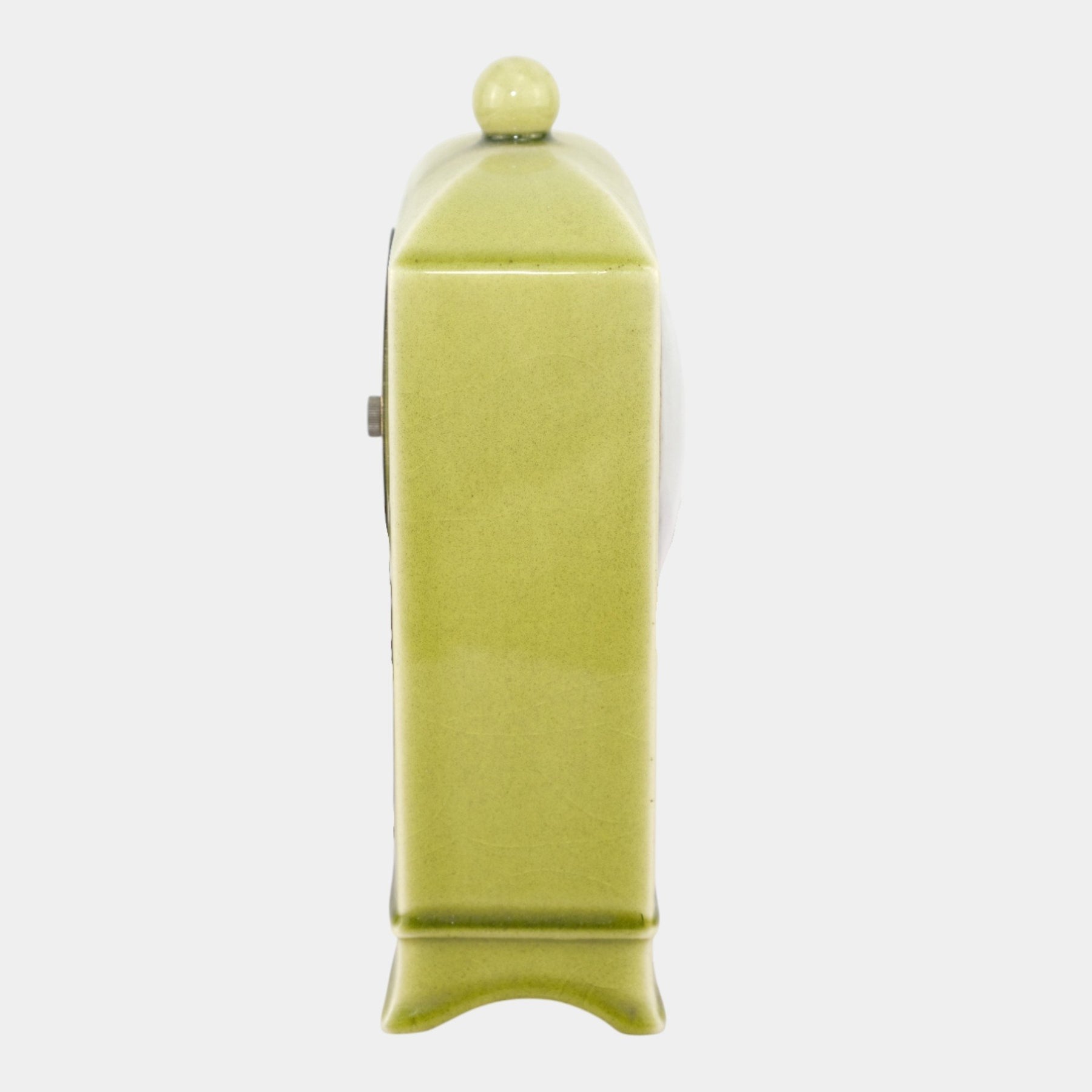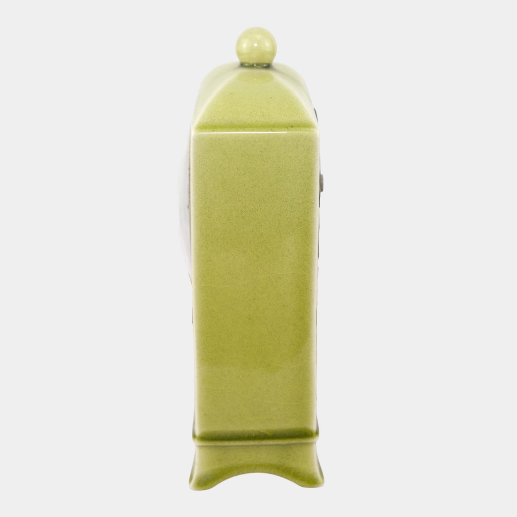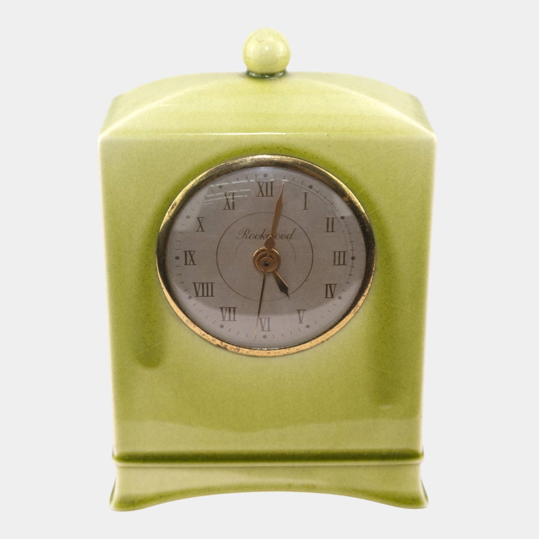 • Smoothly glazed and softly refined, this Rookwood mantel clock features a serene celadon finish, arched shoulders, and a domed finial, its classic Roman-numeral dial adding elegant Art Deco charm.