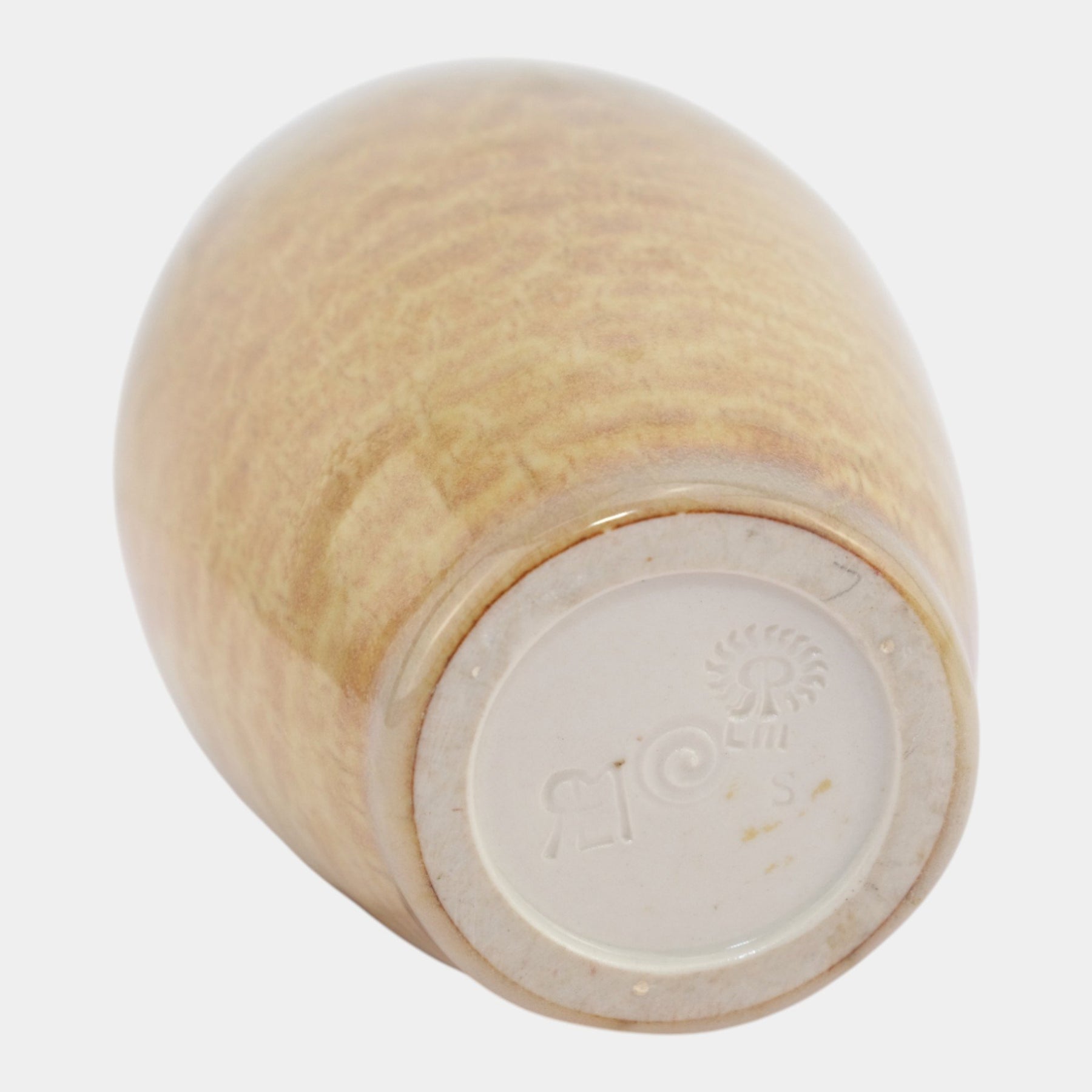 • Handsome form with a softly blended tan-to-amber standard glaze, showing Rookwood’s characteristic fluid, furnace-fired surface. Clean, elegant Arts & Crafts era craftsmanship with a rich, glossy interior. Decorated by Earl Menzel in 1953.