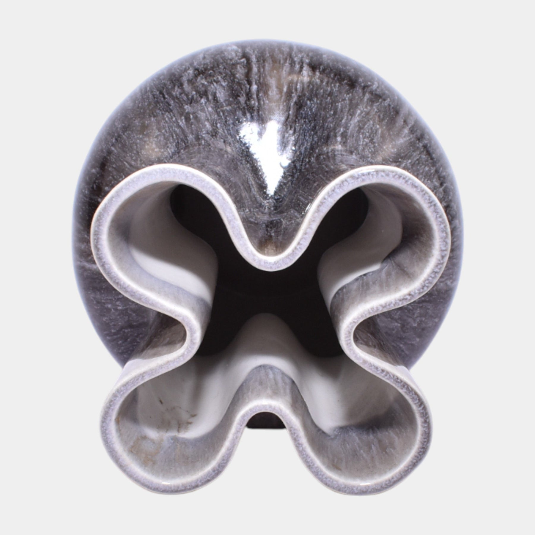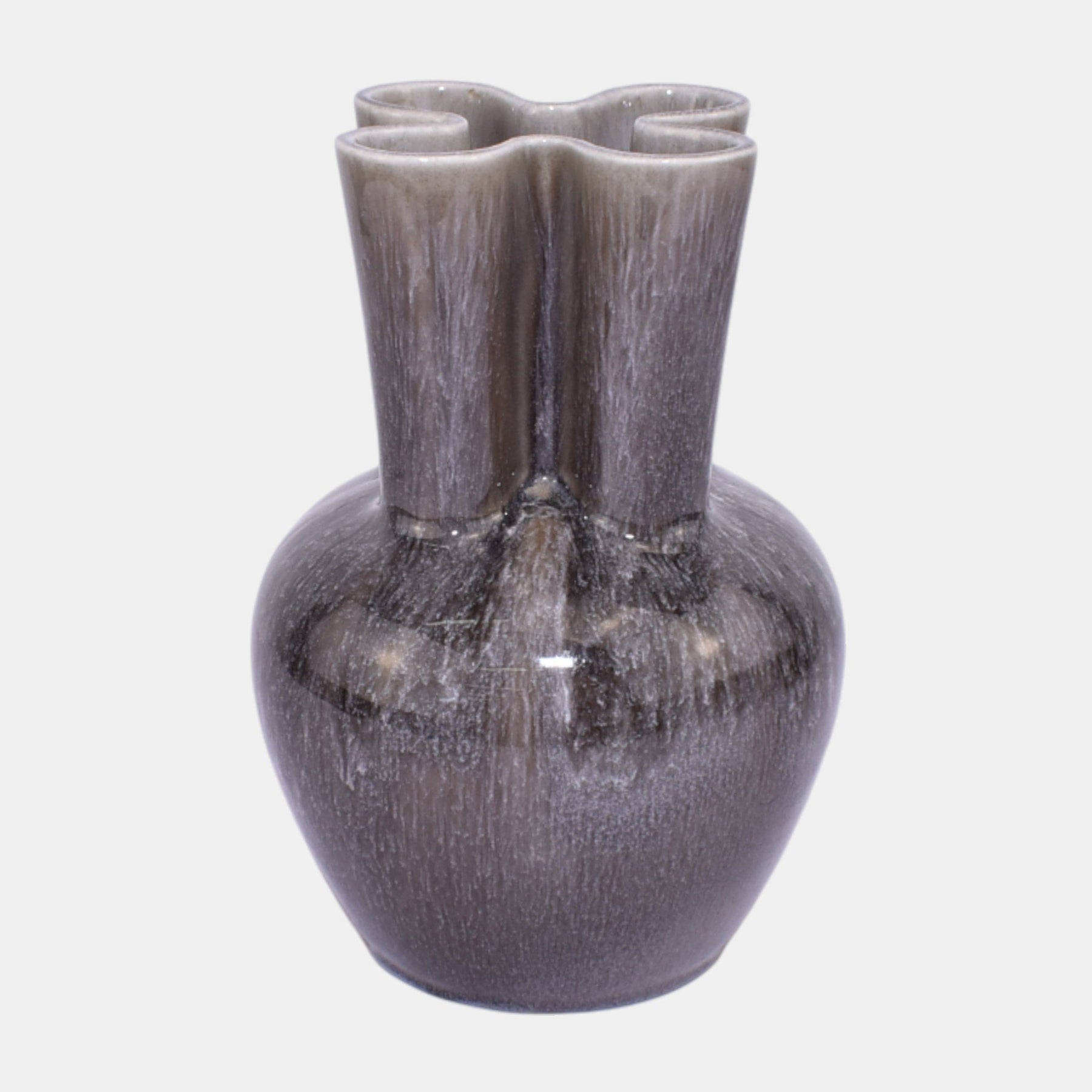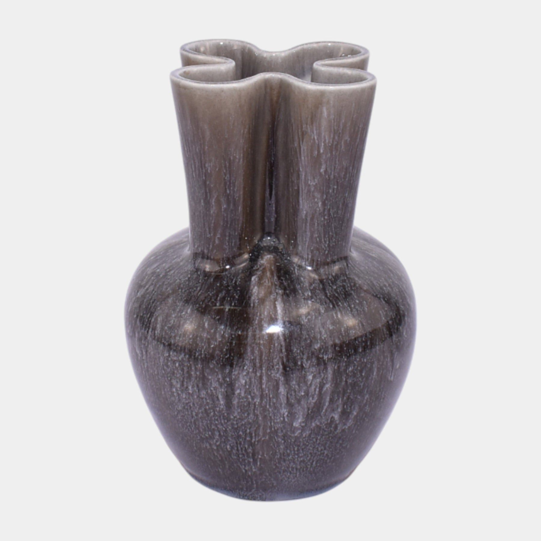 • Richly textured and subtly organic, this Mid Century era Rookwood vase features a rounded bulbous body rising to an undulating iris-style rim, finished in a smoky gray-brown crystalline glaze with vertical flowing striations.