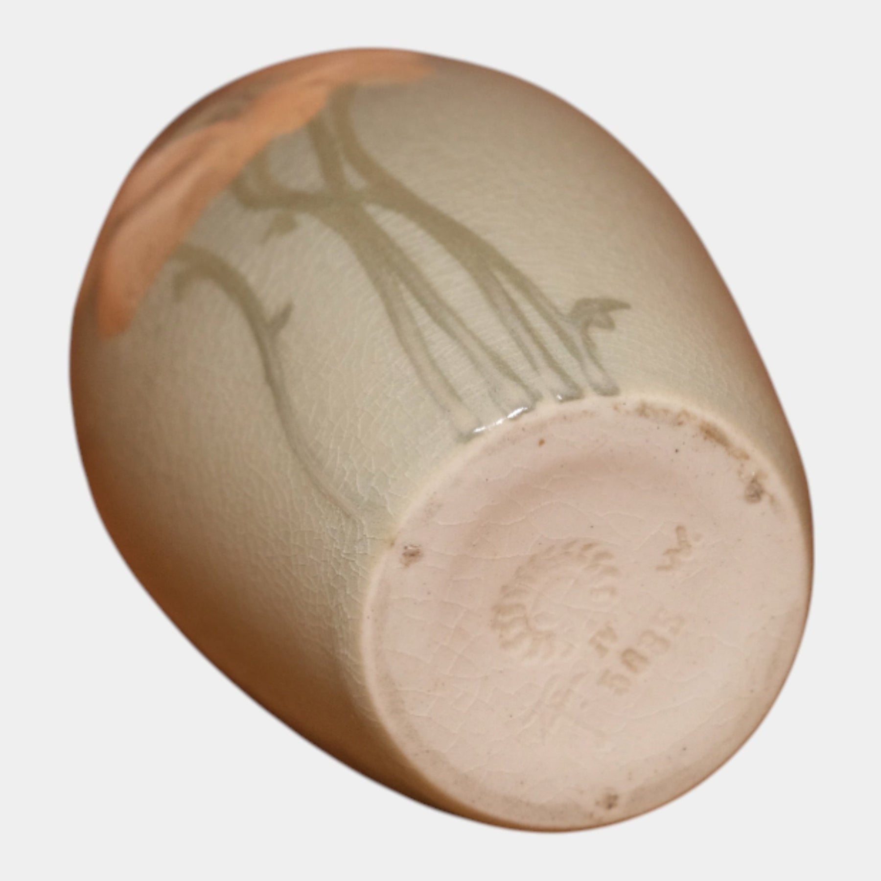 • Softly atmospheric and beautifully shaded, this Rookwood vellum vase features a delicate blooming poppy drifting across its rounded form, echoing graceful Arts & Crafts naturalism in warm earthy tones. Decorated by Josephine Zettel in 1904.