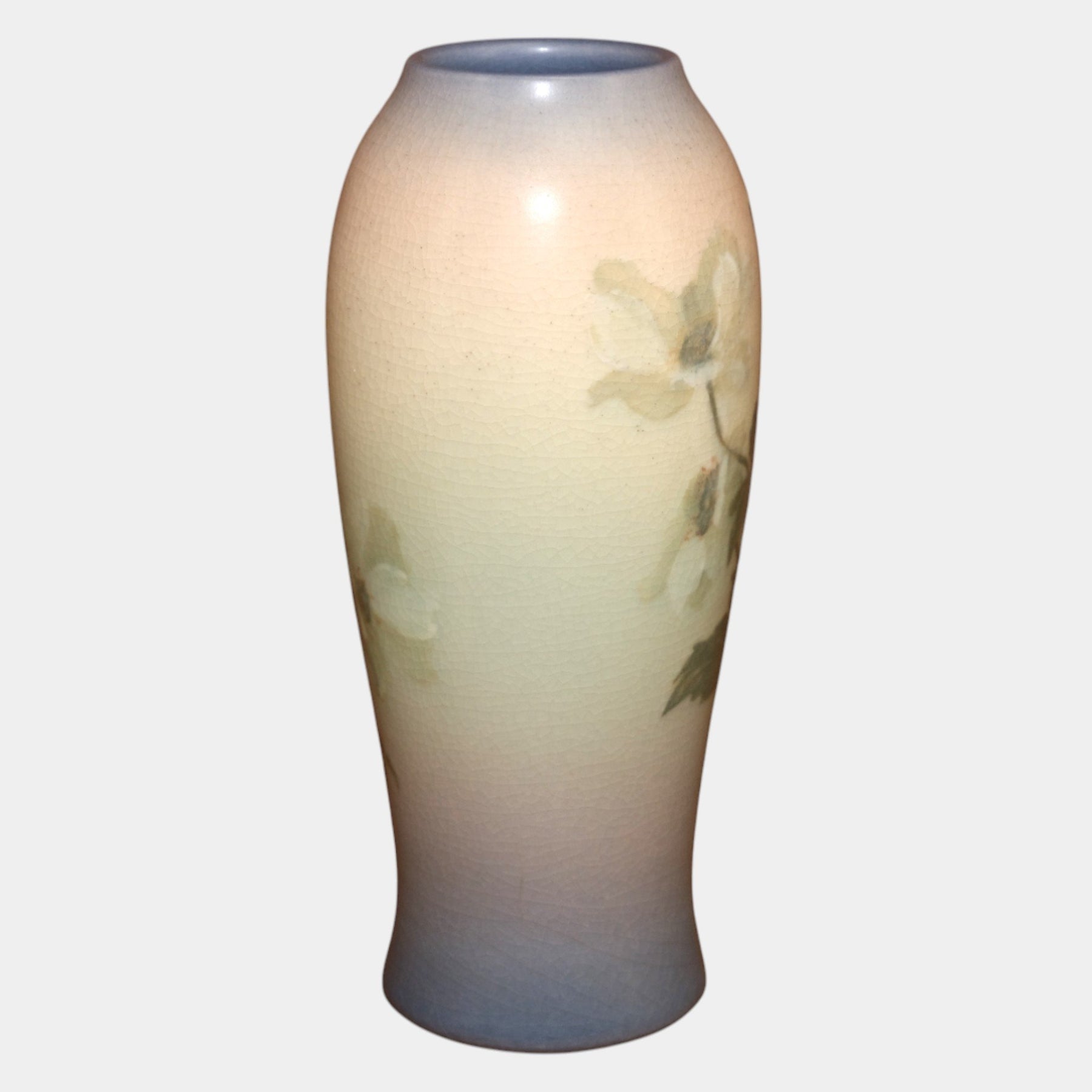 • Soft pastel shading in cream, blue, and peach surrounds delicate hand-painted blossoms on this tall Rookwood vase. Its smooth, gently curved form reflects refined mid-period artistry.