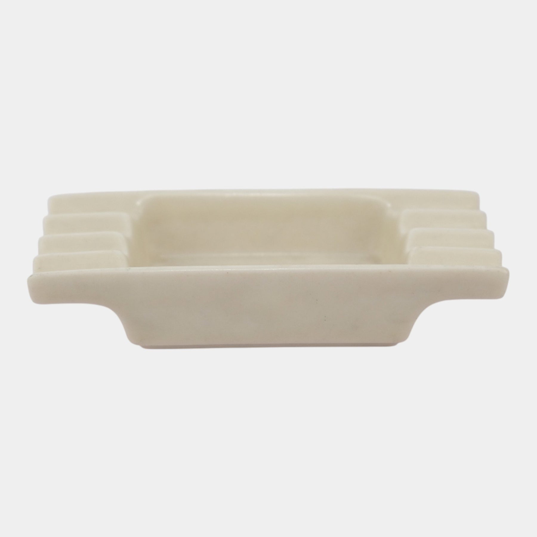 • Rookwood Pottery Art Deco dish with stepped geometric ends and a clean ivory glaze. Strong lines, crisp form, and a smooth satin finish highlight the period style. A versatile and elegant decorative piece from Rookwood’s modernist era.