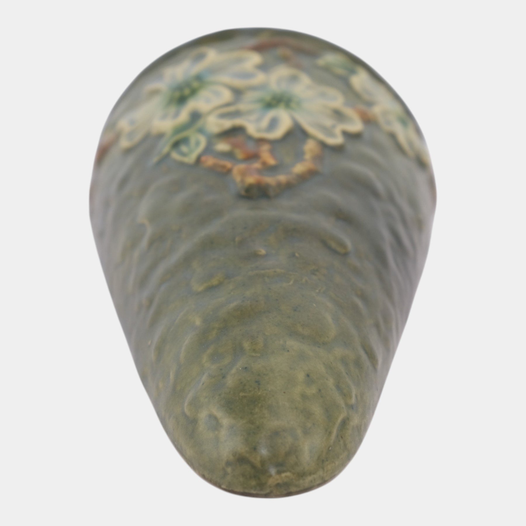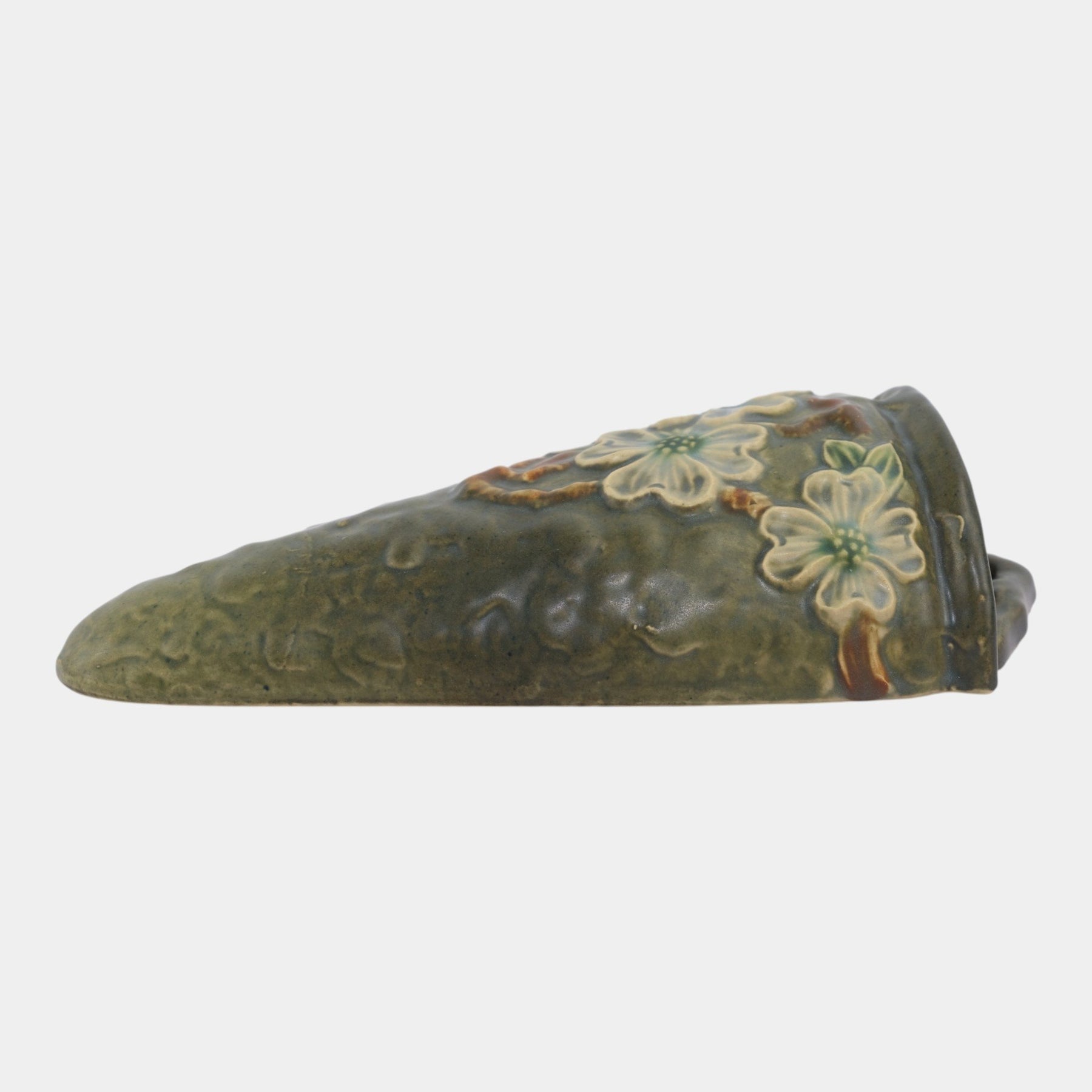 • Roseville Pottery Dogwood wall pocket featuring delicate white blossoms with green leaves against a mossy green background, an elegant example of the line’s naturalistic charm.