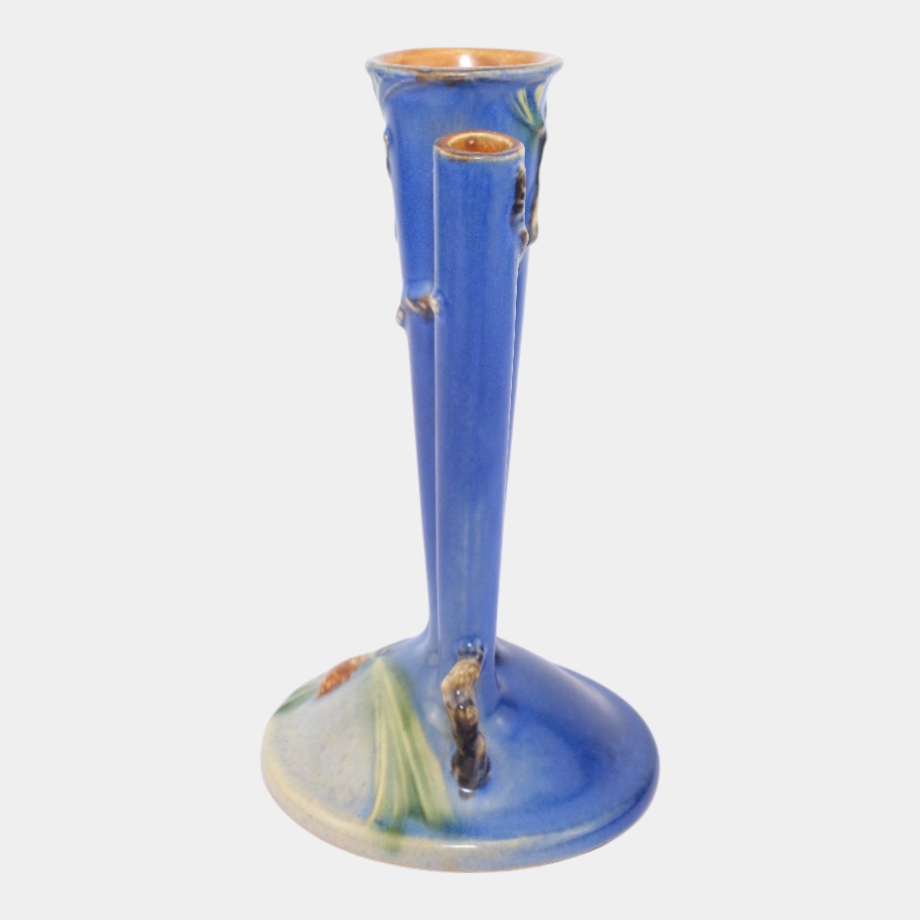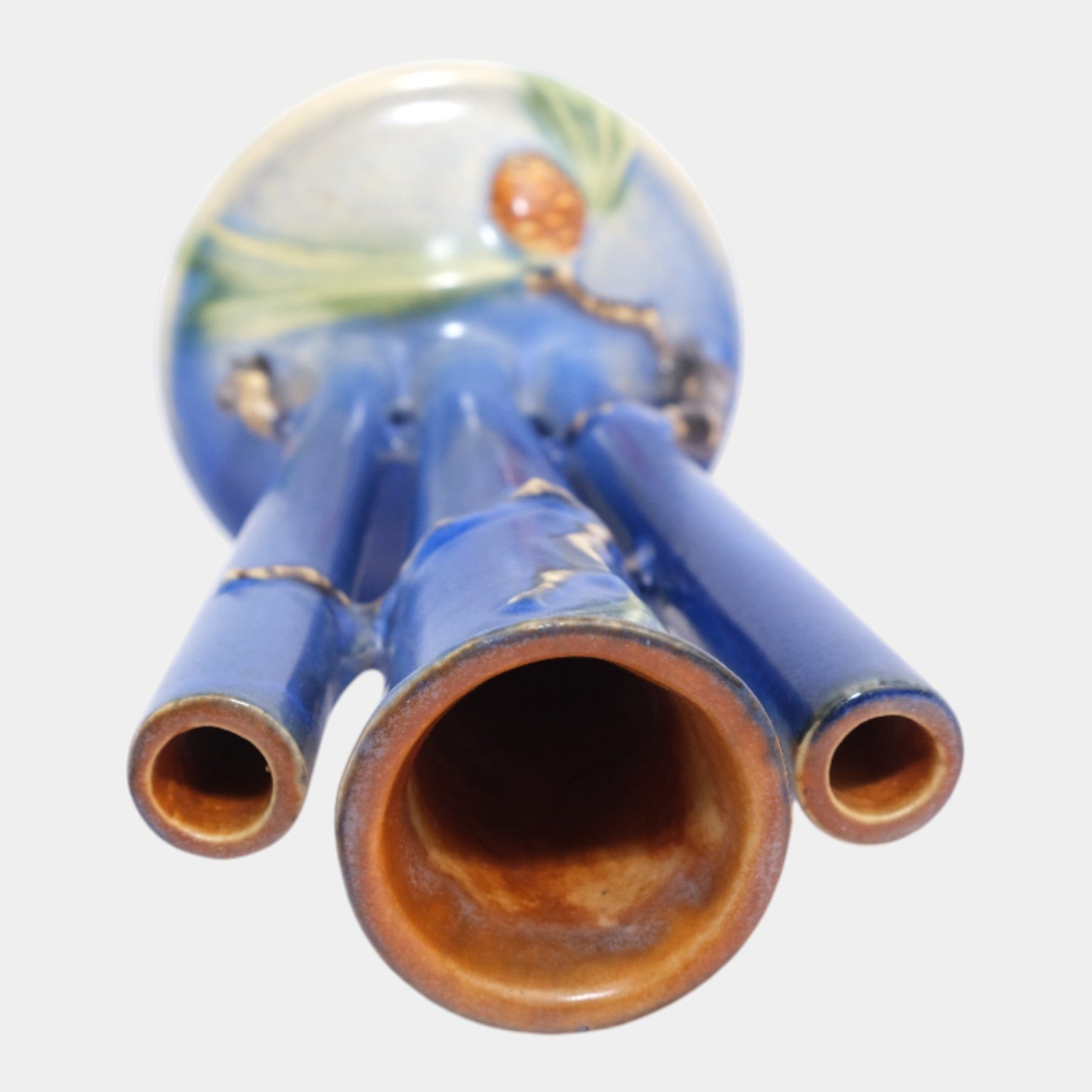 • Roseville Pine Cone Blue 1935 Vintage Art Pottery Ceramic Triple Bud Vase 113-8