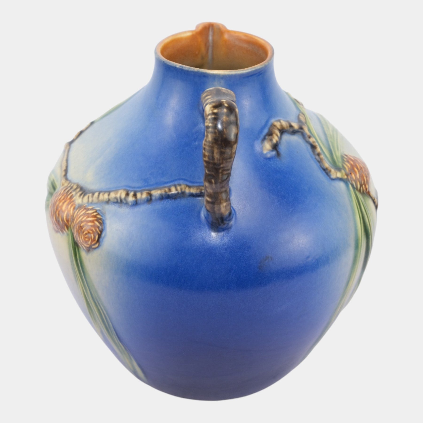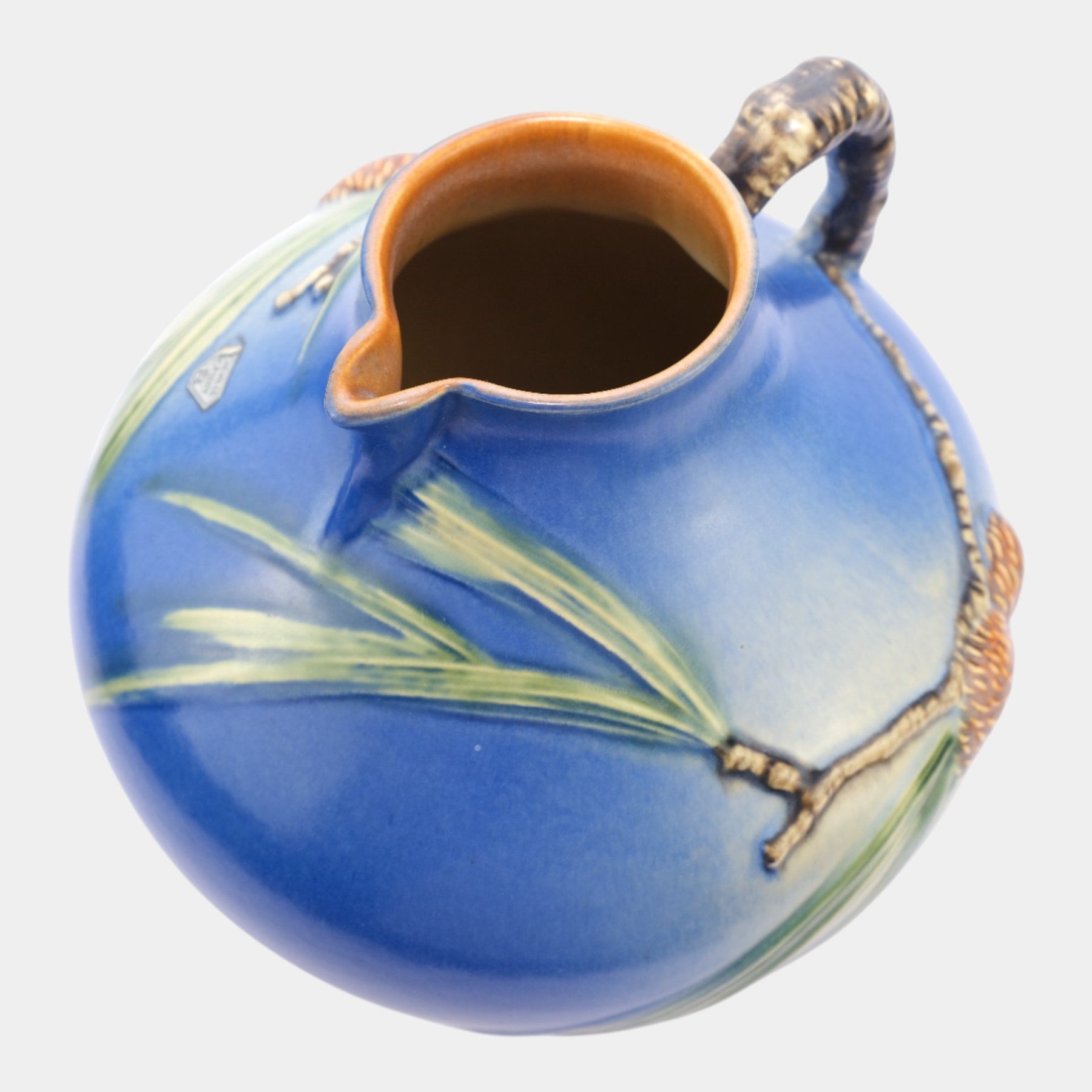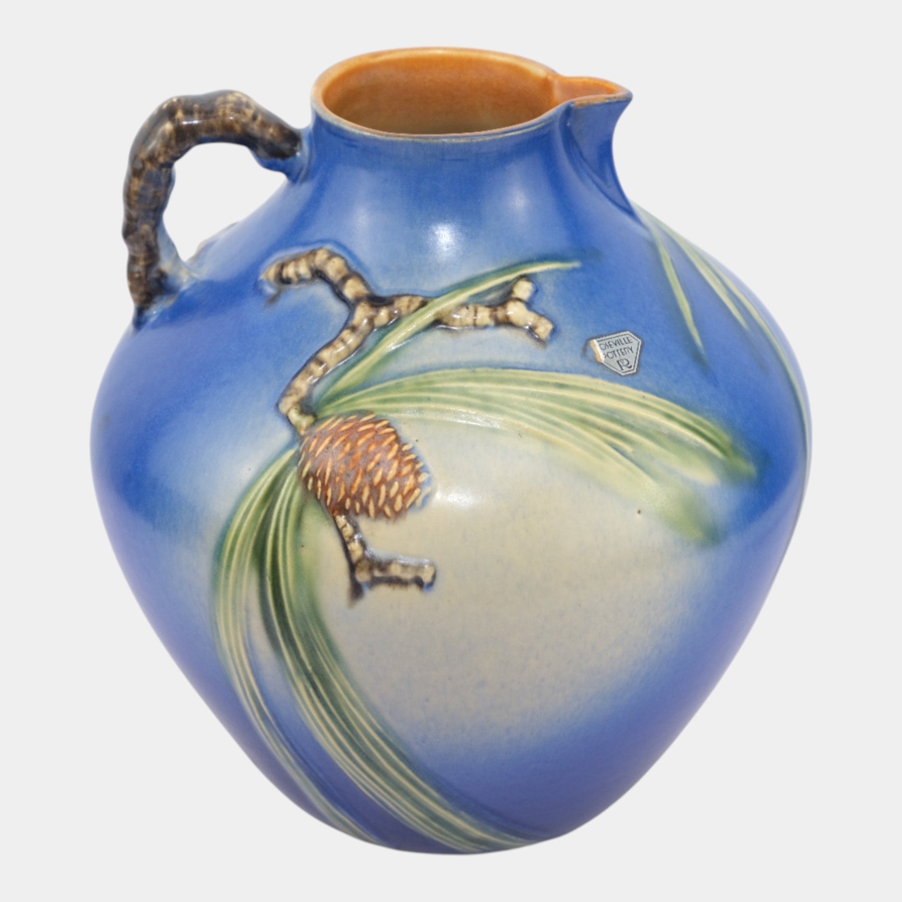 • Large and hard to find Roseville Pottery Pine Cone blue ewer.