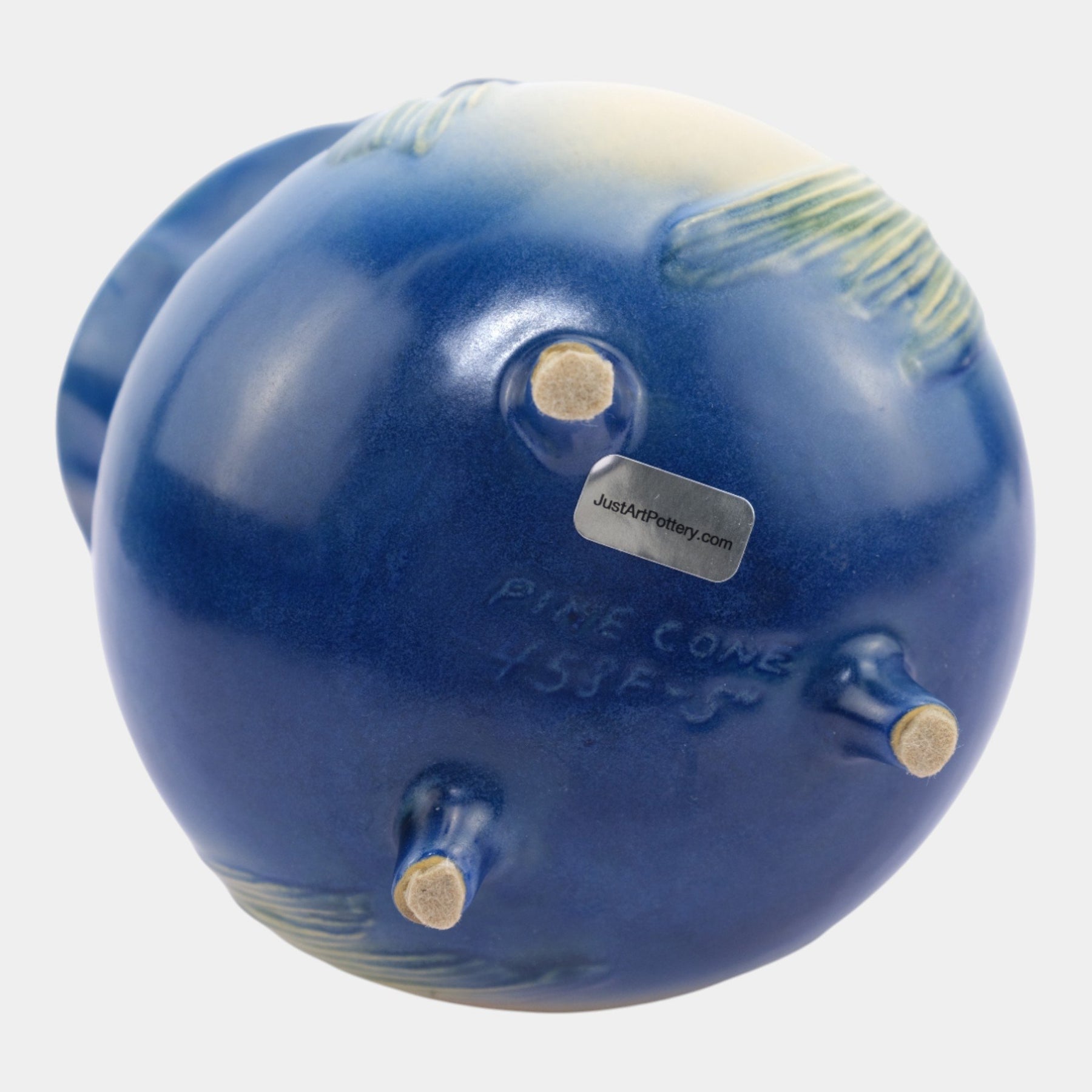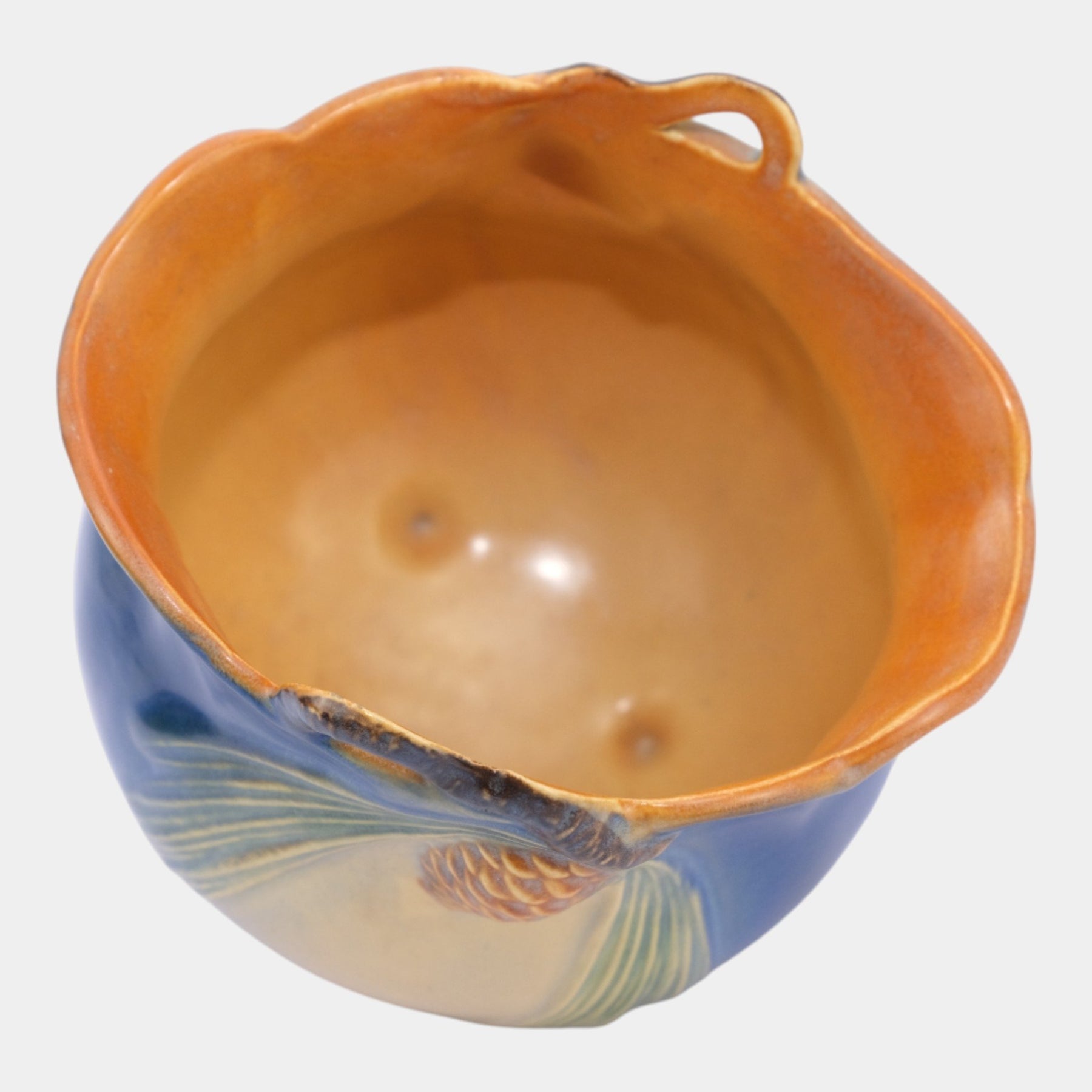 • Whimsically sculptural and richly detailed, this Roseville Pinecone bowl features a rounded footed form with applied pinecone and flowing needle motifs, accented by a sculptural handle and finished in soft blue, green, and cream glazes.