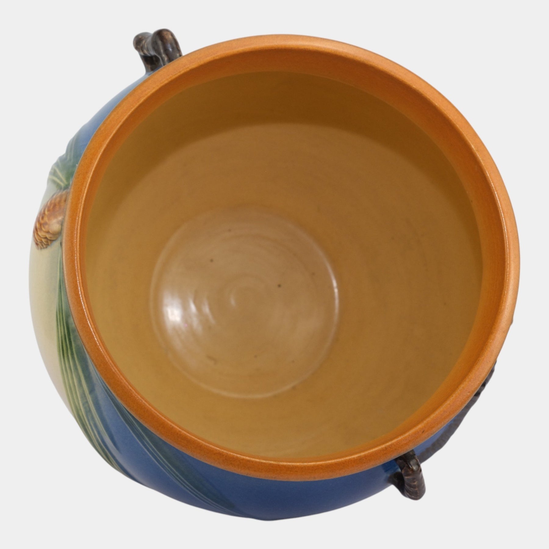 • Roseville Pine Cone Blue 1953 Vintage Art Pottery Handled Jardiniere 403-10