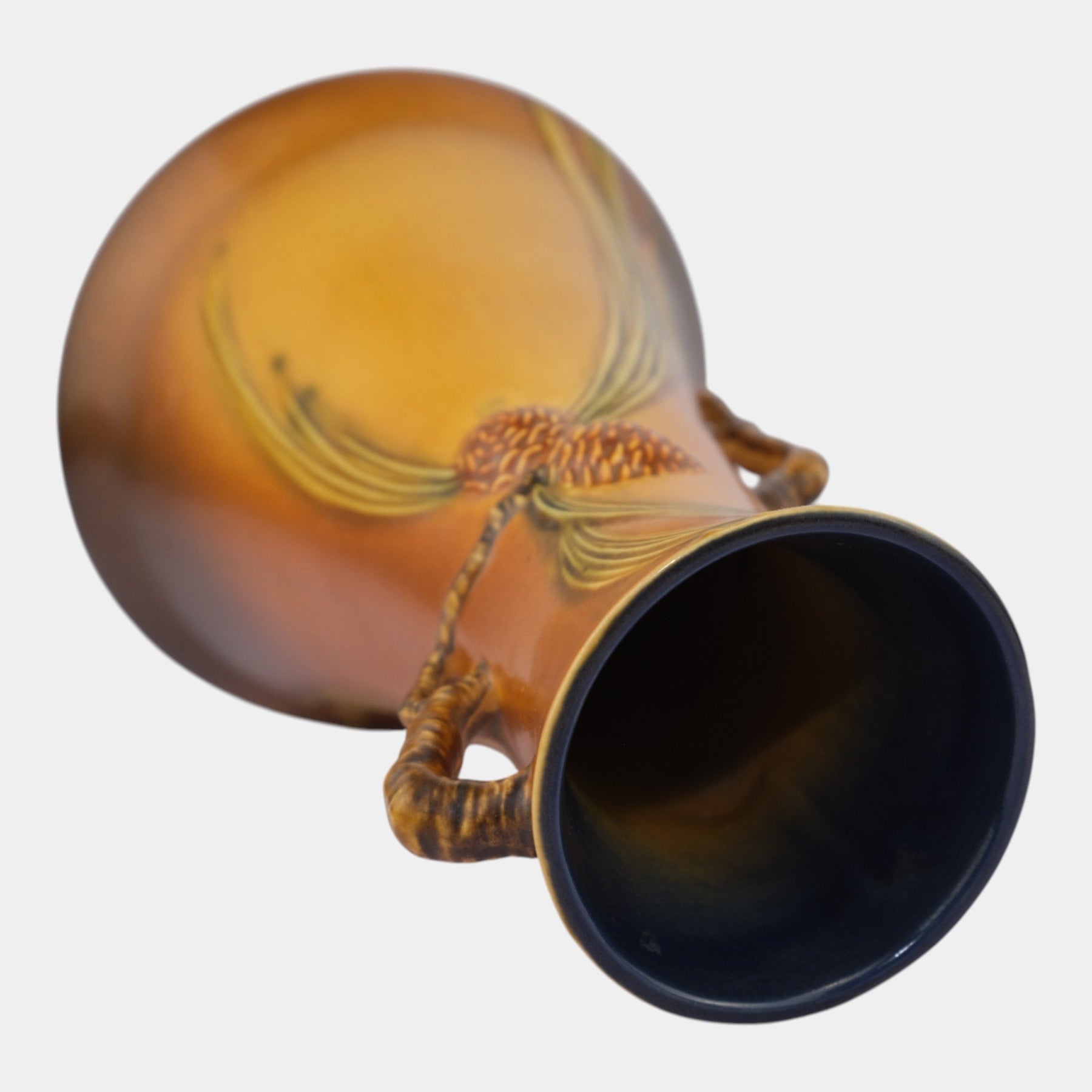• Richly sculptural and warmly toned, this Roseville Pinecone vase features a flared bell form with applied pinecones and flowing needles, accented by textured handles and finished in glowing amber glazes with green highlights.