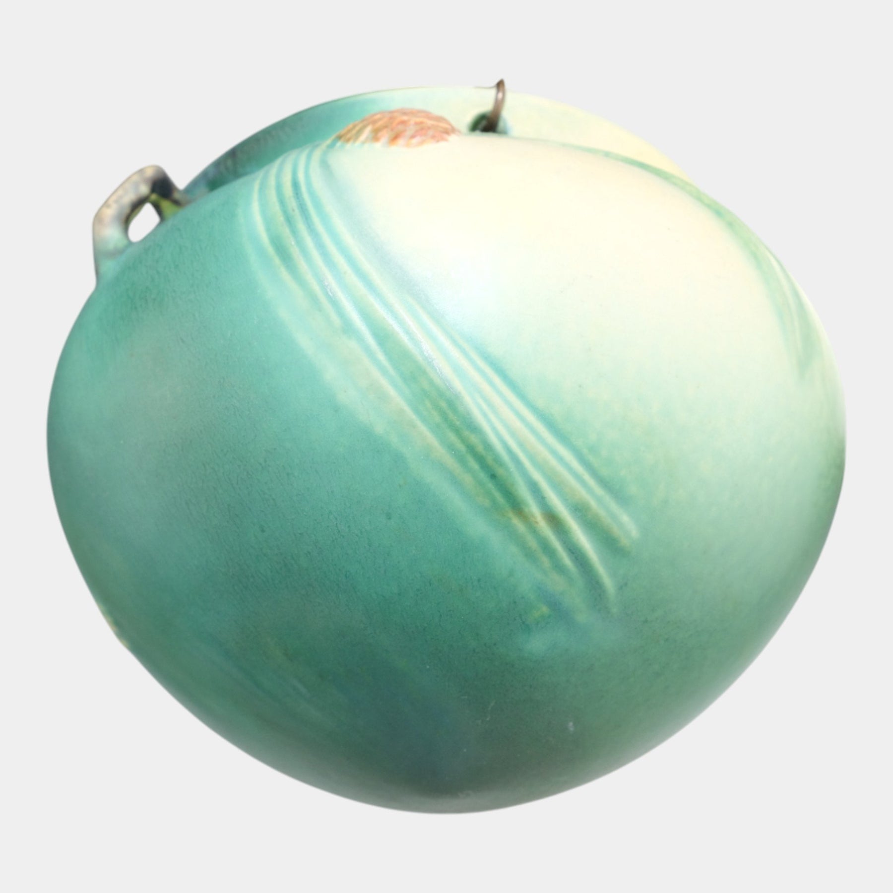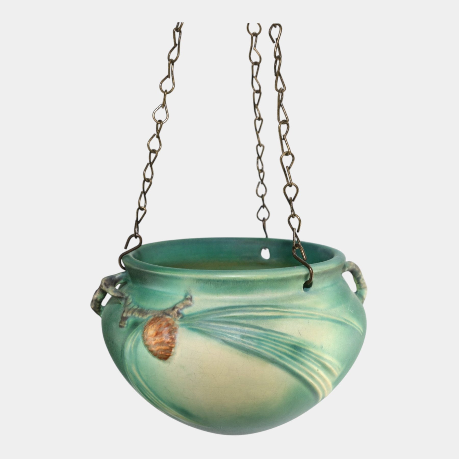 • Roseville Pine Cone Green 1935 Vintage Art Pottery Hanging Basket Planter 352-5