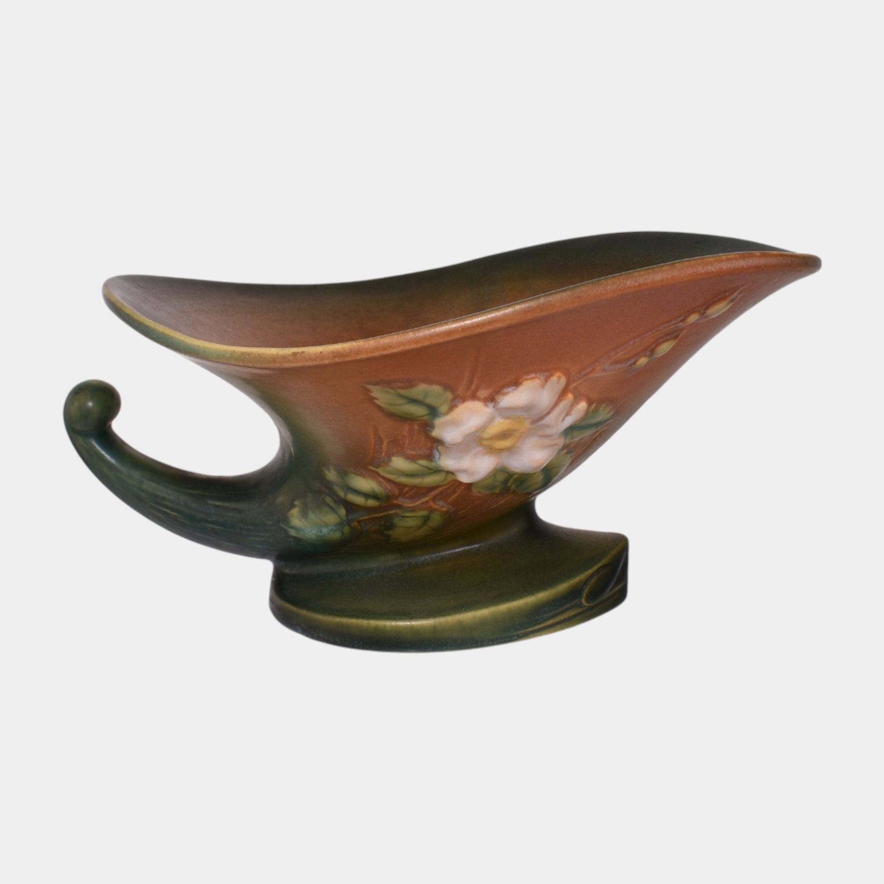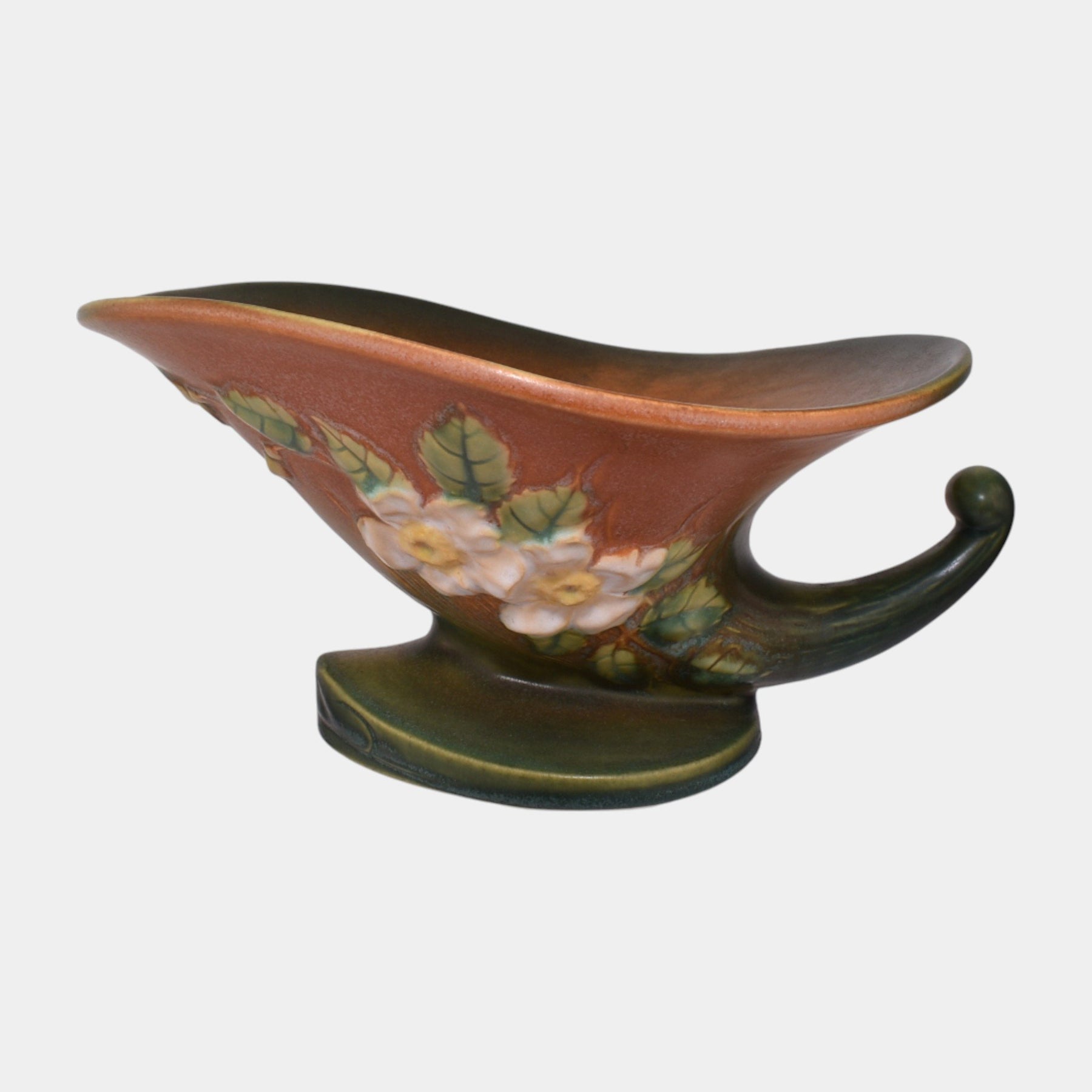 Roseville White Rose Brown Green 1940 Vintage Pottery Cornucopia Flower Frog 1