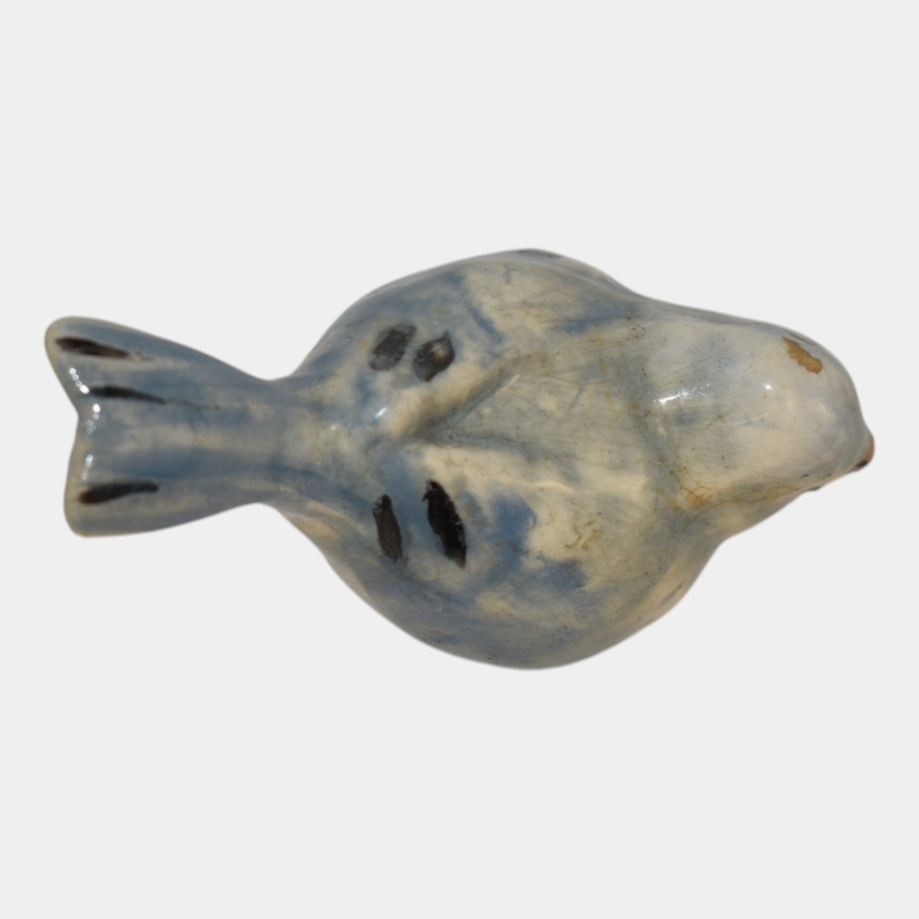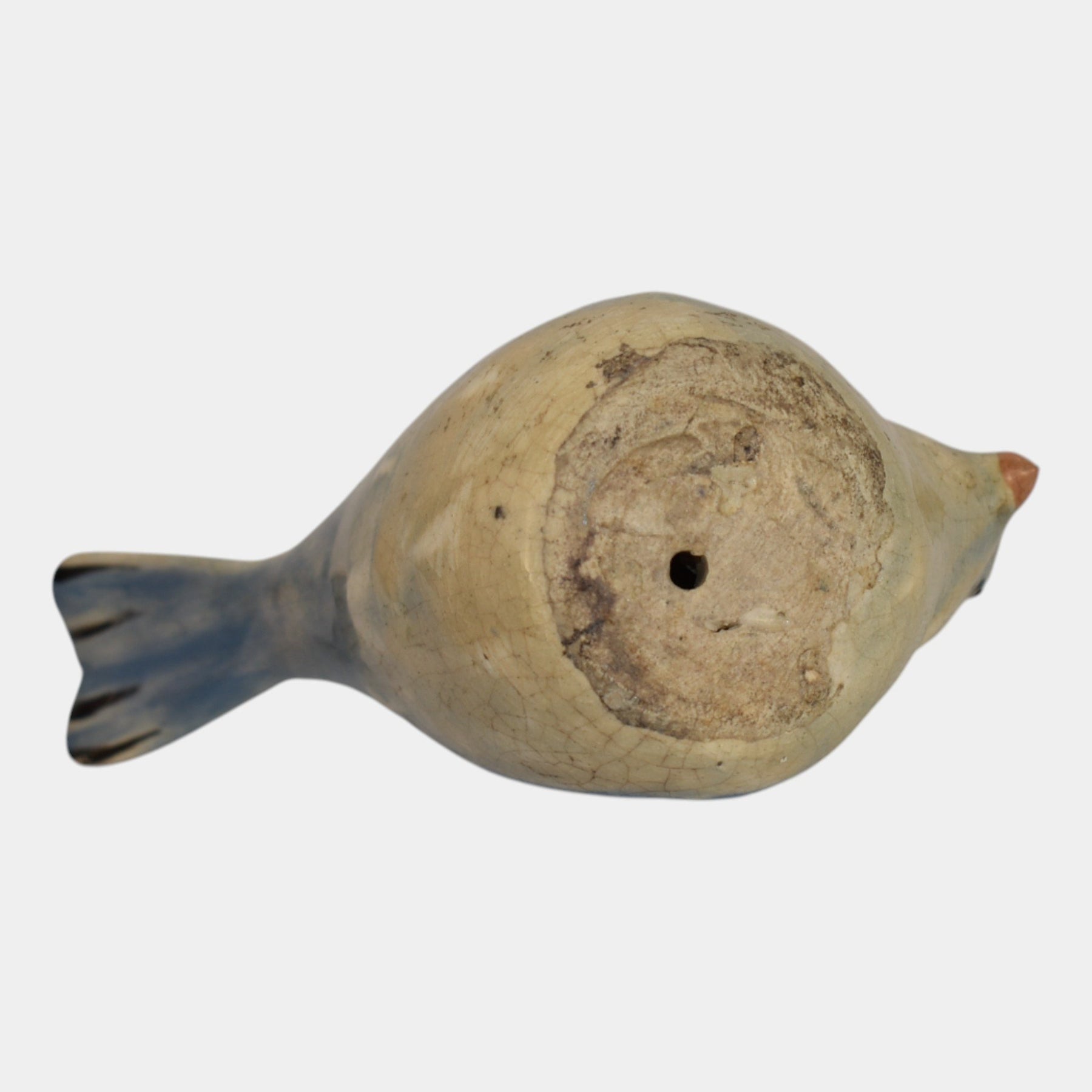 • Charming hand-painted bird figurine from Weller’s Brighton line, finished in soft blue with subtle detailing, embodying the whimsical artistry of early 20th-century American pottery.