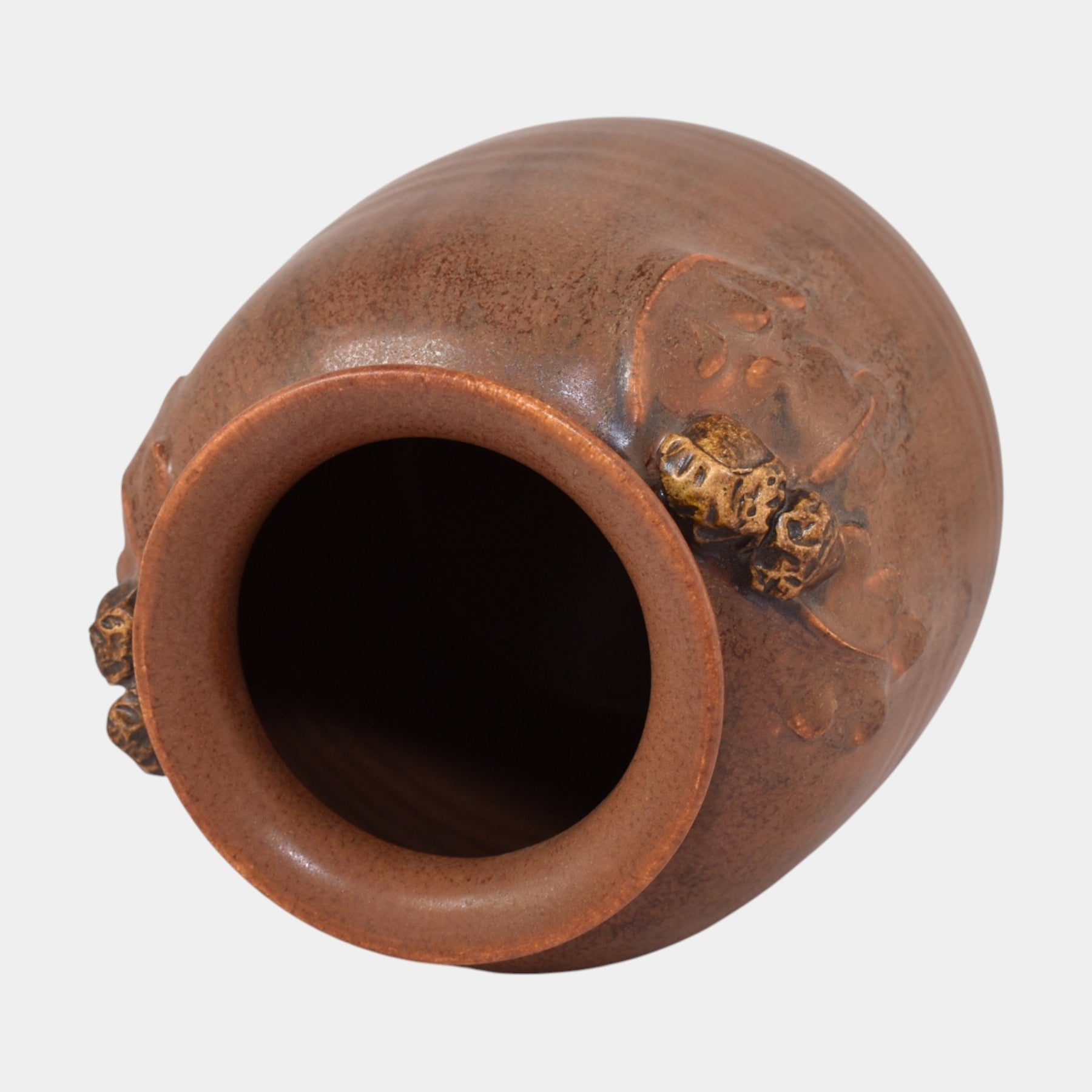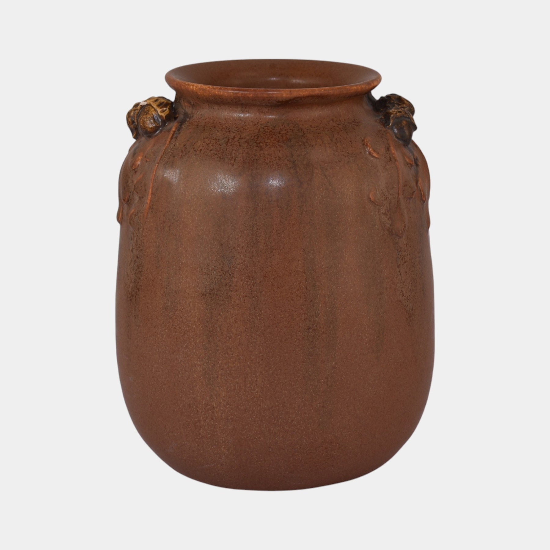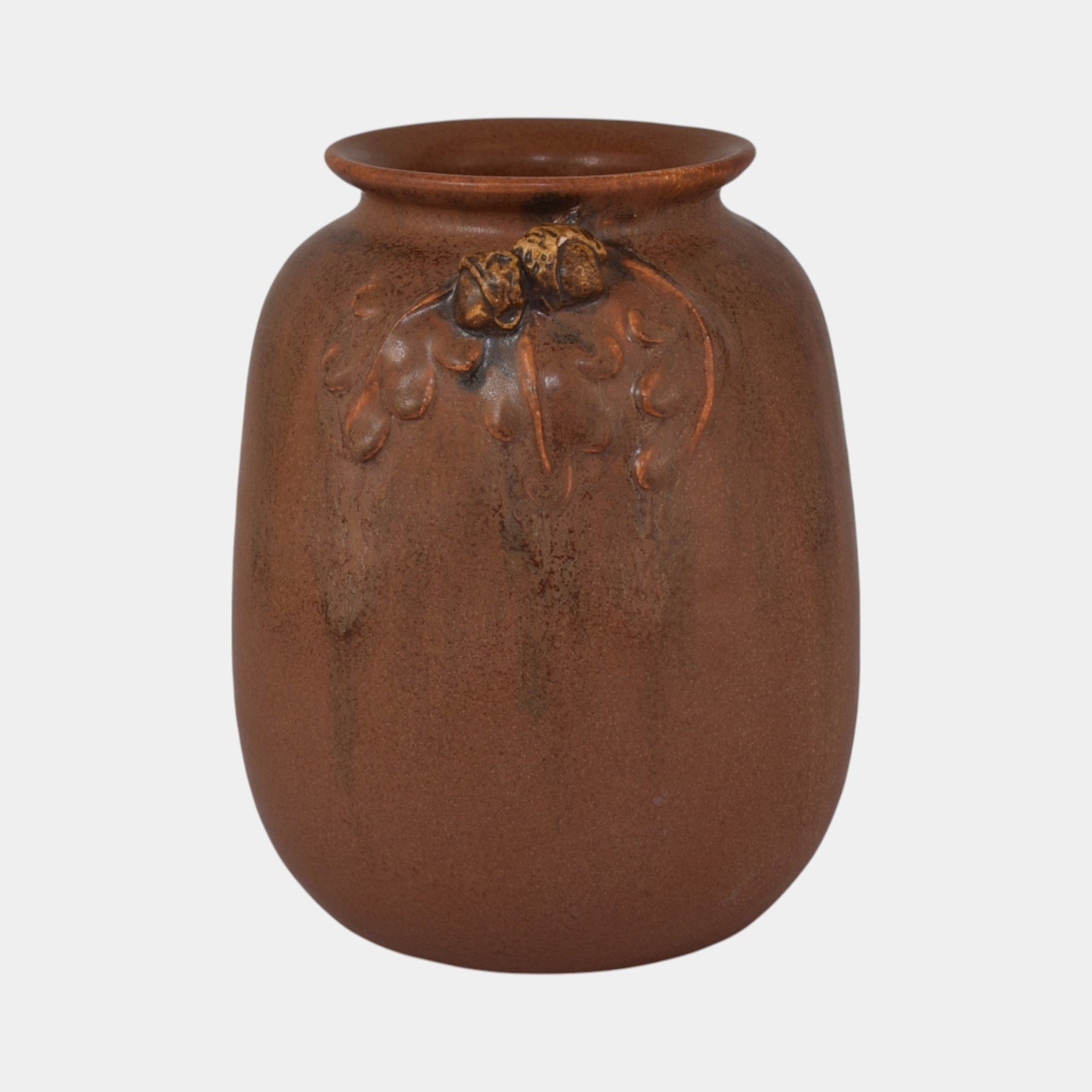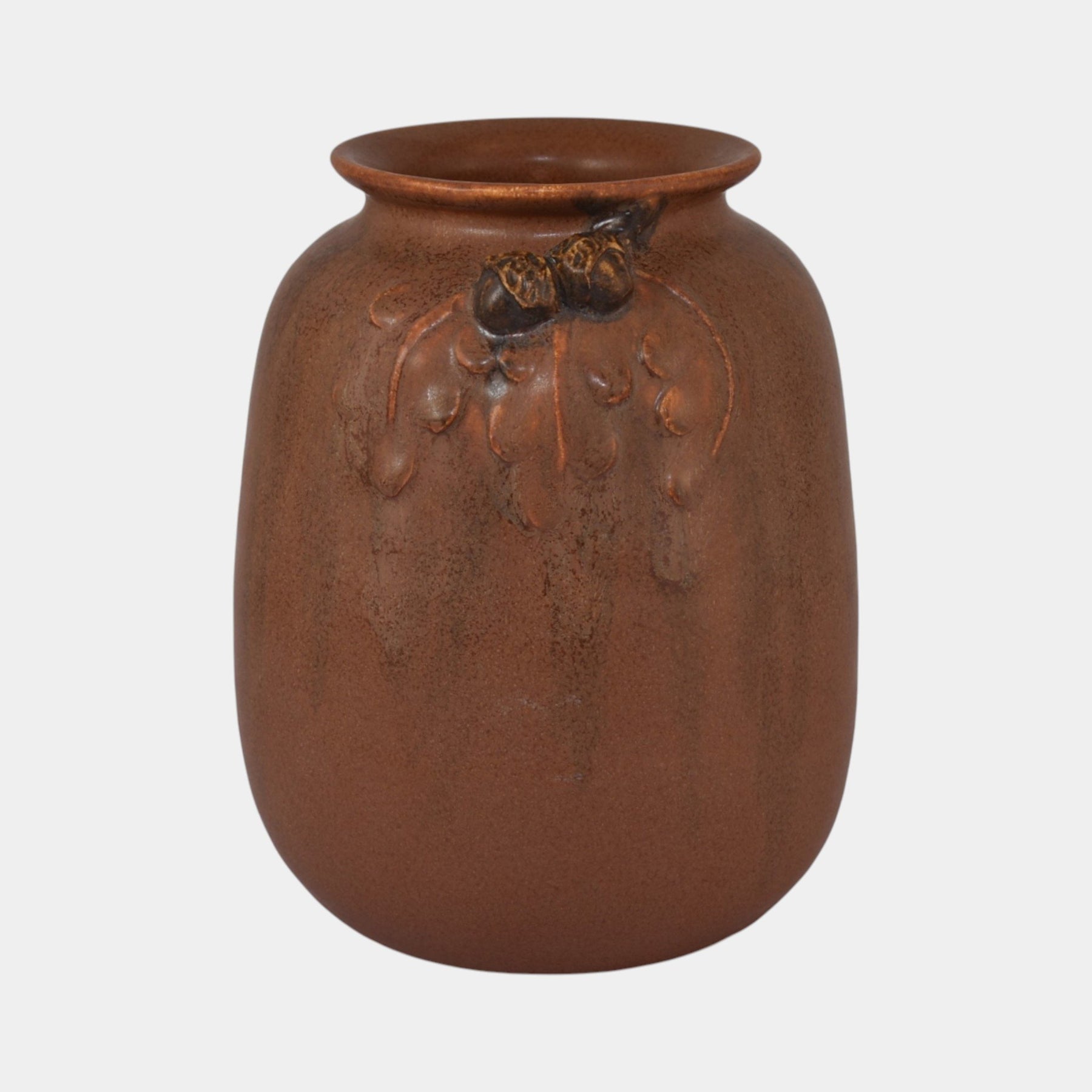 • This hand-made Ephraim Faience vase (shape 503) features a warm Mission oak brown glaze with subtle tonal variations. Sculpted acorn and oak leaf motifs emerge in relief near the shoulder, creating a classic Arts and Crafts design rooted in natural forms and traditional craftsmanship.