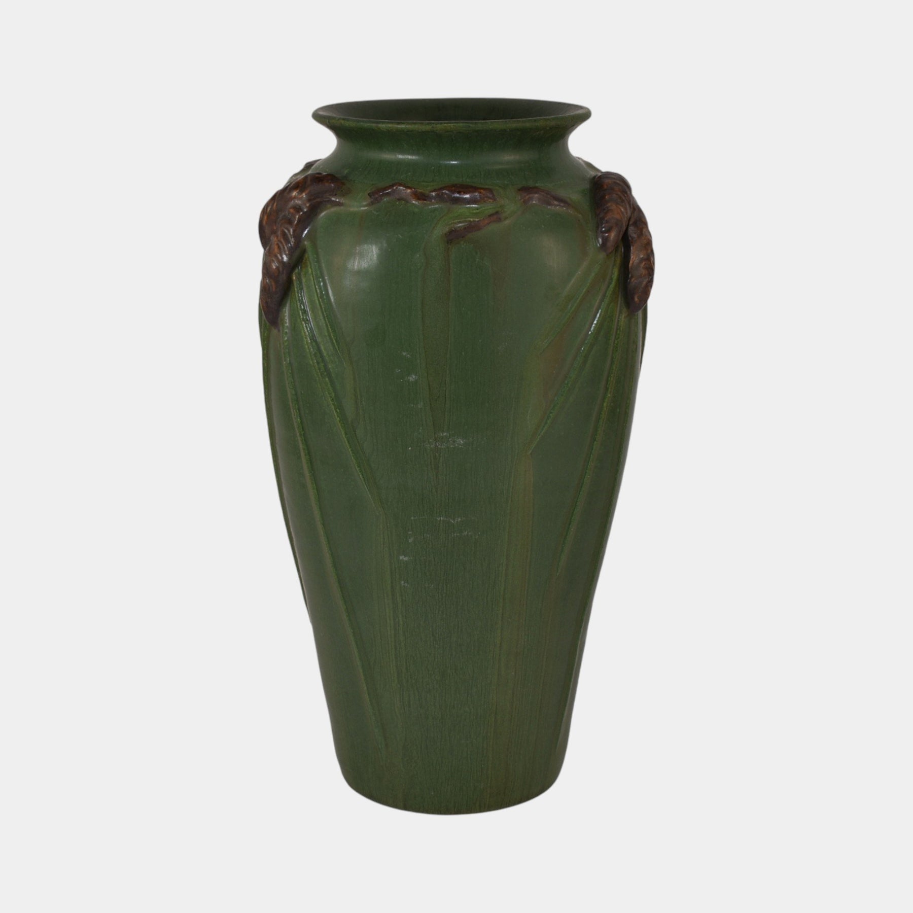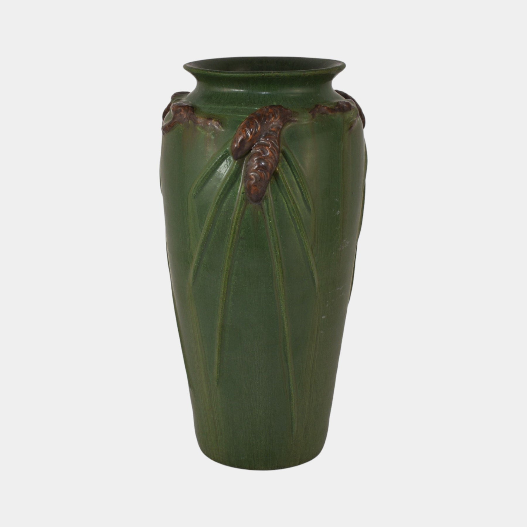 • Ephraim Faience Pottery White Pine vase, finished in a deep green matte glaze. The tall, elegant form is decorated with raised pinecone clusters and draping needle patterns descending from the shoulder, creating strong vertical movement. Hand-tooled detail and naturalistic modeling highlight Ephraim’s signature Arts and Crafts revival style.