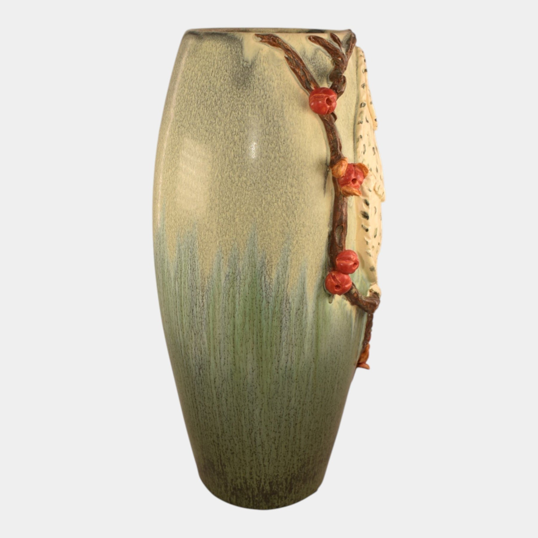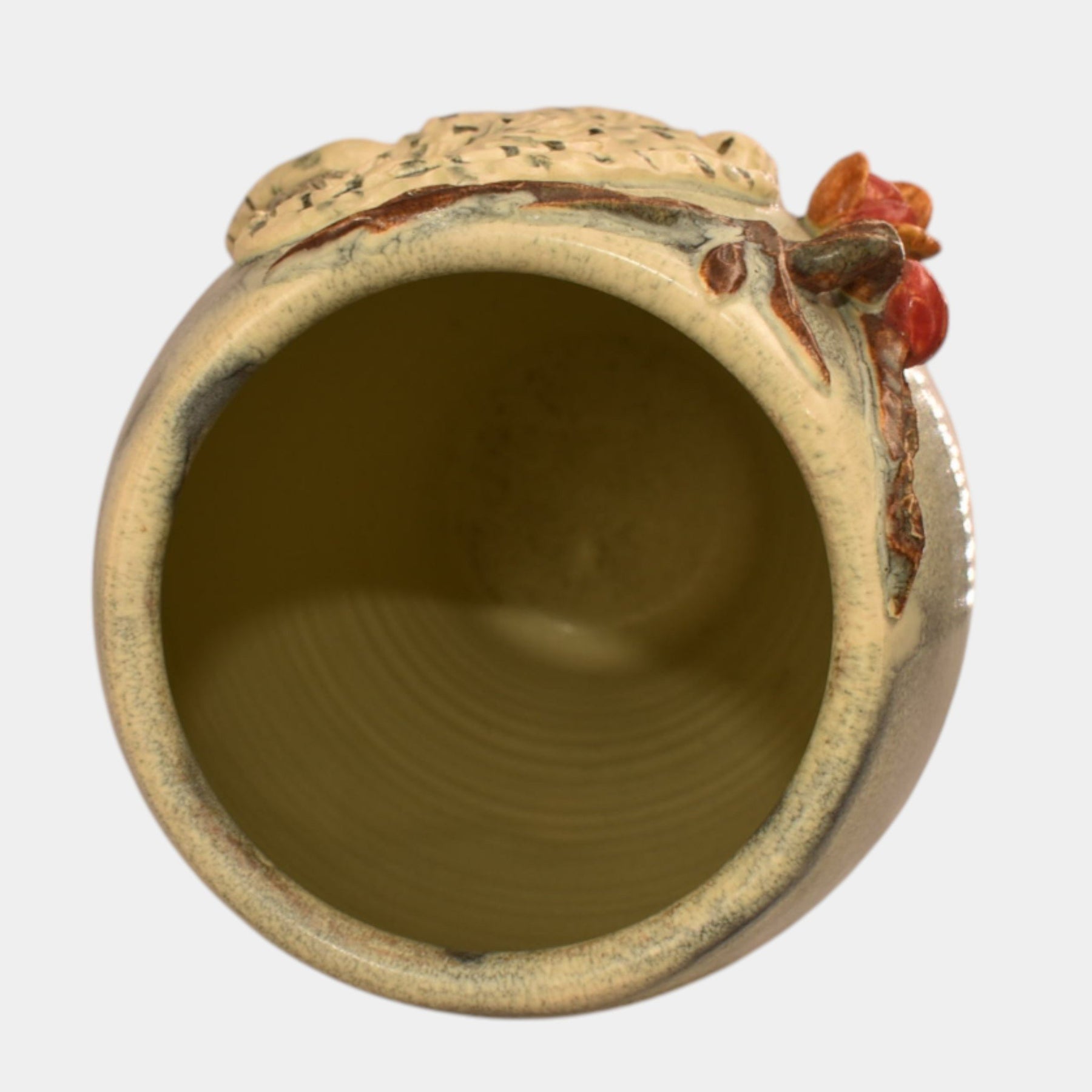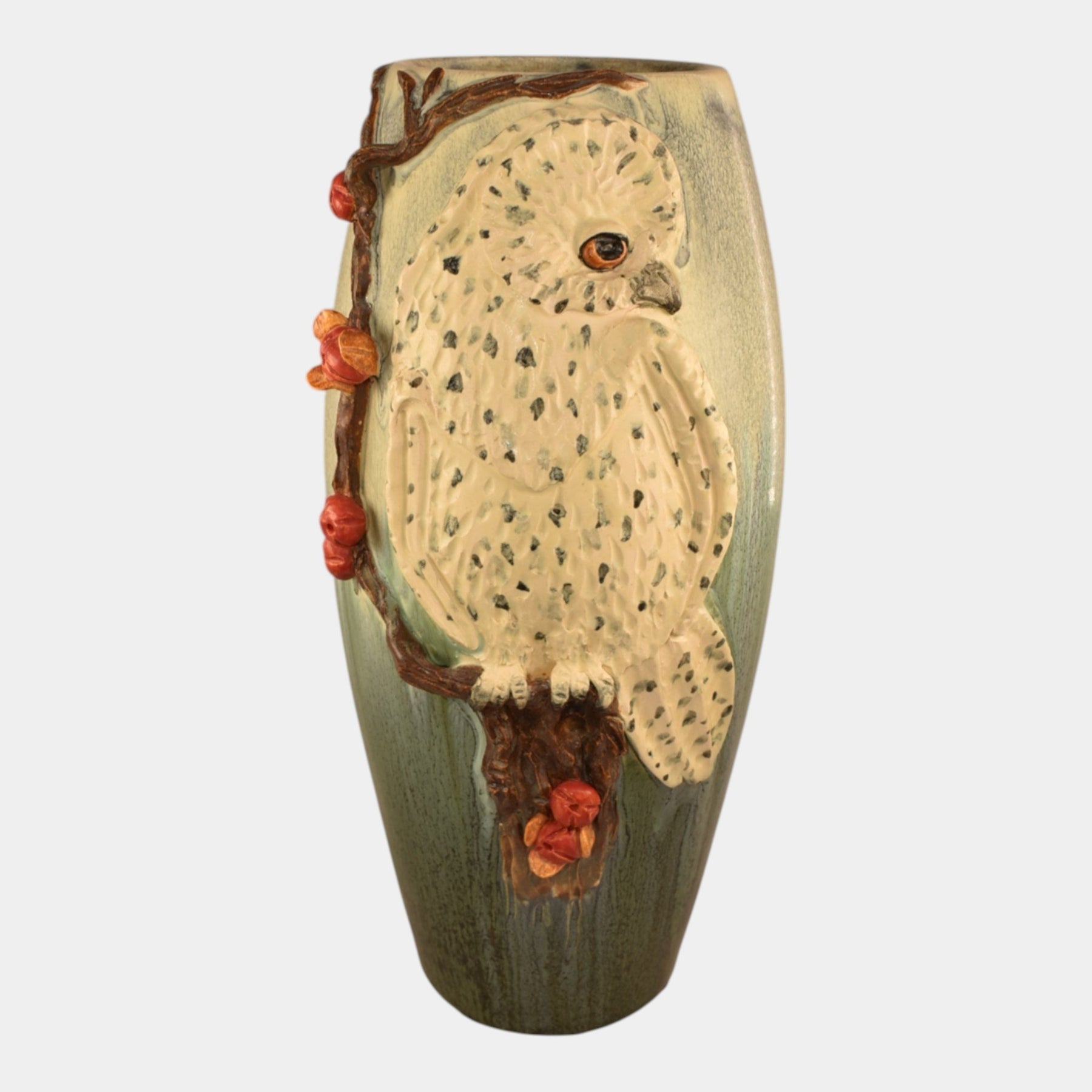 • One of a kind, limited edition vase featuring a large snowy owl on a branch with bittersweet.
