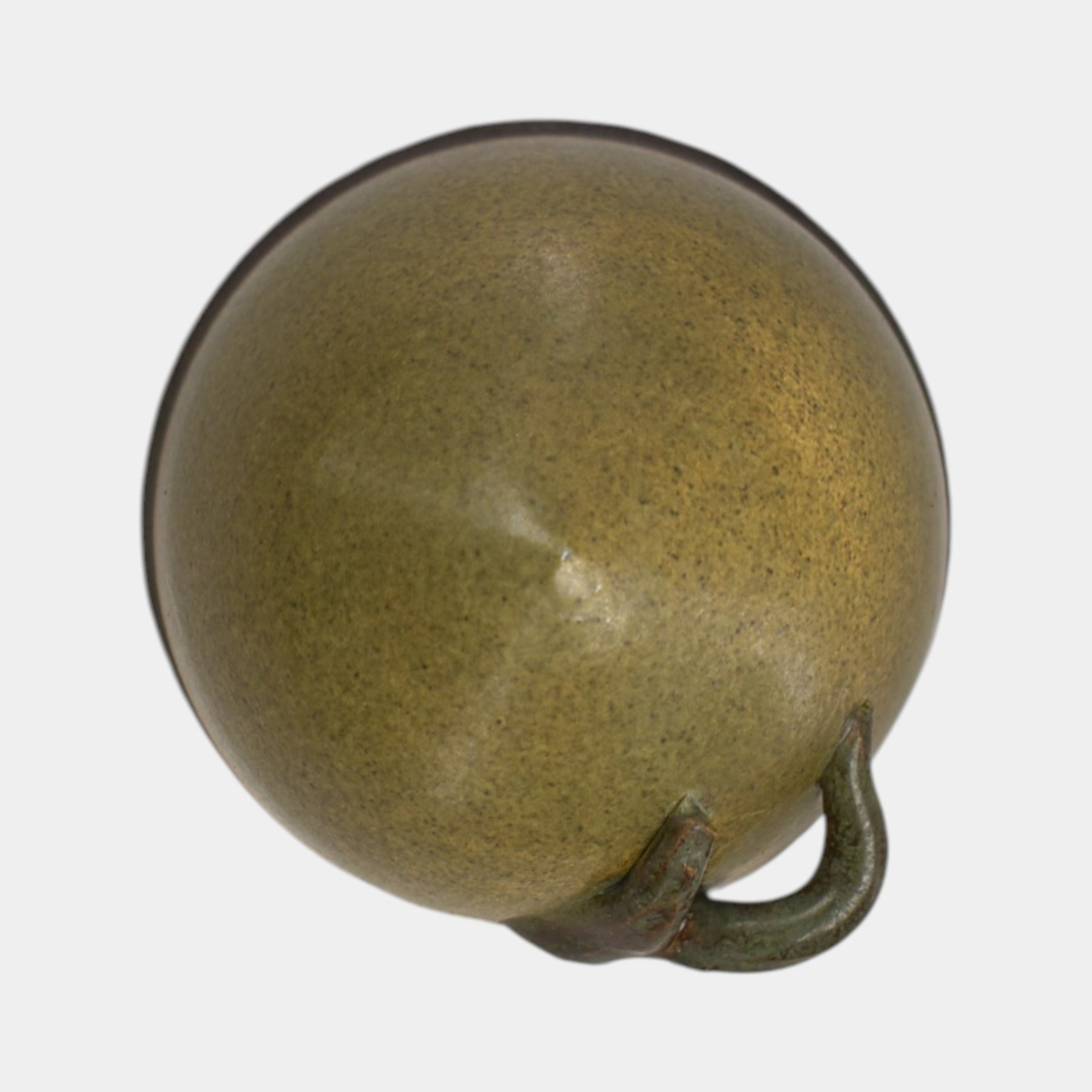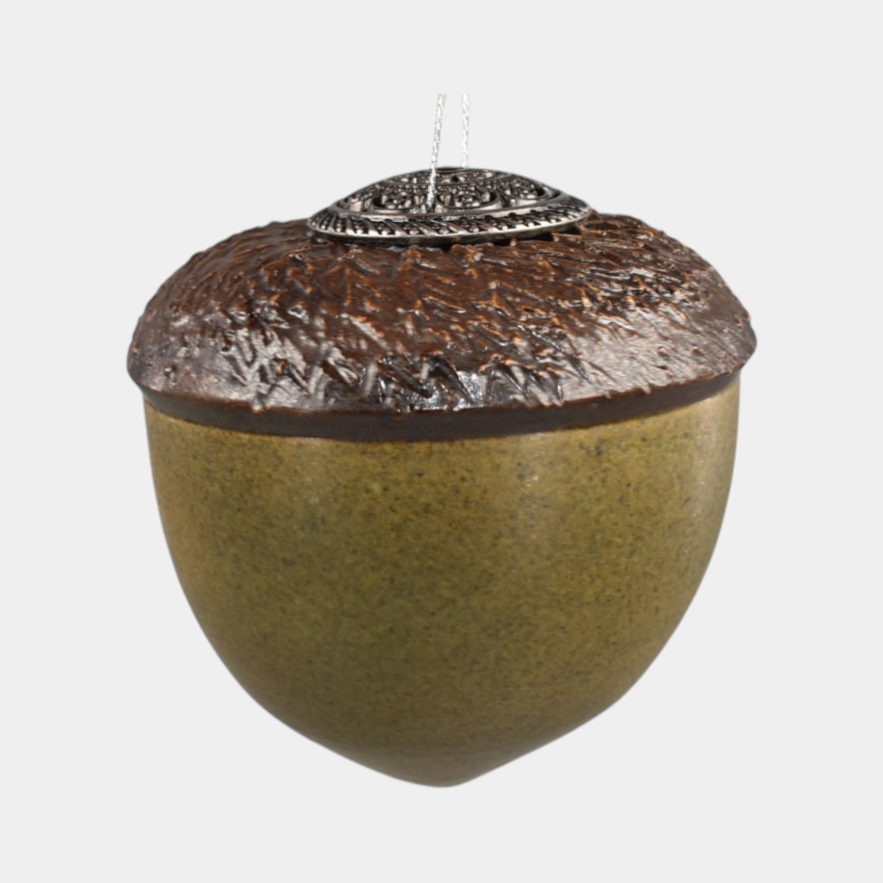 • This handcrafted green ceramic ornament by Ephraim Faience features a charming acorn-shaped birdhouse design with a textured cap and sculpted leaf detail. Earthy tones and fine craftsmanship reflect the studio’s signature Arts and Crafts influence, making it a whimsical and nature-inspired holiday accent.