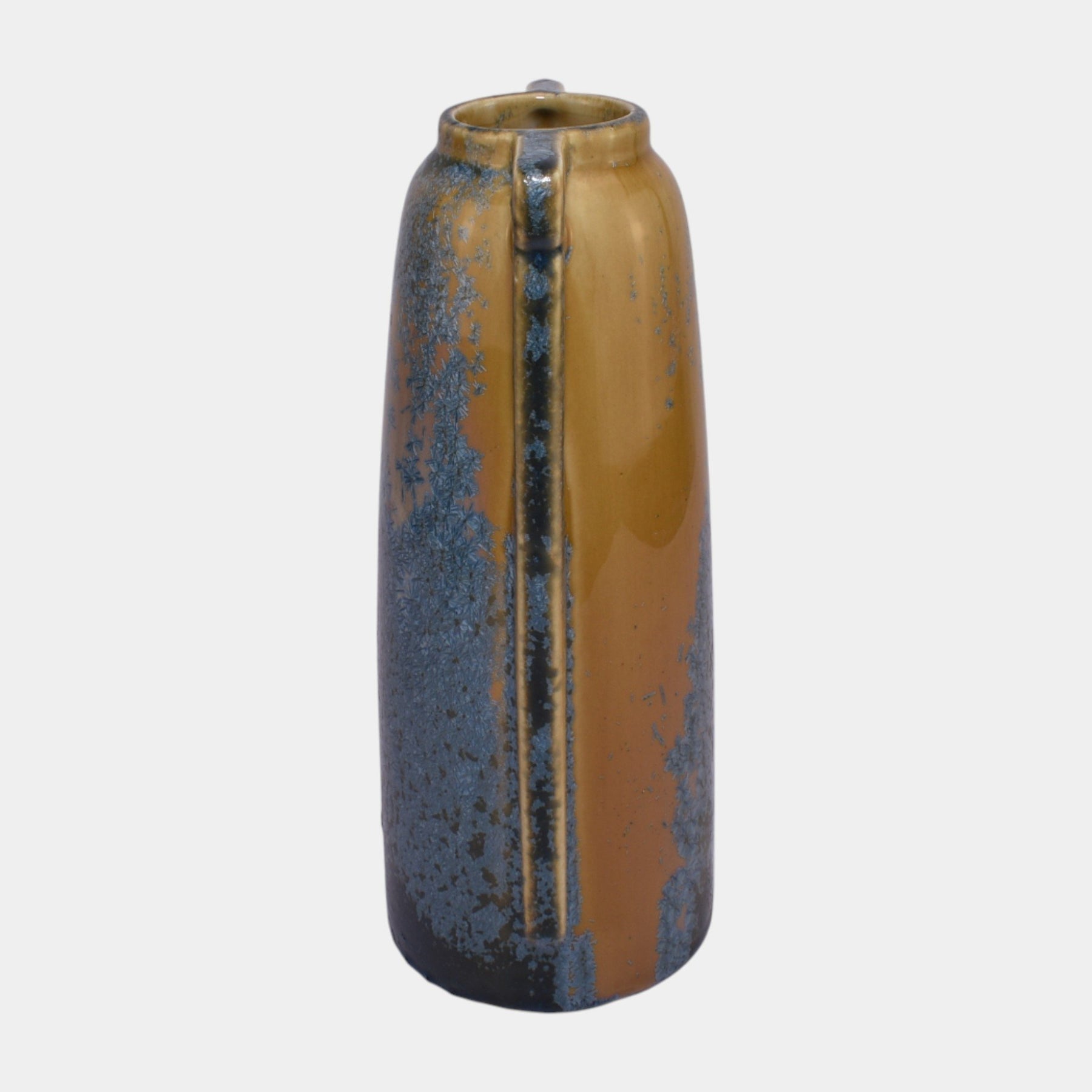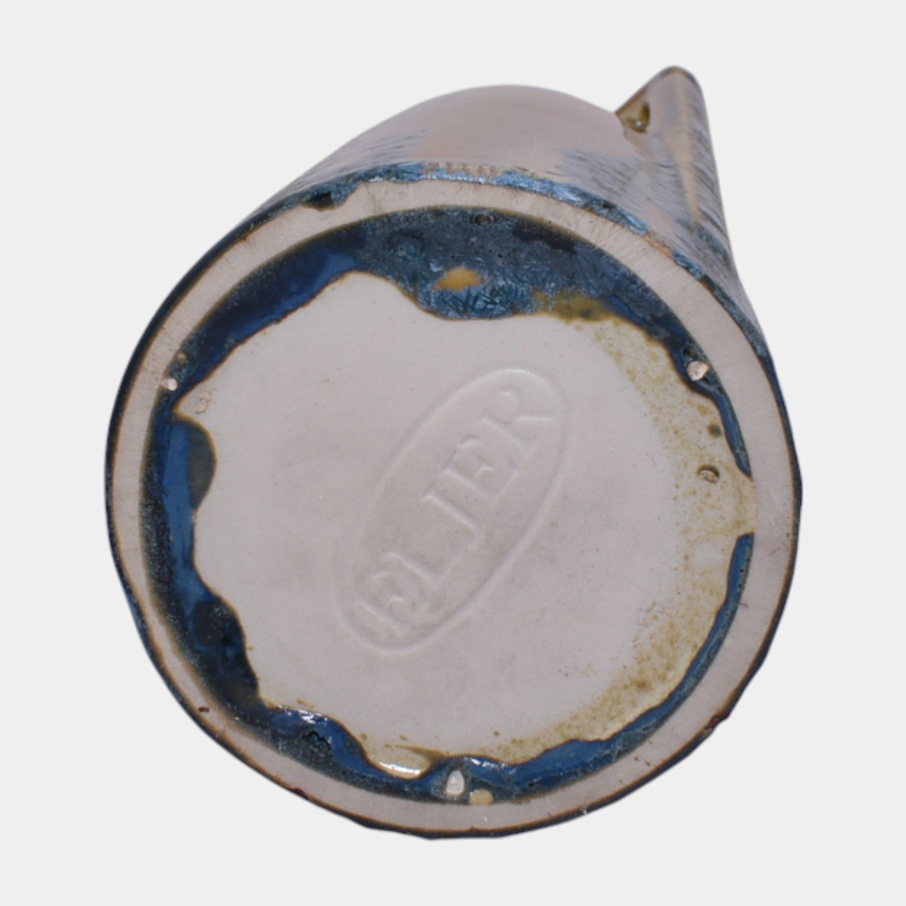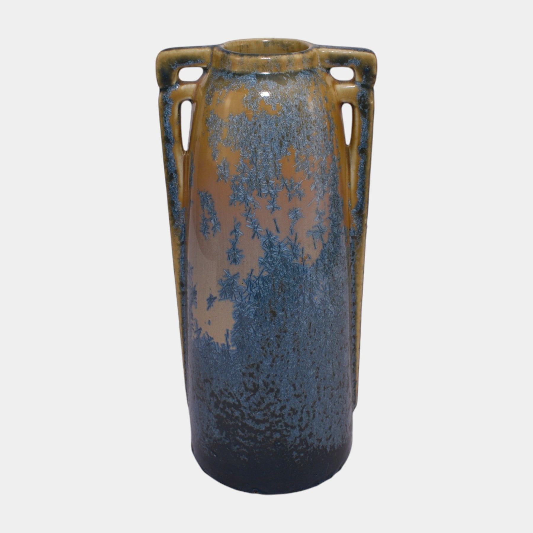 • Tall Arts and Crafts-era vase with pierced handles and a flowing crystalline glaze blending cobalt and ochre tones. A striking example of Eljer’s early art pottery craftsmanship.