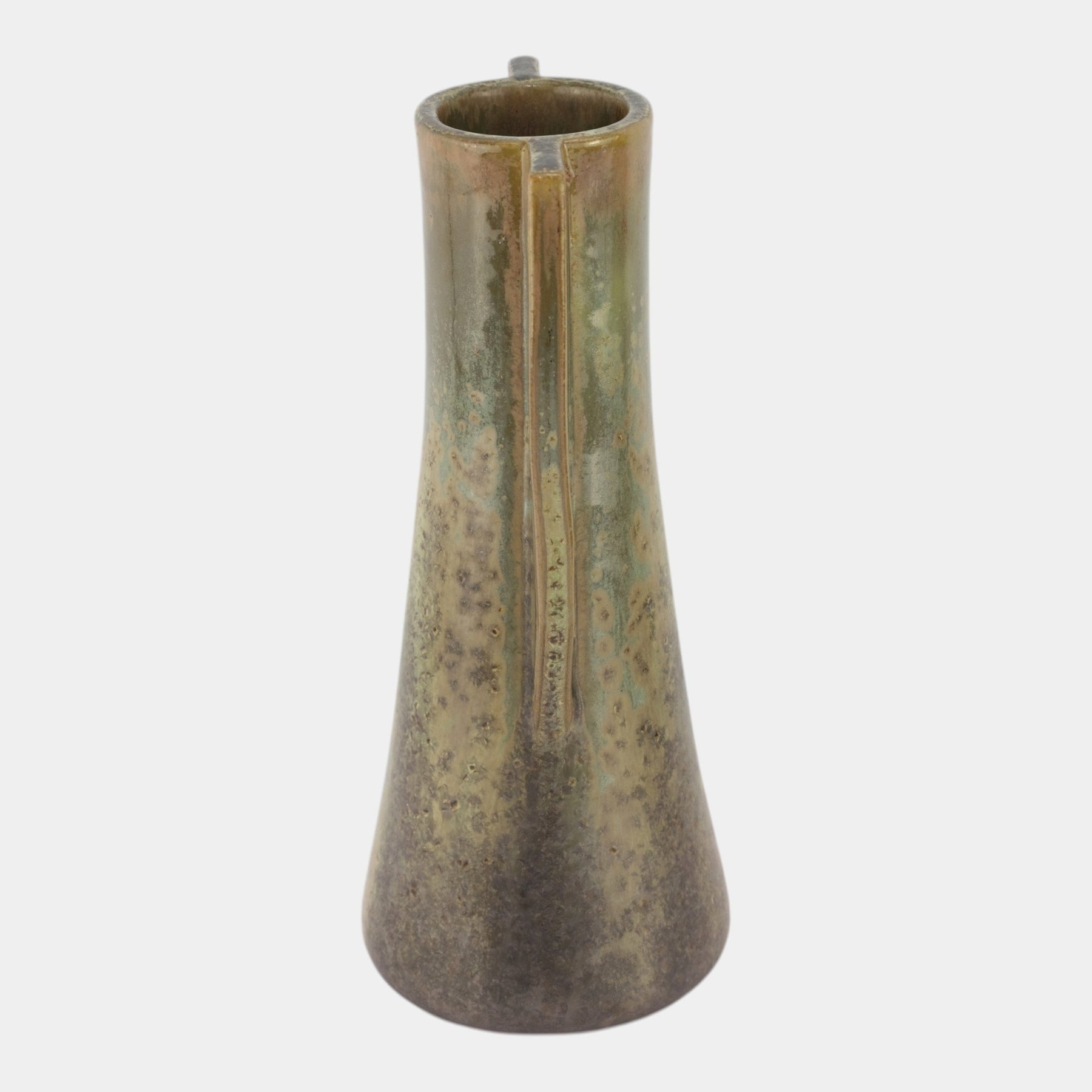 • Architecturally tapered and richly mottled, this handled vase features a green leopard skin glaze, its flaring base and rectangular strap handles reflecting the bold geometry of the Arts & Crafts movement.