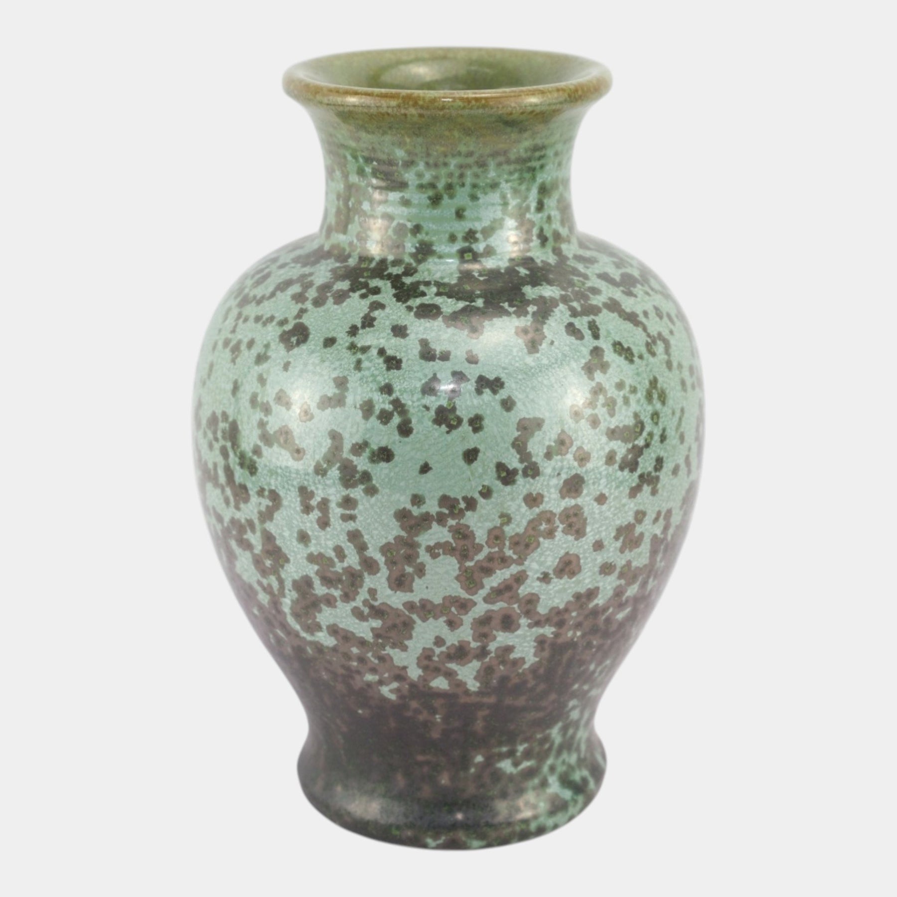 • Richly mottled ovoid vase finished in Fulper’s distinctive green leopard skin glaze with dark speckled patterning; the compact rounded form and tactile surface embody the organic, experimental spirit of Arts & Crafts pottery.