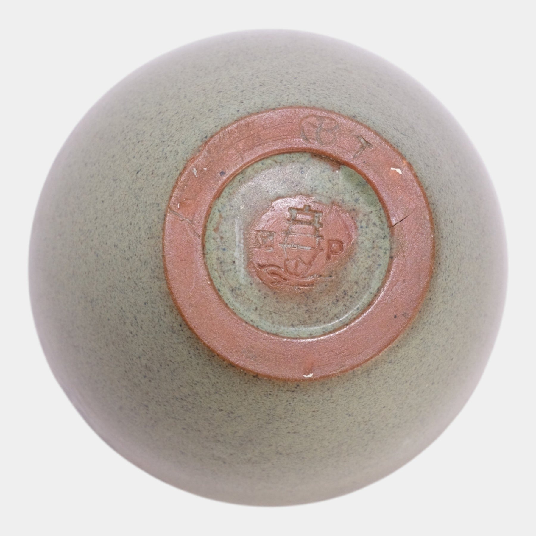 • This Marblehead Pottery vase, decorated by Arthur Baggs, features a speckled matte green-blue glaze with a painted floral motif. Its rounded Arts & Crafts form and subtle hand-applied decoration reflect classic early American studio pottery design.