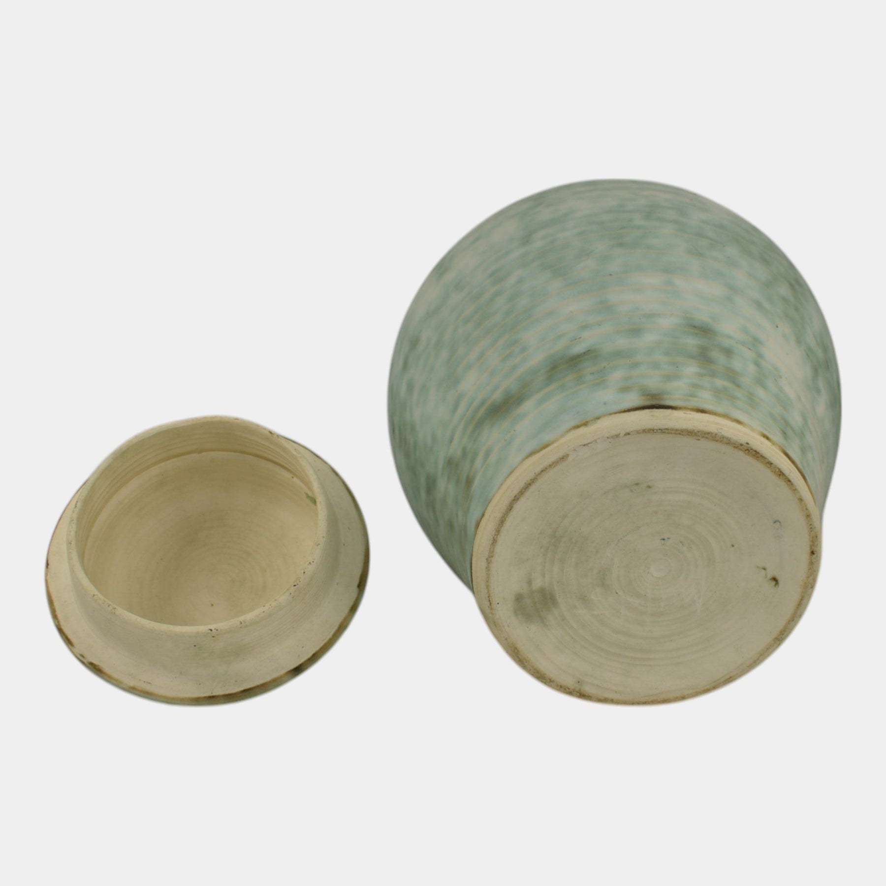 • Handmade by McCarty Pottery of Merigold, Mississippi, this classic lidded jar features the studio’s signature jade green glaze with soft tonal variations and a semi-matte finish. The form is gracefully thrown with a rounded shoulder and fitted lid, topped by McCarty’s distinctive frog finial, symbolizing good luck and transformation.
