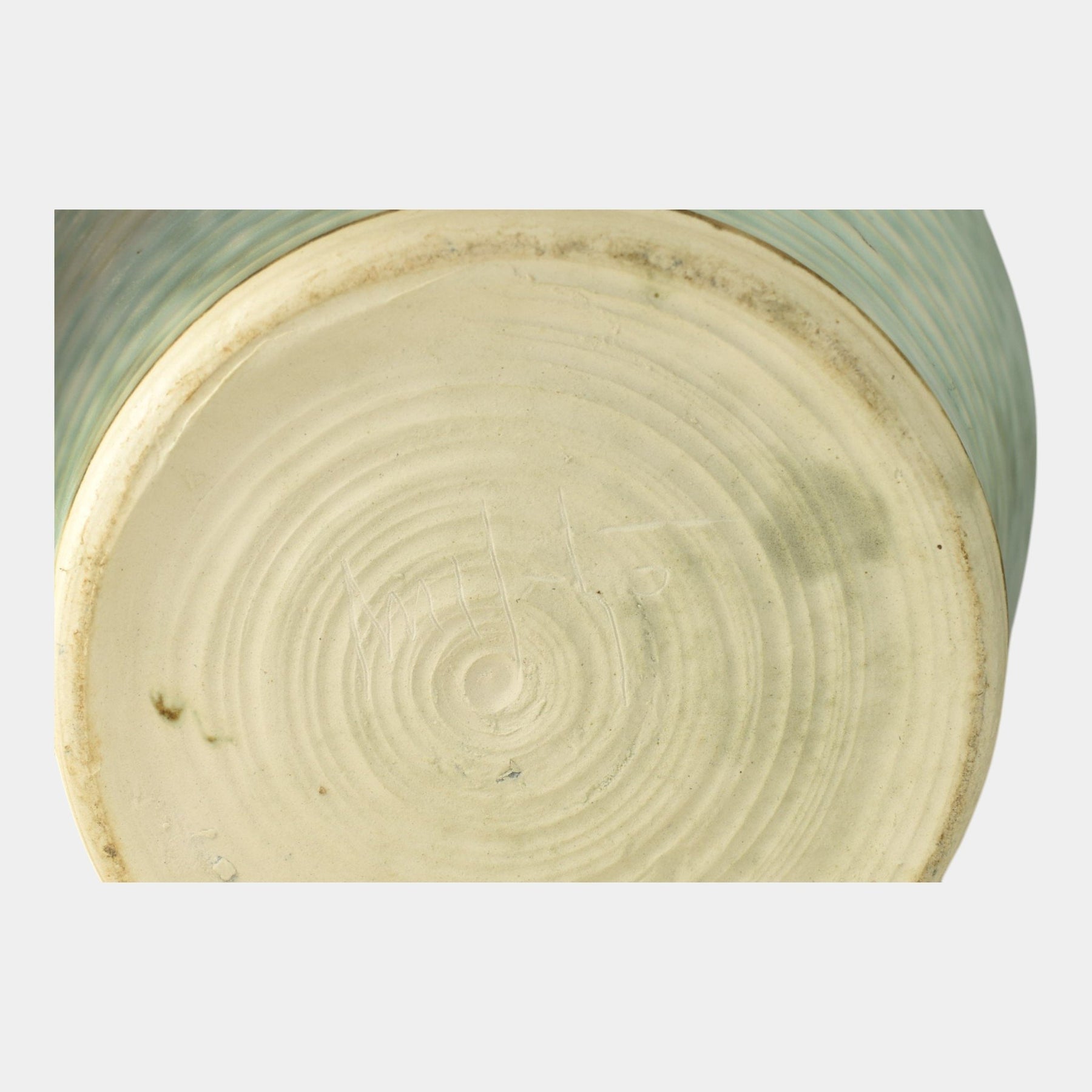 • Exceptional example of the jade green, mottled glaze and "river mark" symbol known in McCarty Pottery.