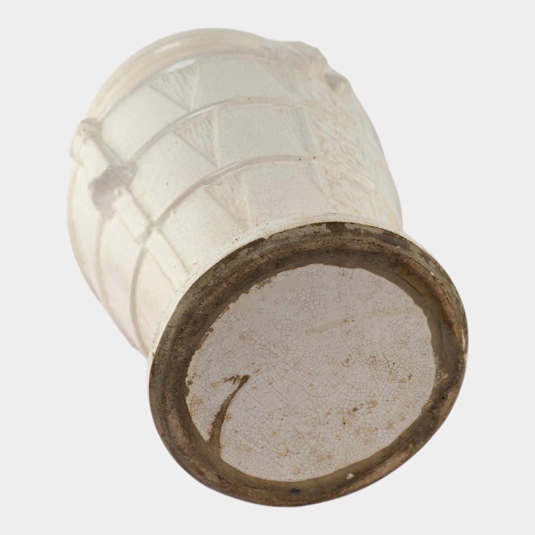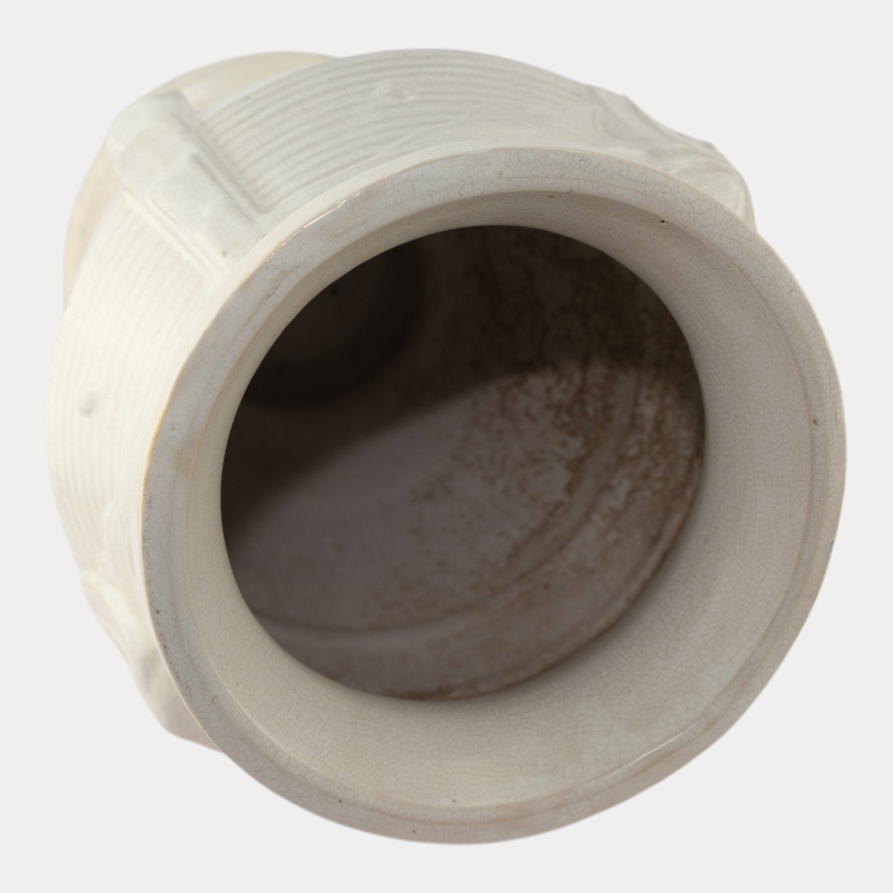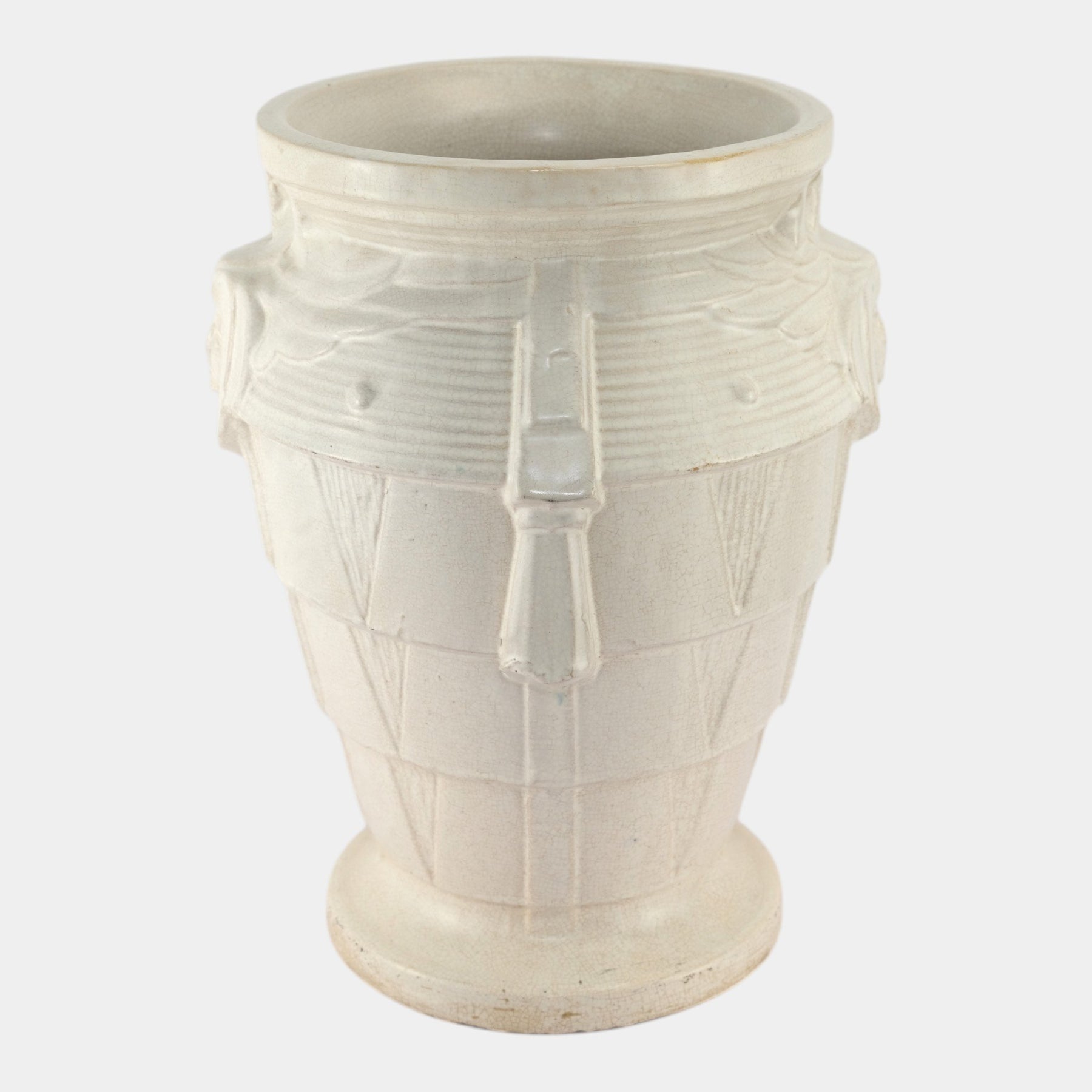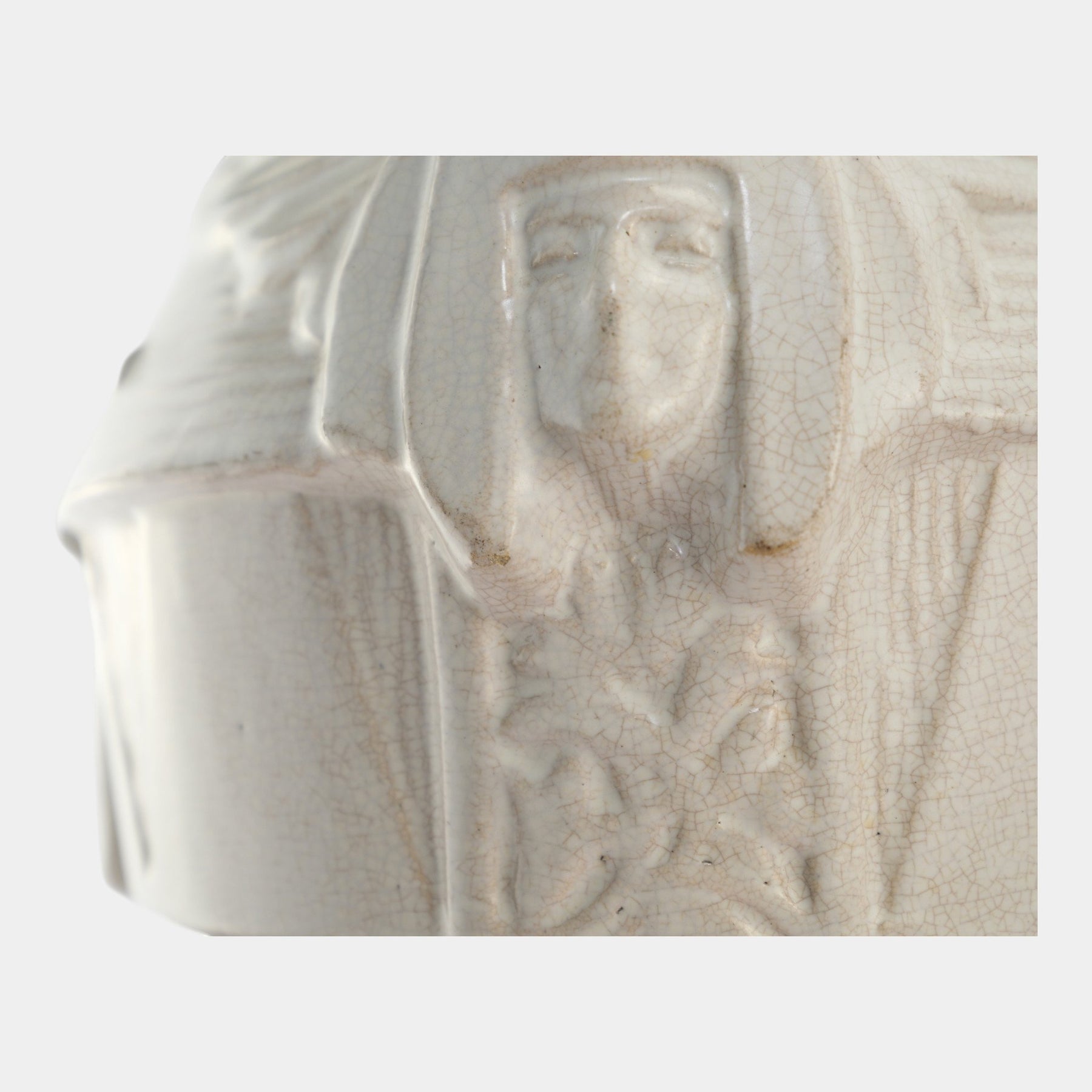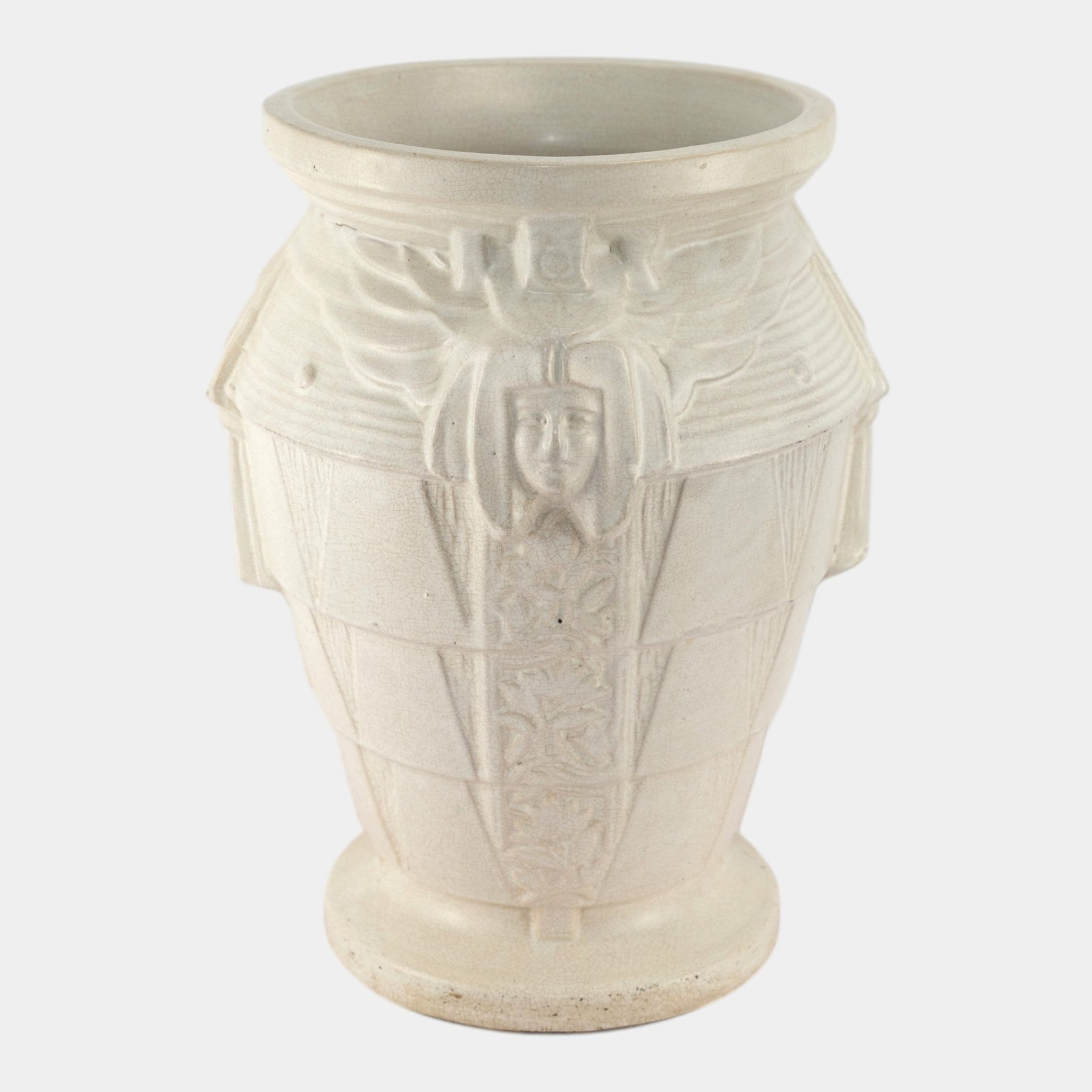• Boldly molded and crisply detailed, this 1930s McCoy vase features Egyptian Revival sphinx and pharaonic motifs in matte white, its angular Art Deco form reflecting the era’s fascination with ancient design.