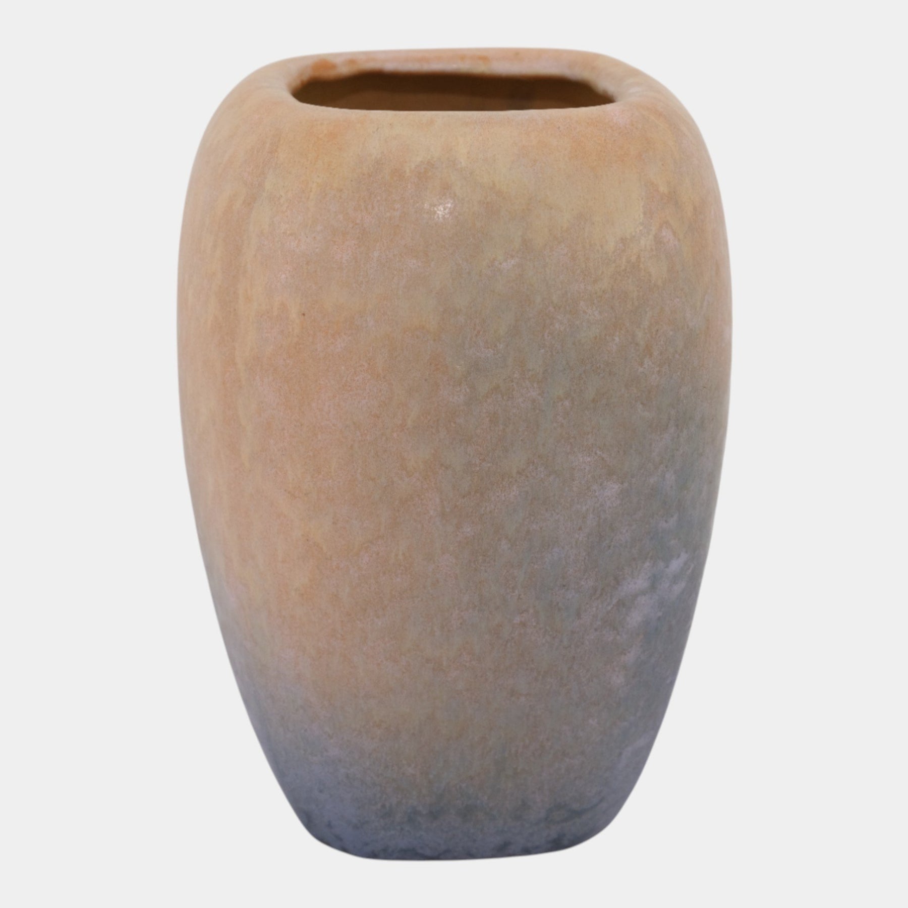• Warmly muted and softly contoured, this Arts & Crafts Roseville Earlam vase features a tall ovoid form with a narrow rectangular mouth, finished in blended matte tan and blue-green glazes that emphasize subtle surface texture and early Roseville simplicity.
