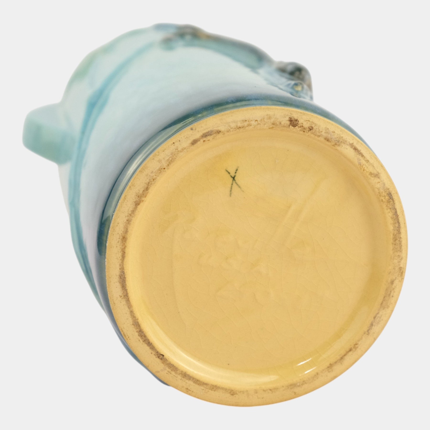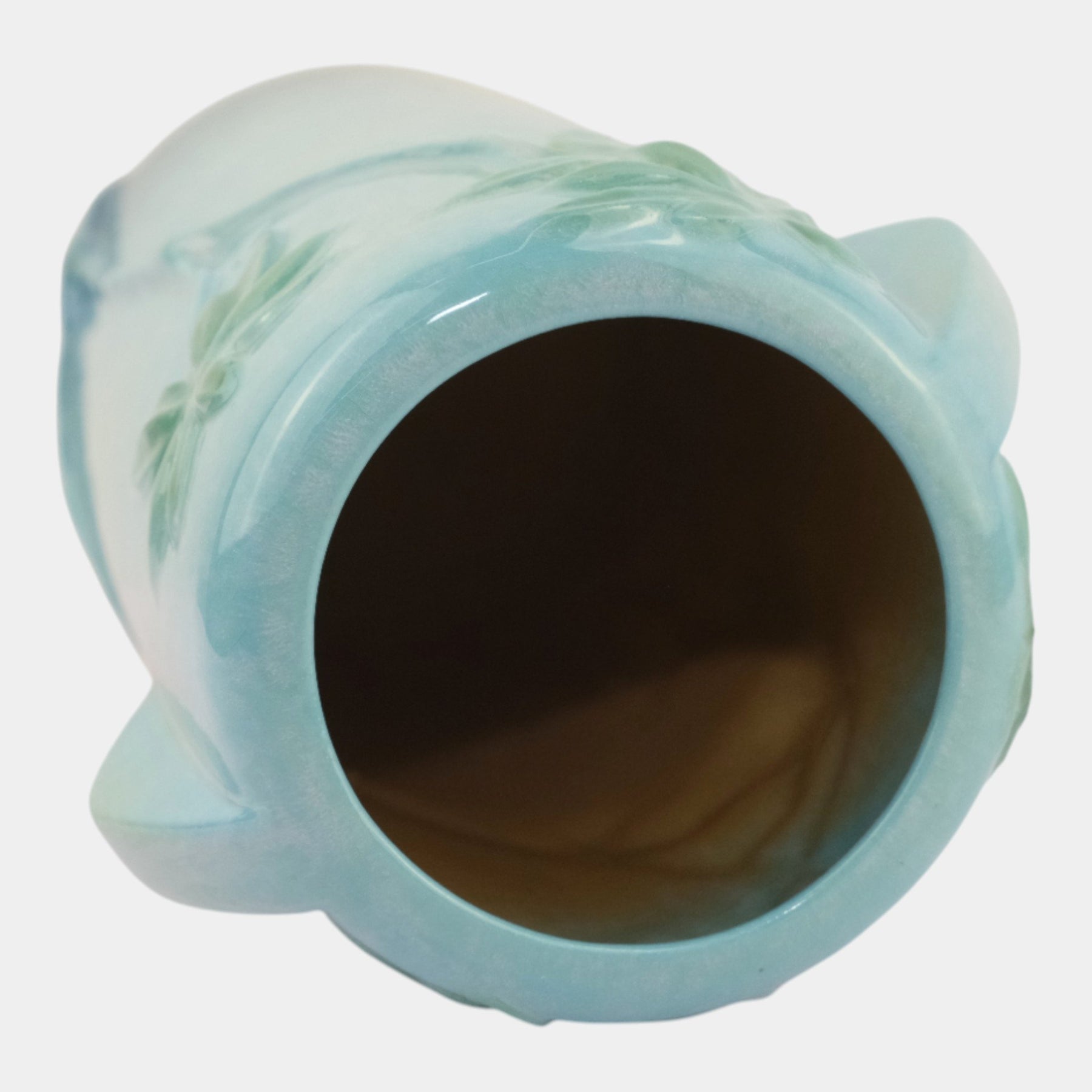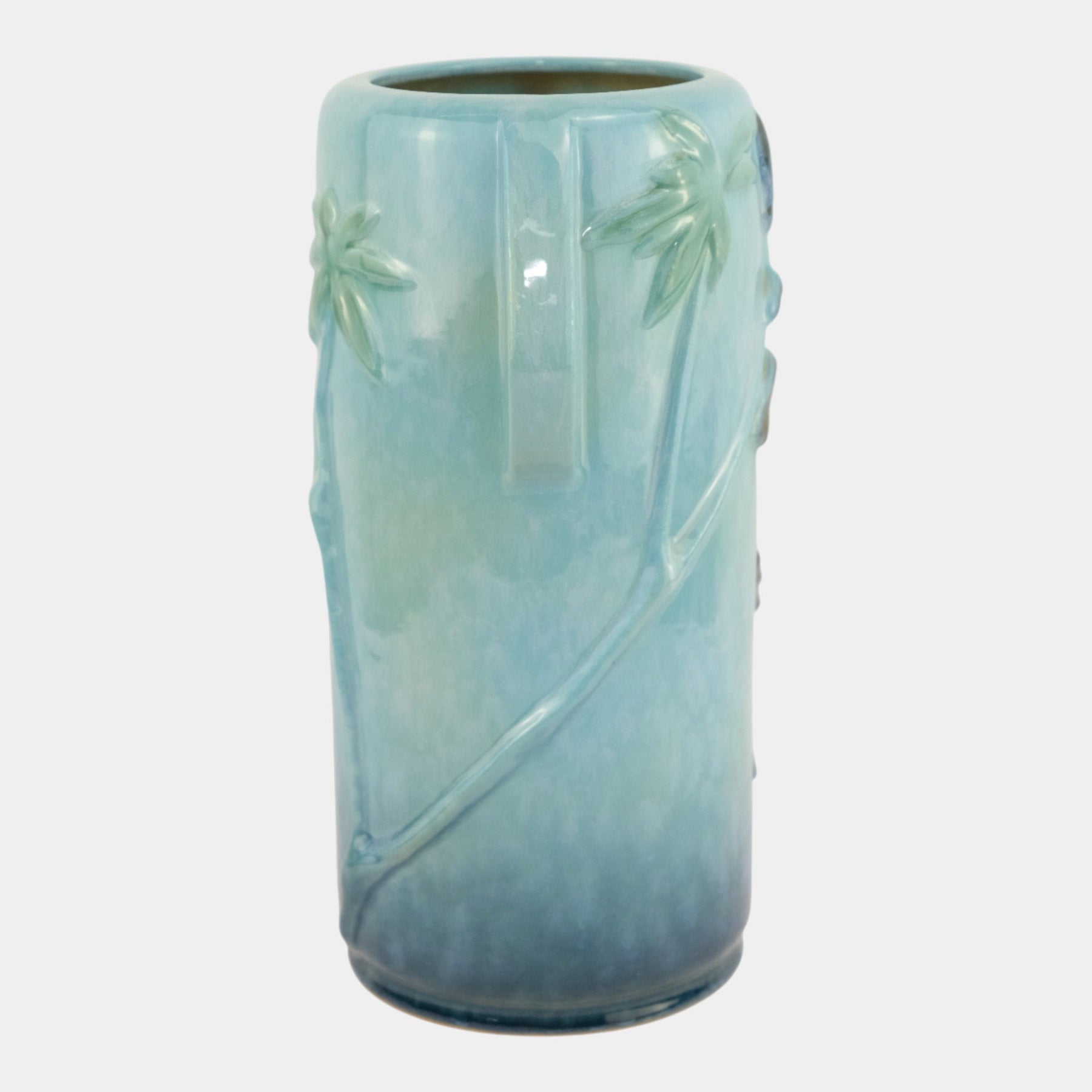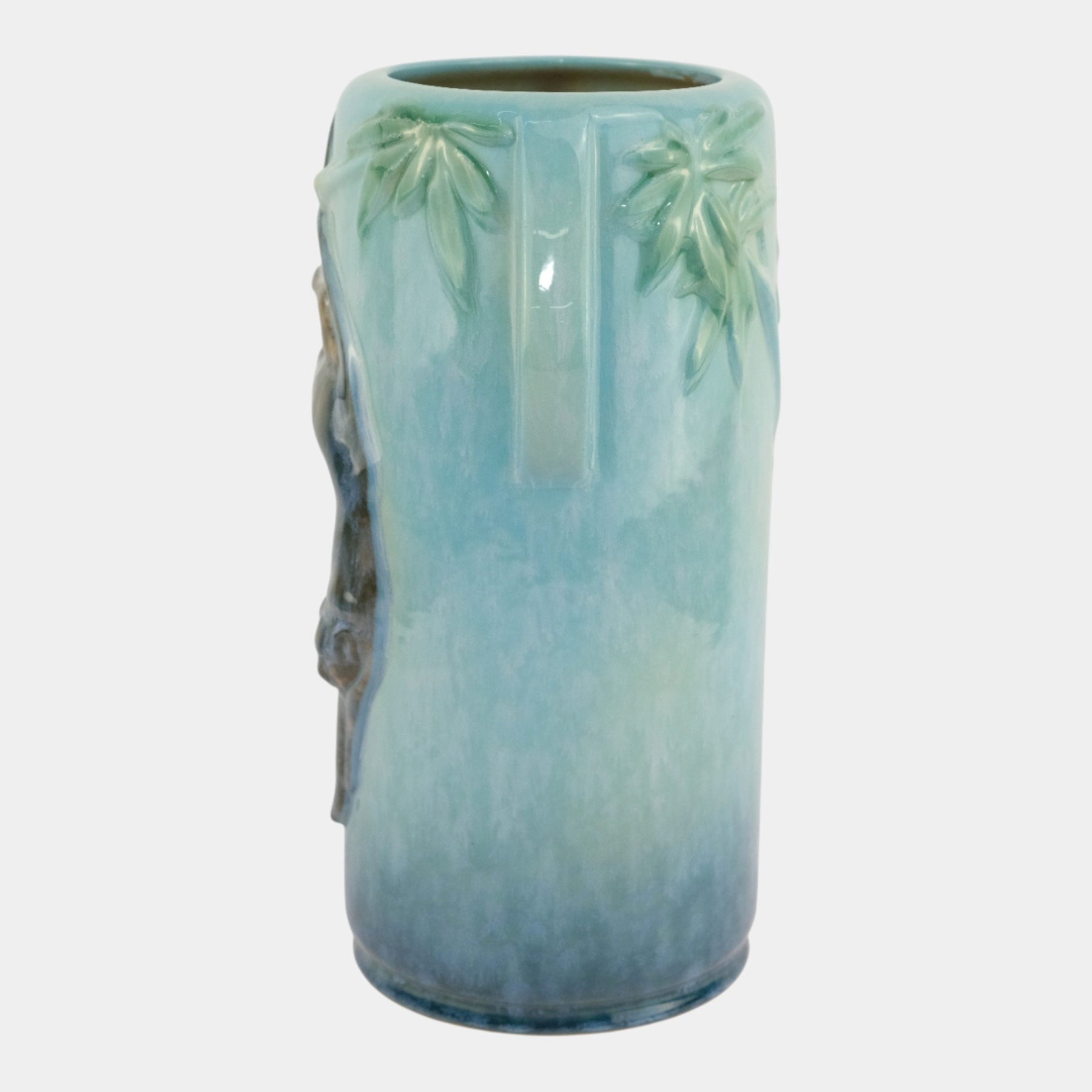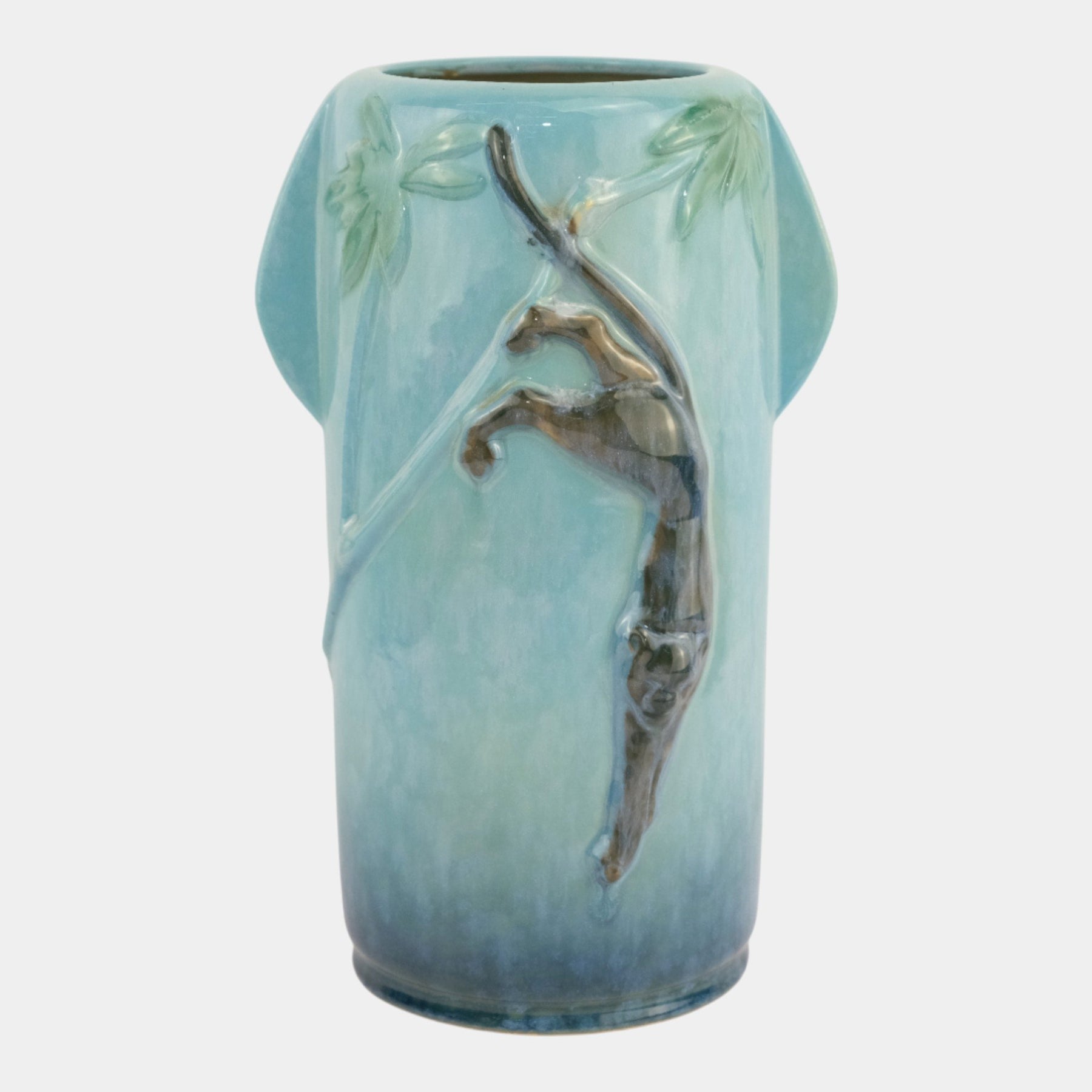 • A striking example of mid-century American art pottery, this Roseville Wincraft vase features a modeled black panther climbing a raised tree branch against a soft blue and aqua glaze that deepens toward the base. The high-relief panther motif, crisp detailing, and rounded flared rim highlight Roseville’s shift toward modern, sculptural designs of the late 1940s.