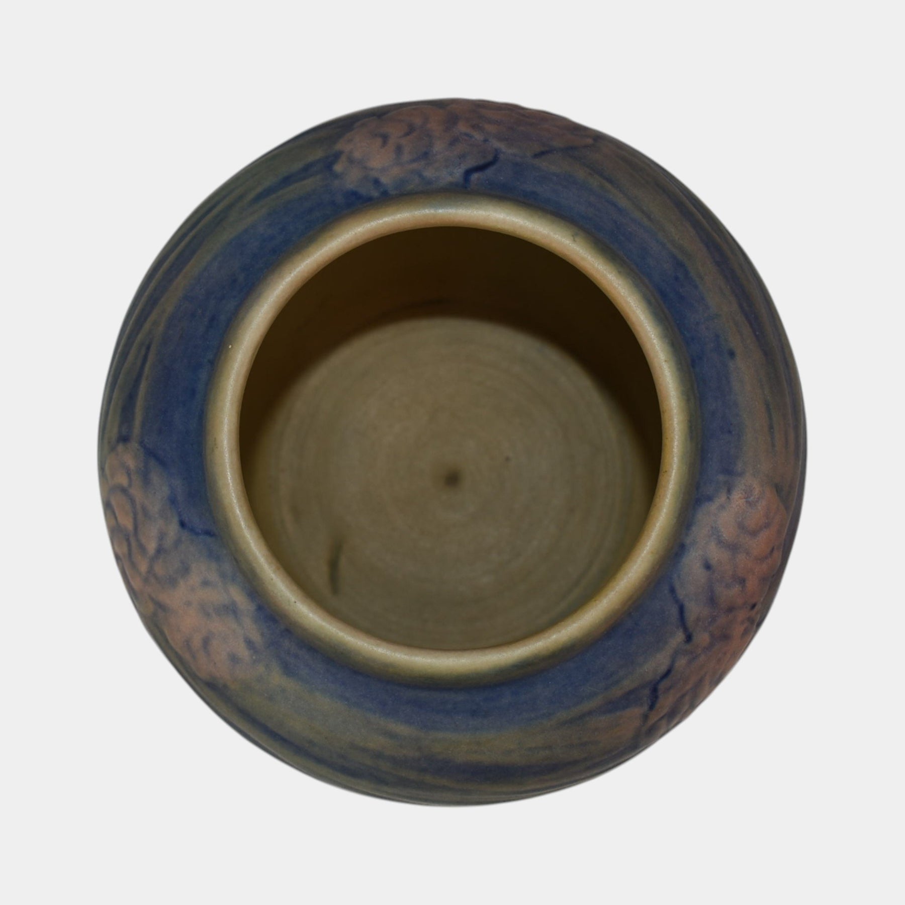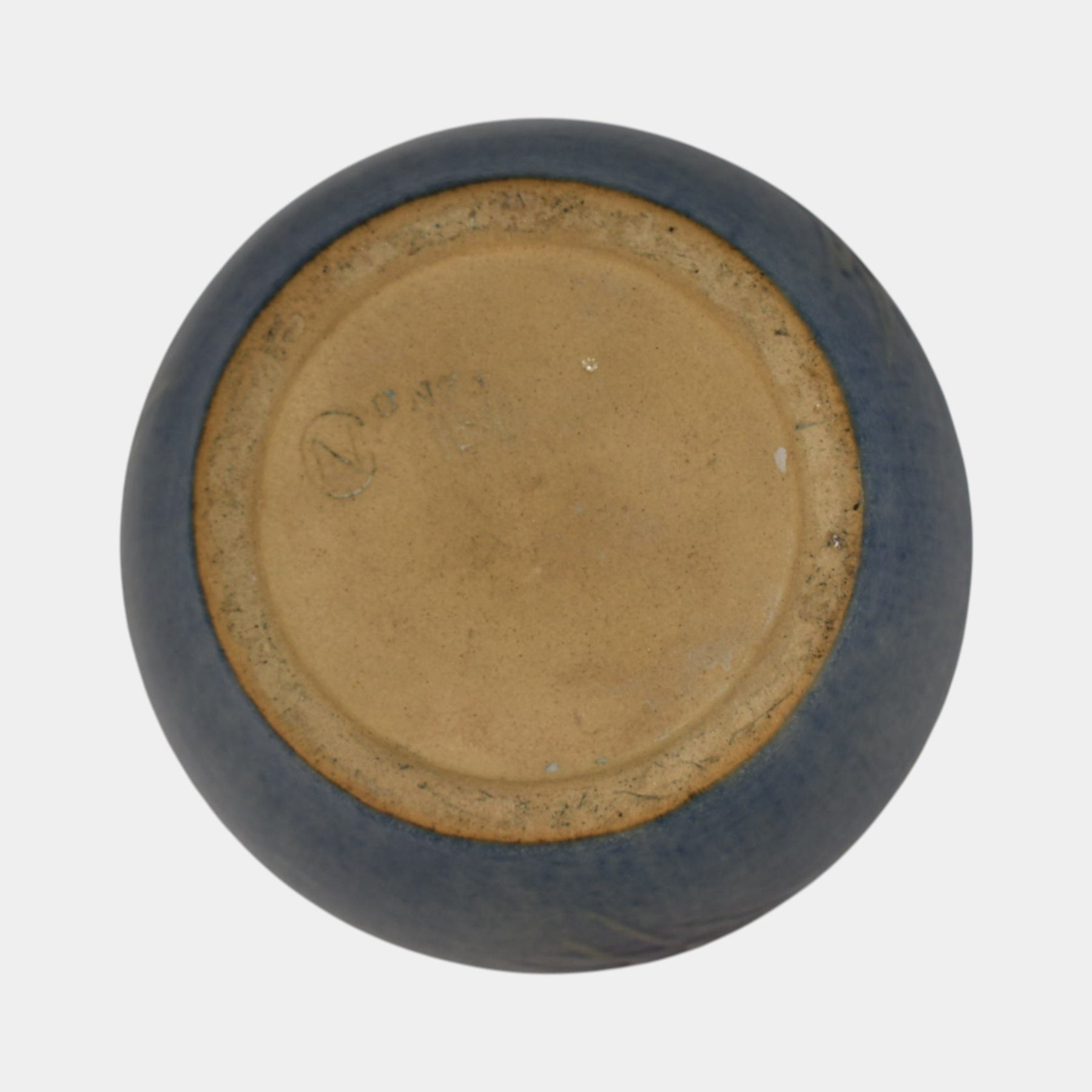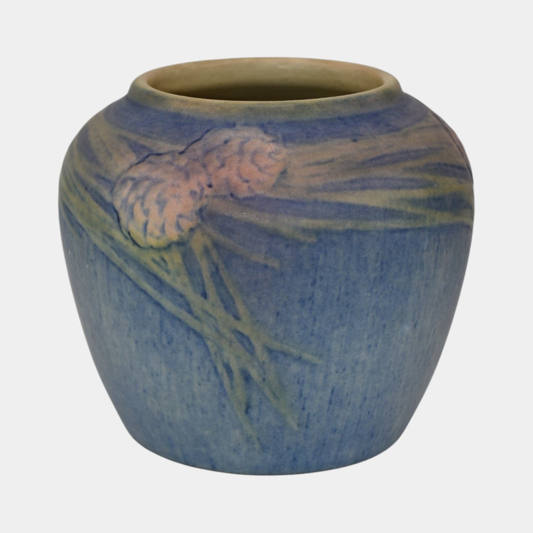 • Beautiful 1933 Newcomb College pottery vase decorated by Henrietta Bailey with softly rendered pine cones and needles in shades of cream and green against a mottled matte blue ground. The rounded form and naturalistic decoration reflect the school’s dedication to Southern flora and the Arts and Crafts ideal of hand-crafted beauty. A fine and collectible example of Newcomb’s artistry from the early 20th century.