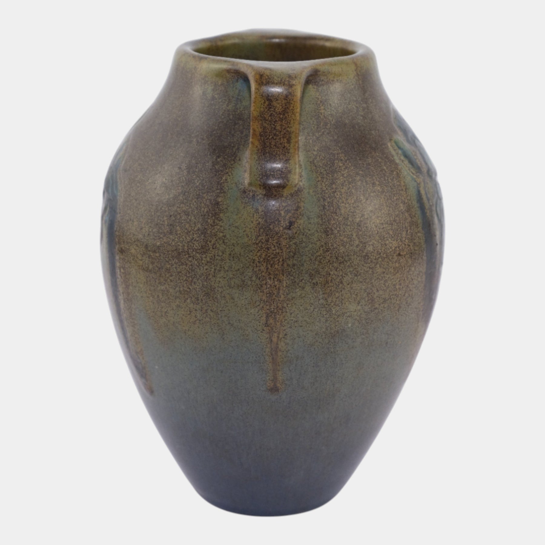 • Elegantly modeled and softly organic, this Arts & Crafts Rookwood vase features a rounded baluster form with twin loop handles and a raised floral motif, finished in a richly mottled brown and blue-green glaze with flowing highlights. Decorated by Charles Todd in 1914.