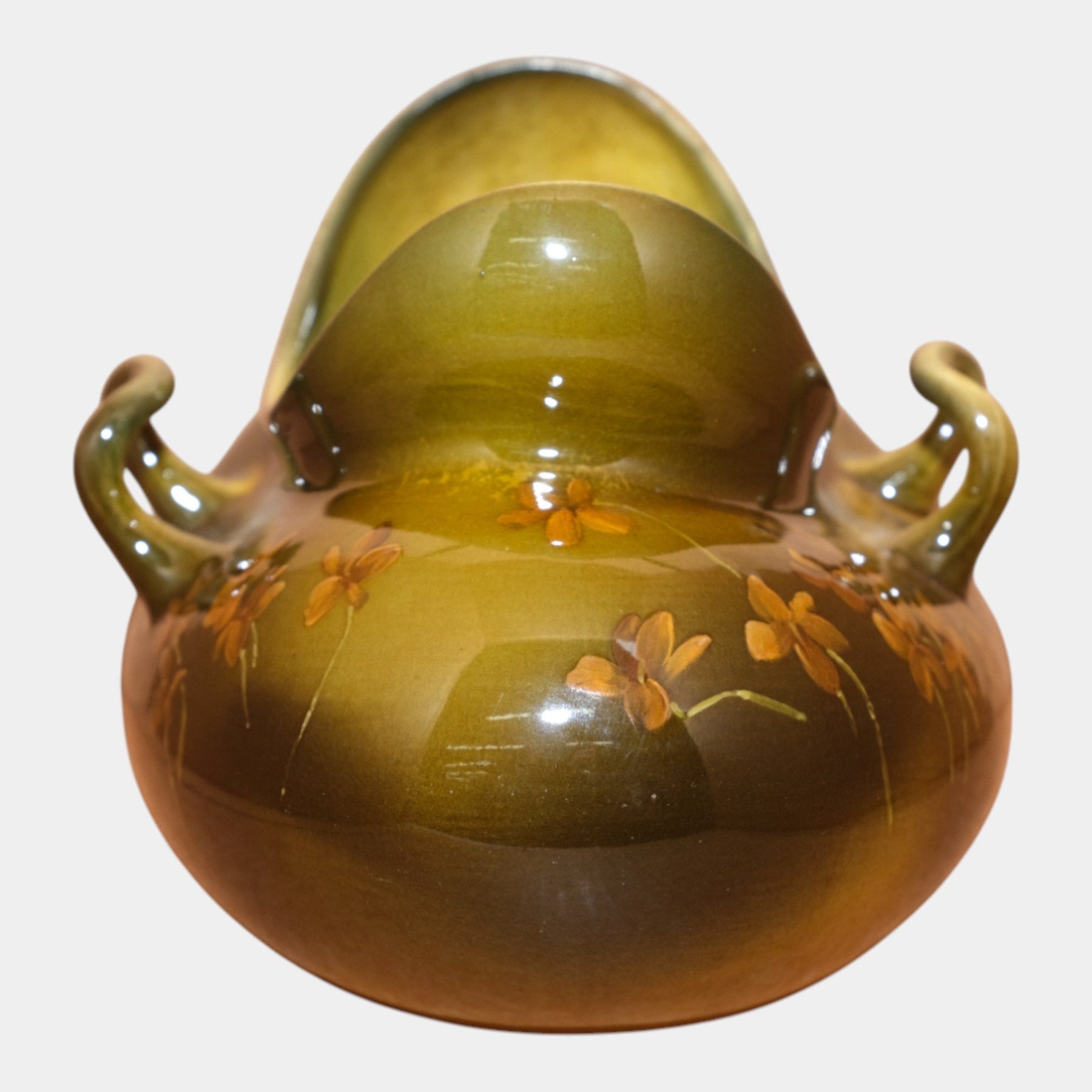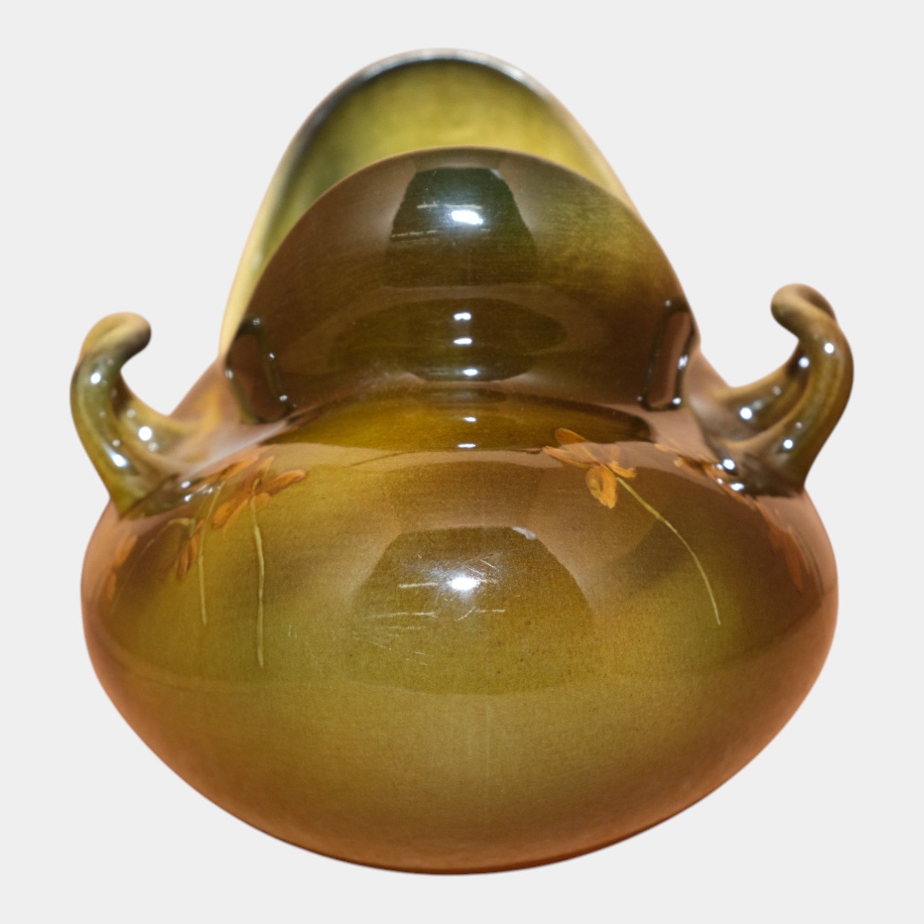 • Richly shaded in green and brown tones, this Rookwood vase features delicate hand-painted orange blossoms. Its unusual split-rim form and small loop handles give it a distinct Arts and Crafts character. Decorated by Edward Abel in 1893.