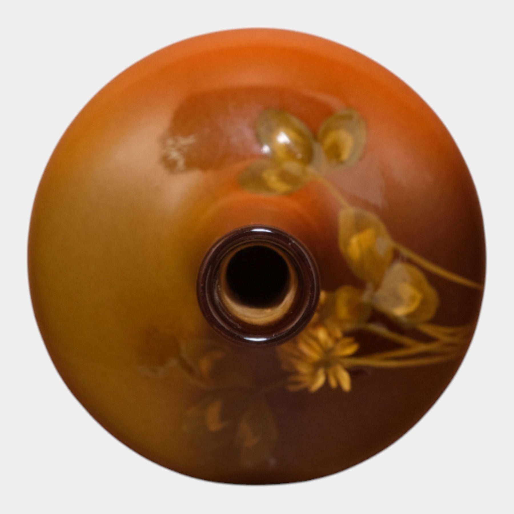 • Warmly shaded and beautifully hand-painted, this Rookwood Standard Glaze bottle vase features delicate yellow blossoms drifting across its rich brown-to-amber ground, echoing elegant late Victorian/Art Nouveau naturalism. Decorated By Edith Felton in 1899.