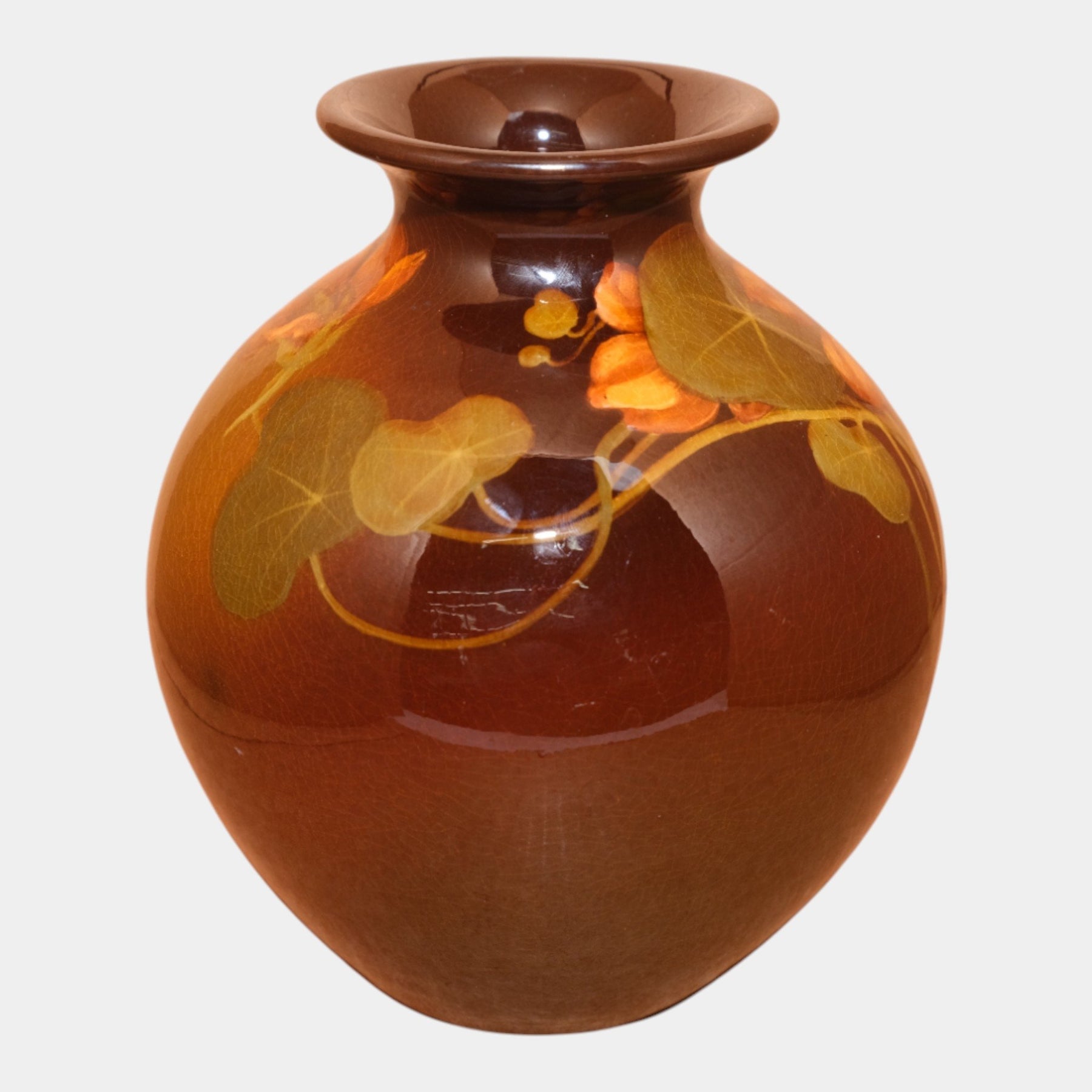 • Rich brown glaze highlights this rounded Rookwood vase, decorated with warm orange blossoms and trailing leaves. Its classic form and soft hand-painted detailing reflect refined early 1900s craftsmanship. Decorated by William Klemm in 1900.